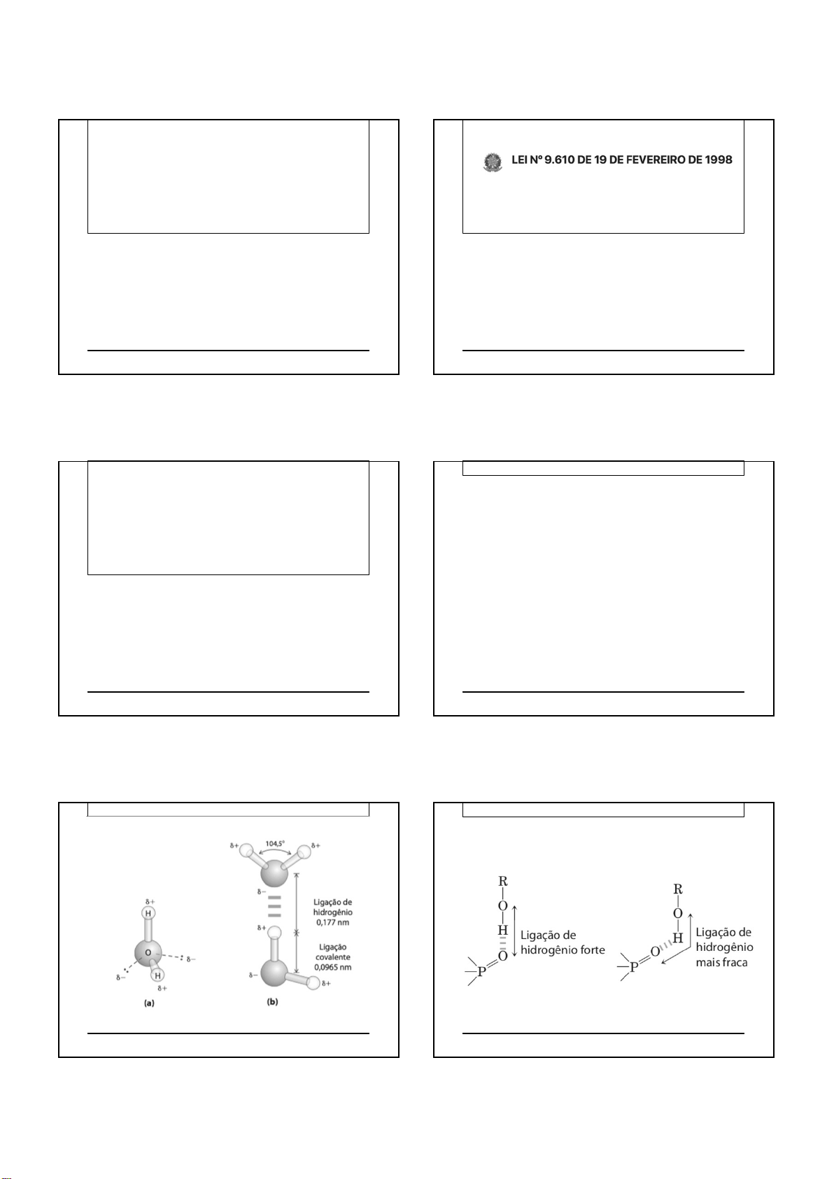31/03/2025 INTRODUÇÃO À BIOQUÍMICA ADVERTÊNCIA “Os materiais (imagens, áudios e textos) veiculados nesta aula são protegidos por Direitos Autorais e de Imagem. Nenhuma parte desta vídeo-aula pode ser copiada , reproduzida, apresentada em público, transmitida, vendida, carregada, divulgada, distribuída, modificada ou tratada de nenhuma maneira sem o consentimento prévio por escrito do(a) docente e, mesmo com tal consentimento, a fonte e os direitos autorais e de imagem devem ser reconhecidos.” Altera, atualiza e consolida a legislação sobre direitos autorais e dá outras providências. ÁGUA “Solvente da vida” Água • O solvente para as reações bioquímicas; • A estrutura ou a função das biomolécula depende de suas características de afinidade com a água (hidrofílicas, hidrofóbicas e anfipáticas); • A água é uma molécula dipolar devido a diferença de eletronegatividade entre o Oxigênio e o Hidrogênio. Estrutura da molécula da água NELSON, D. L.; COX, M. M. Princípios de Bioquímica de Lehninger. 7 ed., Porto Alegre: Artmed, 2018. Orientação das ligações de Hidrogênio NELSON, D. L.; COX, M. M. Princípios de Bioquímica de Lehninger. 7 ed., Porto Alegre: Artmed, 2018. 10 11 12 13 14 15 31/03/2025 Devido às ligações de Hidrogênio, a água líquida apresenta elevada coesão e alta tensão superficial, possibilitando até que insetos caminhem sobre ela e que permaneça líquida à temperatura ambiente. A coesão é a responsável pelo elevado ponto de fusão e ebulição da água. No gelo, cada molécula de água forma quatro ligações de hidrogênio, criando uma estrutura de rede regular. Na água líquida, à temperatura ambiente, cada molécula de água faz uma média de 3,4 ligações de hidrogênio com outras moléculas. NELSON, D. L.; COX, M. M. Princípios de Bioquímica de Lehninger. 7 ed., Porto Alegre: Artmed, 2018. Água A capacidade da água em formar ligações de Hidrogênio • confere à água grande coesão e resistência à evaporação; • permite a solvatação de biomoléculas que também possam formar ligações de hidrogênio. Ligações de Hidrogênio Água e grupo OH Água e grupo carbonila (aldeído, cetona, ác. carboxílico, éster ou amida) Grupo amina e grupo OH Grupo amina e grupo carbonila Grupo amina e outro composto contendo N NELSON, D. L.; COX, M. M. Princípios de Bioquímica de Lehninger. 7 ed., Porto Alegre: Artmed, 2018. • A água estabiliza as formas • ionizadas das moléculas, hidratando • seus íons! • Na+ , Cl- , K+ , Mg+ 2, Ca+ 2, • SO4 - 2, PO4 – 2 e HCO3 - Propriedade Solvente 16 17 18 19 20 21 31/03/2025 NELSON, D. L.; COX, M. M. Princípios de Bioquímica de Lehninger. 7 ed., Porto Alegre: Artmed, 2018. A água dissolve muitos sais cristalinos pela hidratação de seus íons! NELSON, D. L.; COX, M. M. Princípios de Bioquímica de Lehninger. 7 ed., Porto Alegre: Artmed, 2018. MAGALHÃES, A.C.; OLIVEIRA, R.C.; BUZALAF, M.A.R. Bioquímica Básica e Bucal. Rio de Janeiro: Guanabara Koogan, 2017. - MAGALHÃES, A.C.; OLIVEIRA, R.C.; BUZALAF, M.A.R. Bioquímica Básica e Bucal. Rio de Janeiro: Guanabara Koogan, 2017. Água, pH e Tampões Ionização da água 22 23 24 25 26 27 31/03/2025 Água A água é um eletrólito fraco. As moléculas de H2O sofrem ionização reversível: H2O H+ + OH- Água H2O H+ + OH- Por convenção, considera-se que a água se “ioniza” em H+ e OH−, porém, na verdade, a equação correta expressa a reação de 2 moléculas de água, formando íon hidrônio (H3O+) e hidroxila (OH−): H2O + H2O H3O+ + OH− Mas na maioria das vezes o íon hidrônio é simplificado na forma de íon hidrogênio (H+) e assim será considerado nas nossas aulas. Como todas as reações reversíveis, a ionização da água pode ser descrita por uma constante de equilíbrio! Reações químicas reversíveis 1. Constante de equilíbrio: A + B C + D [C] [D] K eq = _______ [A] [B] 2.Constante de equilíbrio para água H2O H + + OH - [H + ] [OH -] K eq = __________ [H2O ] • A constante de equilíbrio (Keq) é fixa e característica para uma reação química em uma temperatura específica. • Define a composição final da mistura no equilíbrio, independentemente das concentrações iniciais dos reagentes e dos produtos. Reações químicas reversíveis Constante de equilíbrio para água H2O H + + OH - [H + ] [OH -] Keq = __________ [H2O ] 28 29 30 31 32 33 31/03/2025 A concentração molar de água em soluções diluídas pode ser calculada considerando-se o peso molecular da água (18 g) e sua densidade (1 g/mL), resultando em: Água e pH [H + ] [OH -] K eq = __________ [H2O ] [H + ] [OH -] K eq = __________ 55,5 M 1,8 x10 -16 M Água e pH [H + ] [OH -] K eq = __________ [H2O ] [H + ] [OH -] K eq = __________ 55,5 M → 1,8 x 10 -16M x 55,5M= [H + ] [OH -] 10 -14 M2 = [H + ] [OH -] H2O pura a 25º.C1,8 x10 -16 M Água e pH [H + ] [OH -] K eq = __________ [H2O ] [H + ] [OH -] → K eq = __________ 55,5 M → 1,8 x 10 -16M x 55,5M= [H + ] [OH -] = KW 10 -14 M2 = [H + ] [OH -] = KW Kw (Produto iônico da água) H2O pura a 25º.C1,8 x10 -16 M Água e pH Resolvendo a equação para [ H+] Água e pH Qual a importância do produto iônico (Kw) da água? 34 35 36 37 38 39 31/03/2025 Escala de pH O produto iônico da água é a base para a escala de pH, que representa um meio de designar a concentração de H+ e, portanto de OH- em uma solução. NELSON, D. L.; COX, M. M. Princípios de Bioquímica de Lehninger. 7 ed., Porto Alegre: Artmed, 2018. NELSON, D. L.; COX, M. M. Princípios de Bioquímica de Lehninger. 7 ed., Porto Alegre: Artmed, 2018. pHCompartimento 1,5-2,5Secreção gástrica 5,5Lisossoma 7,6-8,6Bile 7,0água pura 7,2Citoplasma (célula típica) 7,4Líquido cefalorraquidiano 7,4Plasma arterial 7,5Matriz mitocondrial 7,1-8,2Secreção pancreática 6,8Saliva (repouso) NELSON, D. L.; COX, M. M. Princípios de Bioquímica de Lehninger. 7 ed., Porto Alegre: Artmed, 2018. 4