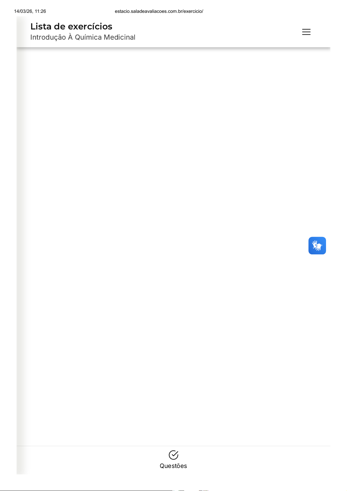 Questões Lista de exercícios Introdução À Química Medicinal 14/03/26, 11:26 estacio.saladeavaliacoes.com.br/exercicio/69b56feaf748ecd484c2097c/gabarito/ https://estacio.saladeavaliacoes.com.br/exercicio/69b56feaf748ecd484c2097c/gabarito/ 1/12 Você acertou 3 de 10 questões Verifique o seu desempenho e continue treinando! Você pode refazer o exercício quantas vezes quiser. Verificar Desempenho A B C D E 1 Marcar para revisão A Química Medicinal é uma área que apresenta diversos objetivos, sendo um dos principais a busca por novas moléculas a serem usadas na terapêutica. Marque a alternativa correta que descreve resumidamente as etapas principais usadas para essa busca. Adaptado de SILVA, Elenilson Figueiredo da; SILVA, Carlos da; BRUM, Lucimar Filot da Silva. Fundamentos De Química Medicinal. 1 ed. Porto Alegre: SAGAH, 2018. Descoberta, inovação e desenvolvimentos de fármacos. Otimização, modelagem molecular e desenvolvimento de fármacos. Otimização, latinização e desenvolvimento de fármacos. Desenvolvimento, planejamento e otimização. Descoberta, otimização e desenvolvimento de fármacos. Resposta incorreta Opa! A alternativa correta é a letra E. Confira o gabarito comentado! 14/03/26, 11:26 estacio.saladeavaliacoes.com.br/exercicio/69b56feaf748ecd484c2097c/gabarito/ https://estacio.saladeavaliacoes.com.br/exercicio/69b56feaf748ecd484c2097c/gabarito/ 2/12 A B C D E Gabarito Comentado A alternativa correta é a letra E: "descoberta, otimização e desenvolvimento de fármacos". Essas são as etapas principais na busca por novas moléculas na Química Medicinal. Primeiro, é feita a descoberta de novas moléculas com potencial terapêutico. Em seguida, ocorre a otimização dessas moléculas, a fim de melhorar suas propriedades e eficácia. Por fim, é realizado o desenvolvimento de fármacos, que envolve a produção em larga escala e a realização de testes clínicos para garantir a segurança e eficácia do novo medicamento. 2 Marcar para revisão São exemplos de produtos naturais de origem marinha: Trabectedina, ziconotido e halicondrina B. Zidovudina, morfina e estricnina. Taxol, metisergida e paclitaxel. Penicilina G, vimblastina e vincristina. Ziconotido, palitoxina e penicilina G. Resposta incorreta Opa! A alternativa correta é a letra A. Confira o gabarito comentado! Gabarito Comentado A alternativa correta é a "A", que lista três exemplos de produtos naturais de origem marinha: Trabectedina, ziconotido e halicondrina B. A Trabectedina é um medicamento antineoplásico derivado do organismo marinho Ecteinascidia turbinata. O Ziconotido é um analgésico derivado do 14/03/26, 11:26 estacio.saladeavaliacoes.com.br/exercicio/69b56feaf748ecd484c2097c/gabarito/ https://estacio.saladeavaliacoes.com.br/exercicio/69b56feaf748ecd484c2097c/gabarito/ 3/12 A B C D E marinho Ecteinascidia turbinata. O Ziconotido é um analgésico derivado do veneno do caracol marinho Conus magus. A Halicondrina B é um composto que foi isolado de uma esponja marinha e tem atividade antineoplásica. As outras alternativas listam produtos que não são todos de origem marinha. 3 Marcar para revisão Dentre os primeiros fármacos de origem sintética encontramos: Neosalvarsan e morfina. Ácido acetilsalicílico e ácido salicílico. Ácido acetilsalicílico e salvarsan. Estricnina e morfina. Morfina, estricnina e atropina. Resposta incorreta Opa! A alternativa correta é a letra C. Confira o gabarito comentado! Gabarito Comentado O ácido acetilsalicílico e o salvarsan são dois dos primeiros fármacos de origem sintética. O ácido acetilsalicílico, mais conhecido como aspirina, foi sintetizado pela primeira vez em 1897 pela empresa alemã Bayer. Já o salvarsan, um medicamento usado para tratar a sífilis, foi sintetizado pela primeira vez em 1907. Portanto, a alternativa correta é a alternativa C: "Ácido acetilsalicílico e salvarsan". 14/03/26, 11:26 estacio.saladeavaliacoes.com.br/exercicio/69b56feaf748ecd484c2097c/gabarito/ https://estacio.saladeavaliacoes.com.br/exercicio/69b56feaf748ecd484c2097c/gabarito/ 4/12 A B C D E 4 Marcar para revisão O Nexavar®, medicamento usado como anticâncer, tem como princípio ativo o fármaco sorafenibe que teve seu composto protótipo descoberto por: Ensaios biológicos automatizados do tipo HTS de uma coleção de compostos. Estratégias envolvendo a abordagem fisiológica. Acaso, pois estava sendo investigado para outra patologia. Triagem virtual. Planejamento racional. Resposta incorreta Opa! A alternativa correta é a letra A. Confira o gabarito comentado! Gabarito Comentado O princípio ativo do medicamento Nexavar®, o fármaco sorafenibe, foi descoberto através de ensaios biológicos automatizados do tipo HTS de uma coleção de compostos. Essa metodologia envolve a realização de testes em larga escala, utilizando uma coleção de compostos, para identificar aqueles que possuem a atividade biológica desejada. Neste caso, o sorafenibe foi identificado como um potencial agente anticâncer. 5 Marcar para revisão A Química medicinal teve contribuições de diversos pensadores, filósofos e pesquisadores desde a antiguidade até os dias de hoje. Marque a alternativa incorreta em relação a eles e suas contribuições/descobertas. 14/03/26, 11:26 estacio.saladeavaliacoes.com.br/exercicio/69b56feaf748ecd484c2097c/gabarito/ https://estacio.saladeavaliacoes.com.br/exercicio/69b56feaf748ecd484c2097c/gabarito/ 5/12 A B C D E A teoria de Hipócrates era baseada no equilíbrio entre os quatro humores corporais. Desde a antiguidade, Paracelsus já usava elementos químicos e inorgânicos na preparação de medicamentos. O Pai da Farmácia, Claudius Galeno, foi o precursor da farmácia galênica. Paracelsus já dizia que cada doença tinha o seu remédio específico. Platão, assim como Aristóteles, tinha uma visão totalmente racional baseada nos quatro elementos, terra, fogo, ar e água. Resposta incorreta Opa! A alternativa co