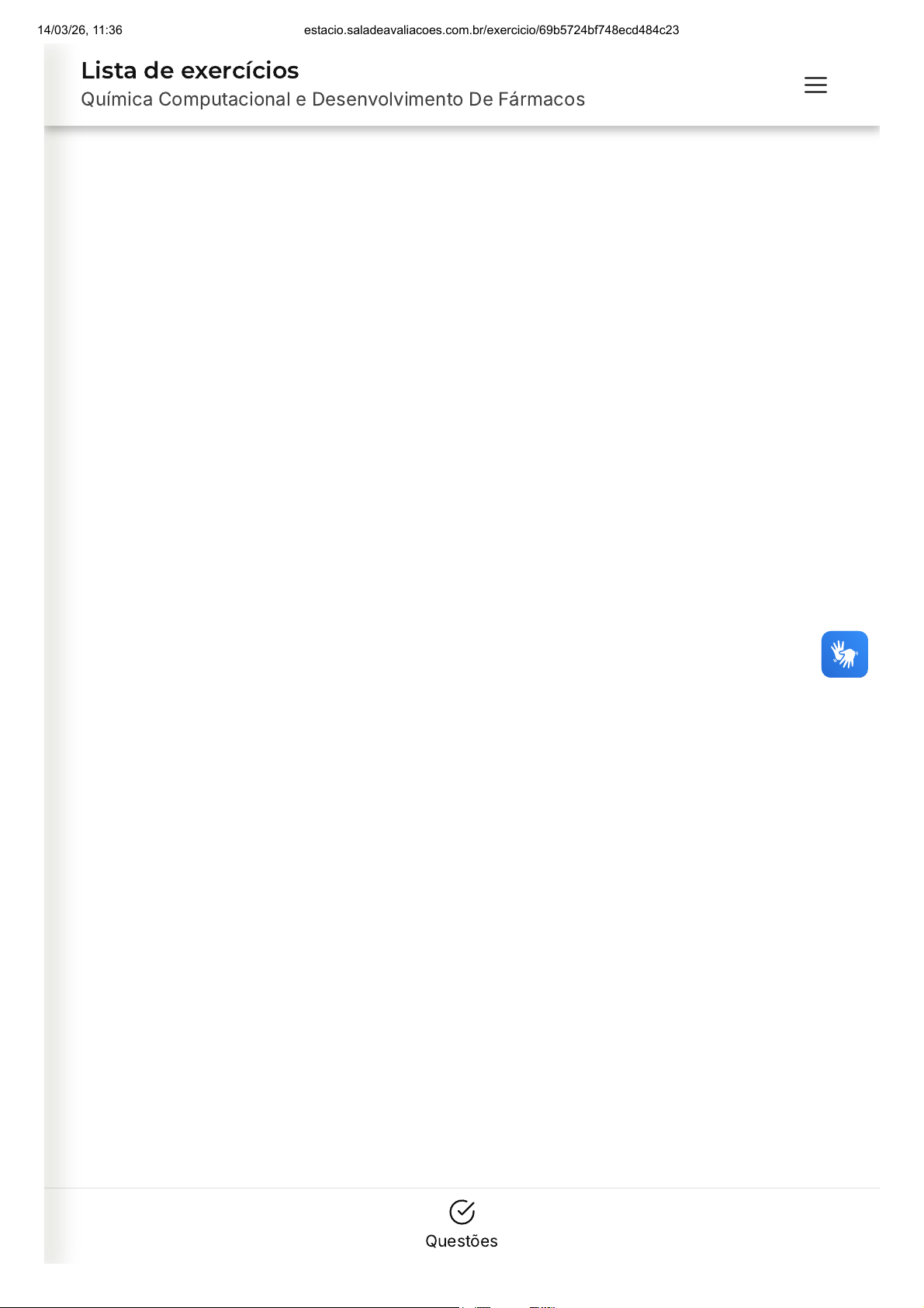 Questões Lista de exercícios Química Computacional e Desenvolvimento De Fármacos 14/03/26, 11:36 estacio.saladeavaliacoes.com.br/exercicio/69b5724bf748ecd484c23c9a/gabarito/ https://estacio.saladeavaliacoes.com.br/exercicio/69b5724bf748ecd484c23c9a/gabarito/ 1/13 Você acertou 2 de 10 questões Verifique o seu desempenho e continue treinando! Você pode refazer o exercício quantas vezes quiser. Verificar Desempenho A B C D E 1 Marcar para revisão Analisando a Comparação de Similaridade entre duas moléculas X e Y por representação binária de seus fingerprints a seguir, marque a alternativa que apresenta o número total de bits de similaridade entre elas: 1 bit 2 bits 3 bits 4 bits 5 bits Resposta incorreta 14/03/26, 11:36 estacio.saladeavaliacoes.com.br/exercicio/69b5724bf748ecd484c23c9a/gabarito/ https://estacio.saladeavaliacoes.com.br/exercicio/69b5724bf748ecd484c23c9a/gabarito/ 2/13 A B C D E Resposta incorreta Opa! A alternativa correta é a letra D. Confira o gabarito comentado! Gabarito Comentado A resposta certa é: 4 bits 2 Marcar para revisão Quando se deseja planejar um novo fármaco, porém não existem informações sobre o alvo molecular, a técnica de QSAR pode ser uma boa escolha. Entre as afirmativas abaixo sobre esta técnica de LBDD, assinale a opção incorreta: A técnica de QSAR teve sua origem nos estudos de relação estrutura- atividade desenvolvidos por Hansch e Fujita, que correlacionavam a atividade biológica apenas com características estruturais via parâmetros físico-químicos. Dependendo dos descritores utilizados nos estudos quantitativos de estrutura-atividade, o QSAR pode ser classificado como QSAR-2D quando utiliza descritores provenientes da estrutura bidimensional ou QSAR-3D quando provenientes da estrutura tridimensional. A montagem do banco de ligantes contendo informações conhecidas pode ser obtido em base de moléculas como o ChEMBL, e estes devem ter seus descritores gerados para que o modelo de QSAR possa ser construído, validado e só então aplicado a um conjunto de moléculas de atividade desconhecida. Os estudos de QSAR são totalmente dependentes de informações sobre a estrutura dos ligantes, tanto de atividade conhecido quanto dos ligantes que terão sua relação estrutura-atividade avaliada. A construção de modelos de QSAR visa a comparação de mapas farmacofóricos entre ligantes de atividade biológica desconhecida e ligantes conhecidamente ativos, de forma a predizer qualitativamente quais ligantes apresentarão potencial de atividade. 14/03/26, 11:36 estacio.saladeavaliacoes.com.br/exercicio/69b5724bf748ecd484c23c9a/gabarito/ https://estacio.saladeavaliacoes.com.br/exercicio/69b5724bf748ecd484c23c9a/gabarito/ 3/13 A B C quais ligantes apresentarão potencial de atividade. Resposta incorreta Opa! A alternativa correta é a letra E. Confira o gabarito comentado! Gabarito Comentado A alternativa E está incorreta. A construção de modelos de QSAR não visa a comparação de mapas farmacofóricos entre ligantes de atividade biológica desconhecida e ligantes conhecidos. Na verdade, a técnica de QSAR (Quantitative Structure-Activity Relationship) é usada para correlacionar a estrutura química de uma molécula com sua atividade biológica, utilizando parâmetros físico-químicos. Portanto, a afirmação de que a técnica de QSAR visa a comparação de mapas farmacofóricos é incorreta. 3 Marcar para revisão Sobre a Síntese Orientada pela Diversidade Estrutural, assinale a alternativa correta: A síntese orientada pela diversidade estrutural permite a síntese de um banco de compostos com elevada diversidade estrutural, possibilitando maiores chances de alcançar um composto ativo para um alvo conhecido. Na síntese orientada pela diversidade estrutural, o composto de interesse ou série de compostos não apresenta uma estrutura particular, desta forma a análise retrossintética não pode ser realizada na condução da síntese por este método. A diversificação estrutural pode ser alcançada por meio da variação de quatro elementos básicos: o primeiro são os blocos de síntese, o segundo são os grupos funcionais, o terceiro é a estereoquímica e o quarto são variação de técnicas sintéticas. A diversidade estrutural de uma série de compostos é primariamente 14/03/26, 11:36 estacio.saladeavaliacoes.com.br/exercicio/69b5724bf748ecd484c23c9a/gabarito/ https://estacio.saladeavaliacoes.com.br/exercicio/69b5724bf748ecd484c23c9a/gabarito/ 4/13 D E A B A diversidade estrutural de uma série de compostos é primariamente dependente da diversidade das estereoquímicas, os esqueletos moleculares centrais são menos importantes. A estratégia de ramificação dos caminhos sintéticos baseia-se no uso de diferentes materiais de partida reagindo com um único reagente, levando à produção de moléculas com arquitetura molecular distinta. Resposta incorreta Opa! A alternativa correta é a letra B. Confira o gabarito comentado! Gabarito Comentado A alternativa correta é a B, que afirma que na síntese orientada pela diversidade estrutural, o composto de interesse ou série de compostos não apresenta uma estrutura particular. Isso significa que a análise retrossintética, que é um método de planejamento de síntese onde se começa com a estrutura do composto desejado e se trabalha de volta para os materiais de partida, não pode ser realizada na condução da síntese por este método. Isso ocorre porque a síntese orientada pela diversidade estrutural visa criar uma variedade de compostos, sem focar em uma estrutura específica. 4 Marcar para revisão Estudos de dinâmica molecular podem ser considerados mais robustos que os de ancoramento, pois apresentam um diferencial em sua técnica, definido pela alternativa: Os estudos de dinâmica molecular apresentam a vantagem de não necessitarem de informações e estrutura tridimensional do alvo molecular. São estudos bem mais rápidos que os de docking mol