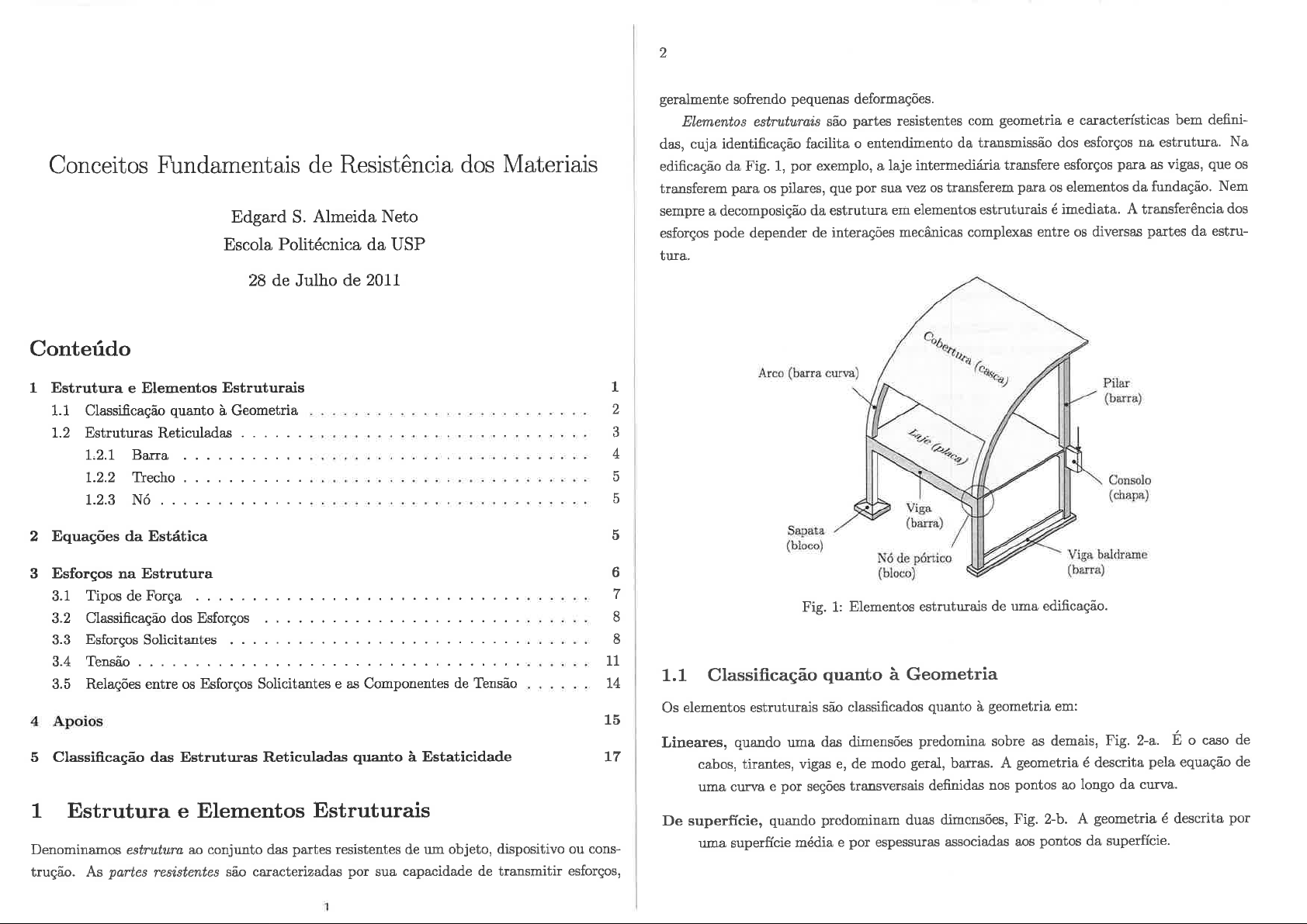 2 geralmente sofrendo pequenas deformações. Elementos estruturais são partes resistentes com geometria e características bem defini- das, cuja identificação facilita o entendimento da transmissão dos esforços na estrutura. Na Conceitos Fundamentais de Resistência dos Materiais edificação da Fig. 1, por exemplo, a laje intermediária transfere esforços para as vigas, que transferem para pilares, que por sua vez transferem para elementos da fundação. Nem Edgard S. Almeida Neto sempre a decomposição da estrutura em elementos estruturais é imediata. A transferência dos esforços pode depender de interações mecânicas complexas entre diversas partes da estru- Escola Politécnica da USP tura. 28 de Julho de 2011 Conteúdo Arco (barra curva) 1 Estrutura e Elementos Estruturais 1 Pilar (barra) 1.1 Classificação quanto à Geometria 2 1.2 Estruturas Reticuladas 3 1.2.1 Barra 4 Laje 1.2.2 Trecho 5 Consolo 1.2.3 Nó 5 (chapa) Viga (barra) 2 Equações da Estática 5 Sapata (bloco) Nó de pórtico Viga baldrame 3 Esforços na Estrutura 6 (bloco) (barra) 3.1 Tipos de Força 7 Fig. 1: Elementos estruturais de uma edificação. 3.2 Classificação dos Esforços 8 3.3 Esforços Solicitantes 8 3.4 Tensão 11 3.5 Relações entre os Esforços Solicitantes e as Componentes de Tensão 14 1.1 Classificação quanto à Geometria Os elementos estruturais são classificados quanto à geometria em: 4 Apoios 15 Lineares, quando uma das dimensões predomina sobre as demais, Fig. 2-a. É o caso de 5 Classificação das Estruturas Reticuladas quanto à Estaticidade 17 cabos, tirantes, vigas e, de modo geral, barras. A geometria é descrita pela equação de uma curva e por seções transversais definidas nos pontos ao longo da curva. 1 Estrutura e Elementos Estruturais De superfície, quando predominam duas dimensões, Fig. 2-b. A geometria é descrita por Denominamos estrutura ao conjunto das partes resistentes de um objeto, dispositivo ou cons- uma superfície média e por espessuras associadas aos pontos da superfície. trução. As partes resistentes são caracterizadas por sua capacidade de transmitir esforços, 1Edgard S. Almeida Neto [versão preliminar] Julho de 2011 3 4 Se a superfície média for curva, elemento é denominado casca. Se ela for plana, a de- nominação depende do carregamento atuante: chapa, quando esforços externos estão contidos no plano médio, e placa, quando OS esforços externos atuam perpendicularmente (casca) ao plano médio. Nos problemas de comportamento linear, um elemento plano submetido a um carrega- / mento genérico pode ser sempre representado por uma chapa mais uma placa. Este é 0 caso das 'placas' de expansão do microcomputador da Fig. 3. / De volume, quando as três dimensões têm a mesma ordem de grandeza, Fig. 2-c. É caso (placa) de parafusos, porcas, blocos de fundação, nós de pórticos etc. Os termos barra, folha e bloco são usualmente empregados para designar, respectivamente, os elementos lineares, de superfície e de volume. Por exemplo, arco é uma barra curva e a casca é uma folha curva. (a) Barra (b) Folha (c) Bloco Fig. 3: Elementos estruturais de um microcomputador. a a b b 1.2.1 Barra h e l b Barra é 0 elemento sólido gerado por uma figura plana, não necessariamente constante, que se desloca no espaço permanecendo normal à trajetória de seu baricentro, Fig. 4. lugar geométrico dos pontos ocupados pelo baricentro da figura plana recebe 0 nome de Chapa Placa eixo longitudinal da barra. As intersecções dos planos normais ao eixo com o sólido gerado definem as seções transversais da barra (STs), as quais coincidem com a figura plana para um ponto arbitrário do eixo. Os adjetivos reta e curva designam barras de eixos retos e curvos, respectivamente. A barra reta de seção transversal constante recebe o nome de barra Fig. 2: Classificação quanto à geometria: (a) estrutura linear, (b) de superfície, (c) de volume. prismática. Eixo 1.2 Estruturas Reticuladas G Estrutura reticulada é aquela formada apenas por elementos estruturais lineares. Dizemos que uma estrutura reticulada é plana quando suas barras apresentam um plano central¹ coincidente ST com o plano médio da estrutura e esforços externos ou estão contidos no plano médio (vigas poligonais e pórticos planos) ou atuam perpendicularmente a ele (grelhas). (a) (b) A seguir, introduzimos os conceitos de barra, trecho e nó visando facilitar a descrição das Fig. 4: Eixo e seção transversal de uma barra (a) genérica, (b) prismática. estruturas reticuladas. ¹Plano definido pelo eixo longitudinal da barra e um dos eixos centrais-principais da ST.Edgard S. Almeida Neto [versão preliminar] Julho de 2011 5 6 Rígido Articulado 1.2.2 Trecho Denominamos trecho a um segmento de barra delimitado por STs nas quais insere-se uma nova barra, ou uma articulação etc.; Φ₁ altera-se a equação que rege a posição do eixo da barra; introduz-se uma carga concentrada; interrompe-se um carregamento distribuído. Fig. 6: Nó rígido e nó articulado. F Para um corpo em repouso em relação a um sistema inercial, as leis de Euler³ fornecem: t₂ P (2.1) p i=1 j=1 F t₇ P t₁ correspondendo ao equilíbrio de forças Fᵢ e nM momentos em relação a um polo t₅ t₆ t₁ t₂ t₃ arbitrário O. Reescrevendo a equação acima empregando as componentes de força e momento em relação a três eixos ortogonais x, e passando por O, obtemos Fig. 5: Delimitação das seções extremas dos trechos. Σ Σ Σ 0, Σ 0, (2.2) 1.2.3 Nó Σ Σ 0, Denominamos nó² ao ponto de encontro de duas ou mais barras. Dizemos que nós são onde OS índices foram omitidos. Para um sistema de forças coplanares em que as forças articulados quando eles permitem rotações relativas entre as extremidades das barras, caso e momentos atuam no plano definido pelos eixos x e y, restam apenas três equações não- contrário dizemos que eles são rígidos. identicamente nulas: Σ 0, 0. (2.3) 