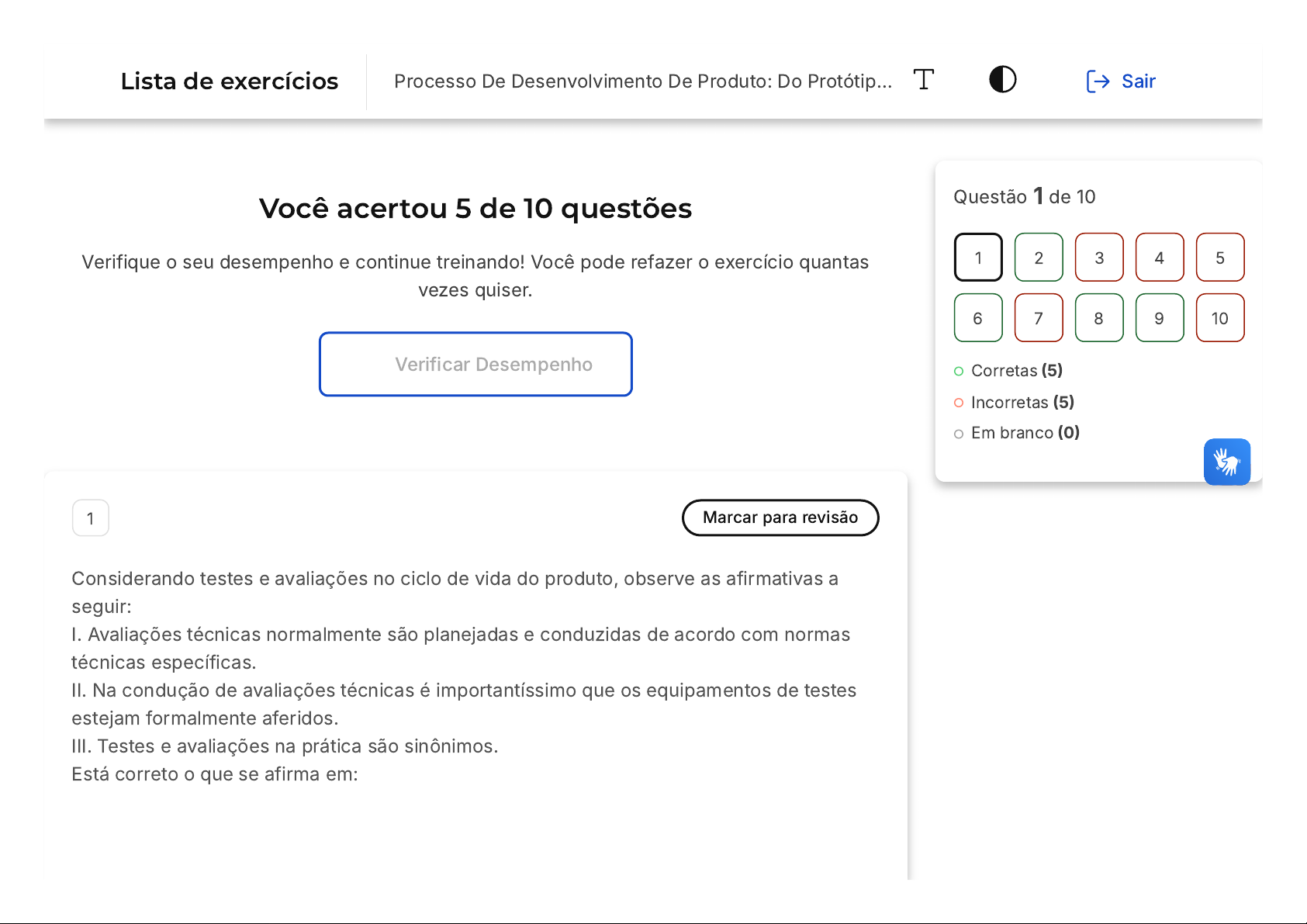 Você acertou 5 de 10 questões Verifique o seu desempenho e continue treinando! Você pode refazer o exercício quantas vezes quiser. Verificar Desempenho 1 Marcar para revisão Considerando testes e avaliações no ciclo de vida do produto, observe as afirmativas a seguir: I. Avaliações técnicas normalmente são planejadas e conduzidas de acordo com normas técnicas específicas. II. Na condução de avaliações técnicas é importantíssimo que os equipamentos de testes estejam formalmente aferidos. III. Testes e avaliações na prática são sinônimos. Está correto o que se afirma em: Questão 1 de 10 Corretas (5) Incorretas (5) Em branco (0) 1 2 3 4 5 6 7 8 9 10 Lista de exercícios Processo De Desenvolvimento De Produto: Do Protótip… Sair A B C D E I, somente. II e III. I e II. I e III. II, somente. Resposta correta Parabéns, você selecionou a alternativa correta. Confira o gabarito comentado! Gabarito Comentado Testes e avaliações se distinguem conceitualmente. Testes são ensaios conduzidos sob condições preestabelecidas com o objetivo de coleta de informações que são utilizadas em avaliações, ou seja, para colaborarem em algum tipo de "juízo de valor" que pode ser útil na tomada de decisões. Normas técnicas específicas costumam padronizar procedimentos experimentais em avaliações técnicas. A necessária confiabilidade e exatidão de medições somente é possível se os A B C equipamentos de testes estiverem aferidos de forma a garantirem rastreabilidade das grandezas ao Sistema Internacional (SI). 2 Marcar para revisão Considerando a importância da consideração das dimensões da qualidade no lançamento do produto e introdução no mercado, observe as afirmativas a seguir: I. A dimensão da qualidade denominada "durabilidade" é sinônimo da dimensão "confiabilidade". II. A dimensão "conformidade" está relacionada ao atendimento à especificações. III. O setor de marketing e propaganda deve explorar ao máximo as características da qualidade que distinguem positivamente o produto particular dos produtos dos concorrentes. Está correto o que se afirma em: I, somente. II e III. I e II. D E I e III. II, somente. Resposta correta Parabéns, você selecionou a alternativa correta. Confira o gabarito comentado! Gabarito Comentado A dimensão da qualidade "conformidade" trata do atendimento às exigências contidas em especificações. O marketing e propaganda devem atuar no sentido de promover as qualidades contidas nos produtos, principalmente aquelas que se destacam frente aos concorrentes. Apesar de durabilidade e confiabilidade serem conceitos correlacionados, estes se distinguem no sentido que a durabilidade trata do limite máximo da vida útil do sistema, enquanto que a confiabilidade trata da propensão à falha durante todo o tempo da vida do item, ou seja, considera a eventual recuperação por meio de ações de manutenção. 3 Marcar para revisão Considerando o acompanhamento de vendas e o acompanhamento do produto, observe as afirmativas a seguir: A B C D E I. O monitoramento da vida de um produto é algo que não costuma atrapalhar as operações. II. Sistemas de informações gerenciais podem ser úteis para a coleta oportuna de informações sobre vendas no mercado . III. O acompanhamento de vendas de peças de reposição associadas a determinado sistema pode ajudar no projeto e na gestão de sistemas de manutenção que apoiam o sistema desenvolvido. Está correto o que se afirma em: I, somente. II e III. I e II. I e III. II, somente. Resposta incorreta Opa! A alternativa correta é a letra B. Confira o gabarito comentado! Gabarito Comentado A utilização de sistemas de informações gerenciais pode ajudar muito na gerência da demanda por meio de disponibilização rápida e precisa de informações sobre as vendas. Acompanhar a venda de peças de reposição pode auxiliar os fornecedores nos seus respectivos planos de produção de forma a equilibrarem seus sistemas de produção com as demandas em prol da disponibilidade do sistema. As ações necessárias para acompanhar o ciclo de vida de um produto envolvem coleta de dados. Mesmo que sejam projetados mecanismos menos invasivos possíveis, em geral, algum nível de impacto sobre as operações ocorre devido a coleta de dados. Porém, os benefícios costumam compensar em muito os eventuais transtornos. 4 Marcar para revisão Considerando obsolescência tecnológica e descontinuação, observe as afirmativas a seguir: I. Obsolescência tecnológica ocorre quando o desempenho de funções de um produto se degradam devido ao envelhecimento. II. Mecanismos de prospecção tecnológica tem pouca valia para a busca de inovações tecnológicas. III. Esforços de pesquisa e desenvolvimento em busca de inovações tecnológicas são essenciais para se ter maiores chances de protagonizar a obsolescência tecnológica dos produtos concorrentes. Está correto o que se afirma em: A B C D E I, somente II e III I e II I e III III, somente Resposta incorreta Opa! A alternativa correta é a letra E. Confira o gabarito comentado! Gabarito Comentado Uma vez que a busca por inovações pode fazer com que tecnologias surjam e provoquem obsolescência tecnológica em um produto por mim desenvolvido, nada melhor do que eu mesmo ser o protagonista de uma inovação e assim poder controlar a obsolescência do meu atual produto e ao mesmo tempo desbancar os produtos concorrentes. A obsolescência que ocorre quando o desempenho de funções de um produto se degradam devido ao envelhecimento é a funcional. Mecanismos de prospecção tecnológica, apesar de muitas vezes serem limitados em seus resultados, A B C são importantes para dar direcionamento em esforços de pesquisa e desenvolvimento em prol de inovações. 5 Marcar para revisão Considerando a sincronia da produção e soluções ERP, observe as afirmativas a seguir: I. O nível de detalhamento das partes de itens a serem administrados em