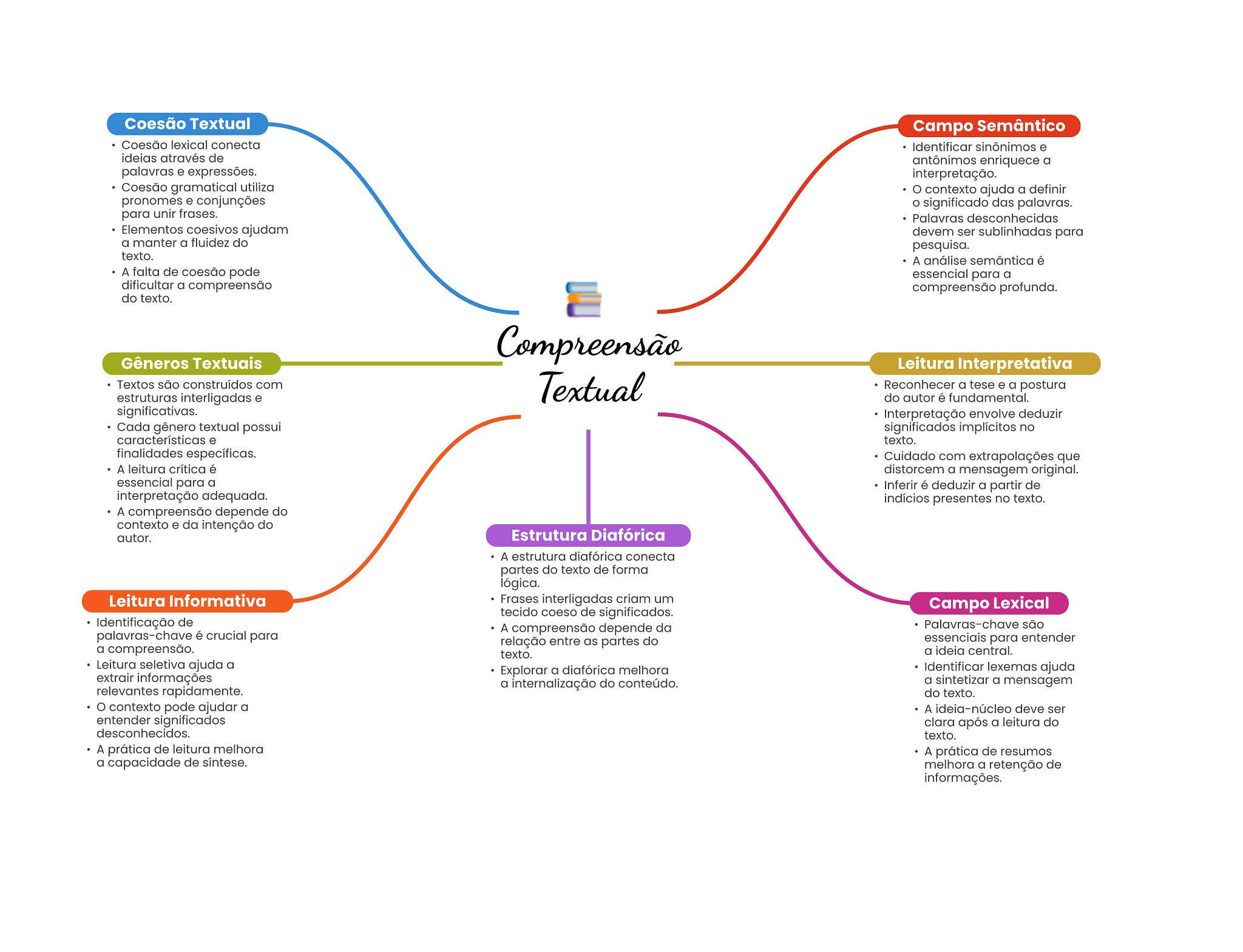 Coesão Textual Campo Semântico Coesão lexical conecta Identificar sinônimos e ideias através de antônimos enriquece a palavras e expressões. interpretação. Coesão gramatical utiliza contexto ajuda a definir pronomes e conjunções significado das palavras. para unir frases. Palavras desconhecidas Elementos coesivos ajudam devem ser sublinhadas para a manter a fluidez do pesquisa. texto. A análise semântica é A falta de coesão pode essencial para a dificultar a compreensão compreensão profunda. do texto. Compreensão Gêneros Textuais Leitura Interpretativa Textos são construídos com Textual Reconhecer a tese e a postura estruturas interligadas e do autor é fundamental. significativas. Interpretação envolve deduzir Cada gênero textual possui significados implícitos no características e texto. finalidades específicas. Cuidado com extrapolações que A leitura crítica é distorcem a mensagem original. essencial para a Inferir é deduzir a partir de interpretação adequada. indícios presentes no texto. A compreensão depende do contexto e da intenção do autor. Estrutura Diafórica A estrutura diafórica conecta partes do texto de forma lógica. Leitura Informativa Frases interligadas criam um Campo Lexical tecido coeso de significados. Identificação de A compreensão depende da Palavras-chave são palavras-chave é crucial para relação entre as partes do essenciais para entender a compreensão. texto. a ideia central. Leitura seletiva ajuda a Explorar a diafórica melhora Identificar lexemas ajuda extrair informações a internalização do conteúdo. a sintetizar a mensagem relevantes rapidamente. do texto. contexto pode ajudar a A ideia-núcleo deve ser entender significados clara após a leitura do desconhecidos. texto. A prática de leitura melhora A prática de resumos a capacidade de síntese. melhora a retenção de informações.