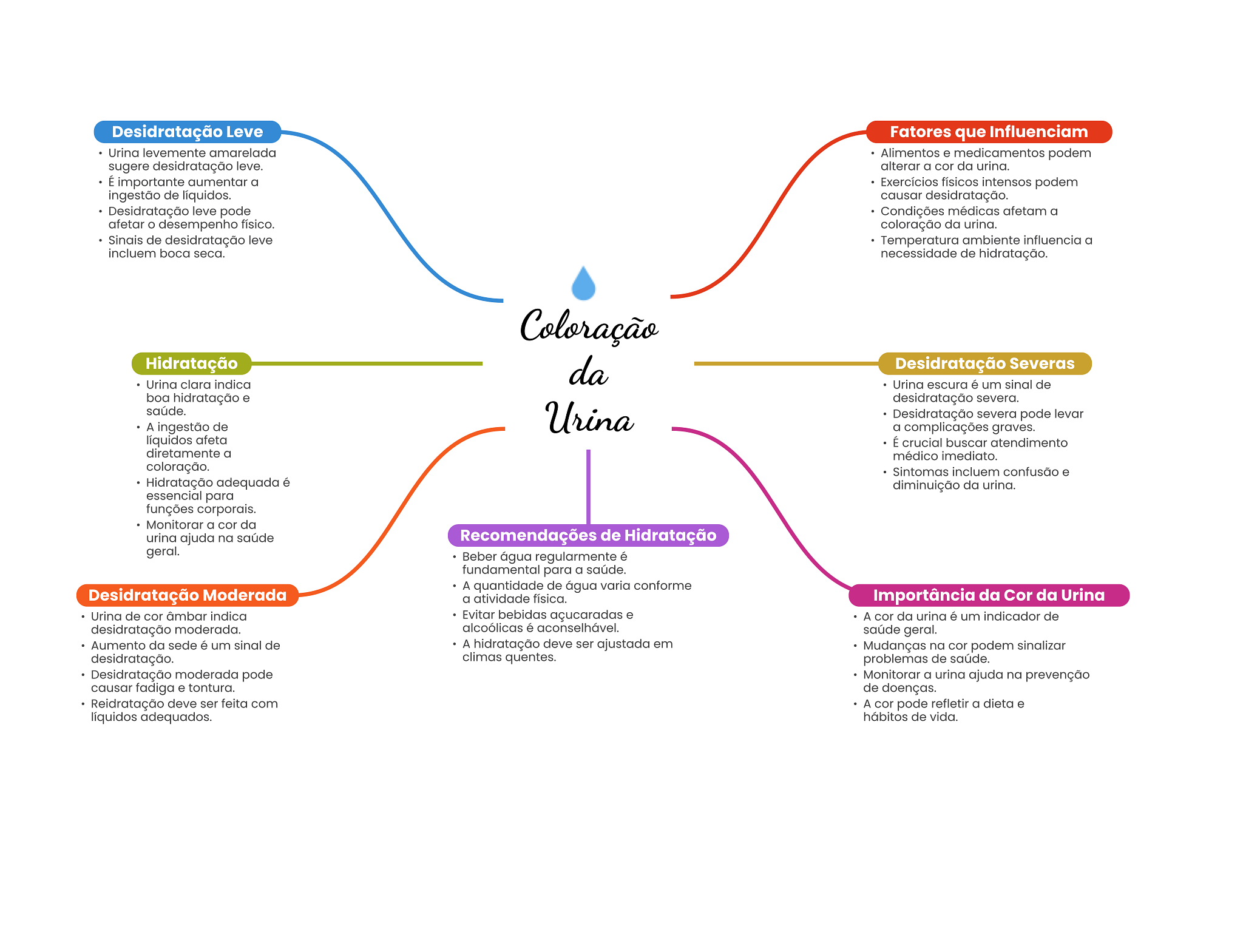 Desidratação Leve Fatores que Influenciam Urina levemente amarelada Alimentos e medicamentos podem sugere desidratação leve. alterar a cor da urina. É importante aumentar a Exercícios físicos intensos podem ingestão de líquidos. causar desidratação. Desidratação leve pode Condições médicas afetam a afetar desempenho físico. coloração da urina. Sinais de desidratação leve Temperatura ambiente influencia a incluem boca seca. necessidade de hidratação. Coloração Hidratação da Desidratação Severas Urina clara indica Urina escura é um sinal de boa hidratação e desidratação severa. saúde. Urina Desidratação severa pode levar A ingestão de a complicações graves. líquidos afeta É crucial buscar atendimento diretamente a médico imediato. coloração. Sintomas incluem confusão e Hidratação adequada é diminuição da urina. essencial para funções corporais. Monitorar a cor da urina ajuda na saúde Recomendações de Hidratação geral. Beber água regularmente é fundamental para a saúde. A quantidade de água varia conforme Desidratação Moderada a atividade física. Importância da Cor da Urina Urina de cor âmbar indica Evitar bebidas açucaradas e A cor da urina é um indicador de desidratação moderada. alcoólicas é aconselhável. saúde geral. Aumento da sede é um sinal de A hidratação deve ser ajustada em Mudanças na cor podem sinalizar desidratação. climas quentes. problemas de saúde. Desidratação moderada pode Monitorar a urina ajuda na prevenção causar fadiga e tontura. de doenças. Reidratação deve ser feita com A cor pode refletir a dieta e líquidos adequados. hábitos de vida.
