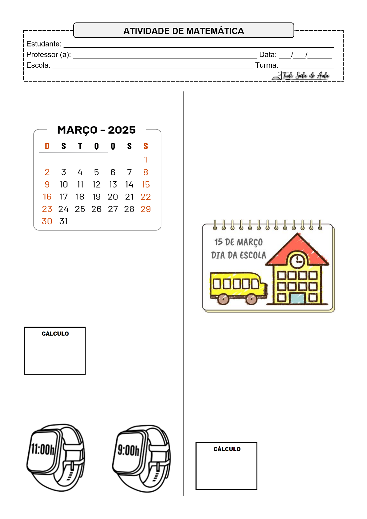 1. No dia 15 de Março é comemorado o dia da escola. Procure essa data no calendário abaixo e circule. Em qual dia da semana será comemorado o dia da escola? R = _________________________________ 2. Para a festinha de comemoração do Dia da Escola, Robson comprou 5 pacotes de balões para a decoração. Se cada pacote contém 50 unidades, quantos balões ele comprou ao todo? Resposta:______________ 3. A festividade do Dia da Escola começará às 7:00h da manhã e terá duração de 4 horas. Pinte o relógio que indica o horário de término do evento. 4. Em comemoração ao Dia da Escola, a diretora Carla convidou 4 alunos para ajudar na decoração do ambiente, 5 alunos para distribuir cartões e 8 alunos para apresentarem produções relacionadas à data comemorativa. Quantos alunos ajudaram Carla nesse momento? a) 9 b) 12 c) 13 d) 17 5. Amanda fez um desenho para homenagear o dia da escola. a) Qual é o formato do telhado da escola? R = _________________________________ b) Quantos círculos Amanda desenhou? R = _________________________________ 6. A professora Aline vai gravar vídeos dos alunos estudando na biblioteca para o Dia da Escola. Para isso, ela precisa organizar o espaço e distribuir 60 livros em 4 prateleiras. Quantos livros devem ser colocados em cada prateleira? Resposta:______________ https://www.tudosaladeaula.com/ 7. Observe o mapa de localização a seguir. Qual a localização da escola? a) A2 b) B1 c) C2 d) C4 8. Observe alguns alunos da turma do 2º ano fazendo uma apresentação na festinha da escola. Considerando essa representação, quem é a 4ª criança nessa sequência? R = _________________________________ 9. Em homenagem ao Dia da Escola, Milena decidiu preparar lembrancinhas especiais para os alunos do turno da manhã, diferenciando-as para meninos e meninas. ALUNOS QUANTIDADE Meninas 47 Meninos 52 Quantos alunos, ao todo, estudam no turno da manhã na escola de Milena? Resposta:______________ 10. Para realizar um trabalho sobre o Dia da Escola, a professora Fabiana dividiu a turma em 3 grupos, com a mesma quantidade de alunos. Veja um dos grupos formados por Fabiana. Quantos alunos formam a turma de Fabiana? a) 5 b) 10 c) 15 d) 20