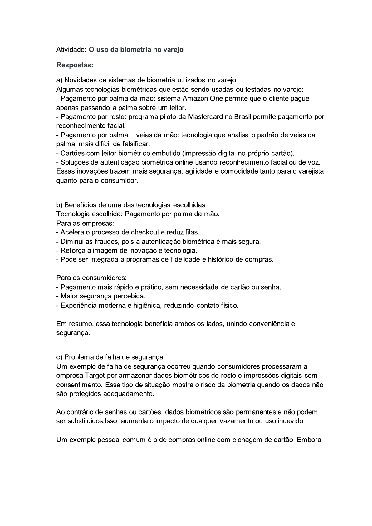 Atividade: uso da biometria no varejo Respostas: a) Novidades de sistemas de biometria utilizados no varejo Algumas tecnologias biométricas que estão sendo usadas ou testadas no varejo: Pagamento por palma da mão: sistema Amazon One permite que cliente pague apenas passando a palma sobre um leitor. Pagamento por rosto: programa piloto da Mastercard no Brasil permite pagamento por reconhecimento facial. Pagamento por palma + veias da mão: tecnologia que analisa o padrão de veias da palma, mais difícil de falsificar. Cartões com leitor biométrico embutido (impressão digital no próprio cartão). Soluções de autenticação biométrica online usando reconhecimento facial ou de Essas inovações trazem mais segurança, agilidade e comodidade tanto para varejista quanto para o consumidor. b) Benefícios de uma das tecnologias escolhidas Tecnologia escolhida: Pagamento por palma da mão. Para as empresas: Acelera o processo de checkout e reduz filas. Diminui as fraudes, pois a autenticação biométrica é mais segura. Reforça a imagem de inovação e tecnologia. Pode ser integrada a programas de fidelidade e histórico de compras. Para os consumidores: Pagamento mais rápido e prático, sem necessidade de cartão ou senha. Maior segurança percebida. Experiência moderna e higiênica, reduzindo contato físico. Em resumo, essa tecnologia beneficia ambos os lados, unindo conveniência e segurança. c) Problema de falha de segurança Um exemplo de falha de segurança ocorreu quando consumidores processaram a empresa Target por armazenar dados biométricos de rosto e impressões digitais sem consentimento. Esse tipo de situação mostra o risco da biometria quando os dados não são protegidos adequadamente. Ao contrário de senhas ou cartões, dados biométricos são permanentes e não podem ser aumenta o impacto de qualquer vazamento ou uso indevido. Um exemplo pessoal comum é o de compras online com clonagem de cartão. Emboraalguns solicitem/envolvam acesso facial, mostra como falhas de segurança podem causar transtornos e perda de confiança do consumidor.