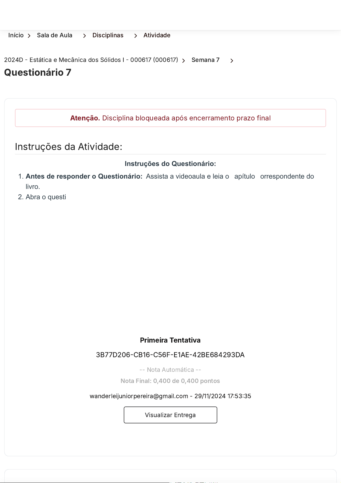 Início 〉 Sala de Aula 〉 Disciplinas 〉 Atividade 2024D - Estática e Mecânica dos Sólidos I - 000617 (000617) 〉 Semana 7 〉 Questionário 7 Instruções da Atividade: Instruções do Questionário: 1. Antes de responder o Questionário: Assista a videoaula e leia o capítulo correspondente do livro. 2. Abra o questionário somente quando for responder; 3. Ao abrir o questionário você terá 4 questões para responder; 4. Leia com calma todas as questões e entenda o que pede a questão: se pede a incorreta, a correta e qual o tema da questão; 5. Lembre-se de Clicar no botão "Enviar"; 6. Você tem duas tentativas para fazer o teste, a segunda tentativa é opcional; 7. Lembre-se que as respostas mudam de lugar em cada tentativa; 8. As respostas corretas só aparecem após o envio da segunda tentativa; 9. O sistema considera a maior nota entre as duas tentativas; 10. Lembre-se que na segunda tentativa zera TODAS as questões, inclusive as que você acertou na primeira tentativa. Bons estudos! Primeira Tentativa 3B77D206-CB16-C56F-E1AE-42BE684293DA -- Nota Automática -- Nota Final: 0,400 de 0,400 pontos wanderleijuniorpereira@gmail.com - 29/11/2024 17:53:35 Visualizar Entrega Atenção. Disciplina bloqueada após encerramento prazo final https://ava.uca.edu.br/aluno/sala-de-aula/disciplina/modulo/atividade/230262 https://ava.uca.edu.br/aluno/sala-de-aula/disciplina/modulo/atividade/230262 https://ava.uca.edu.br/aluno/sala-de-aula/disciplina https://ava.uca.edu.br/aluno/sala-de-aula/disciplina/modulo/atividade/:id/:nome javascript:void(0); Perguntas Pergunta 1. Pergunta 2. Pergunta 3. Pergunta 4. pontos: 0,100Pergunta 1. As propriedades da seção de uma peça influenciam e muito em sua capacidade de rotacionar em relação a um eixo ou outro. Dado um pilar retangular de seção 15x30cm. Qual é o valor de seu maior momento de inércia? Múltipla Escolha: A. 33750cm4 B. 65000cm4 C. 43750cm4 D. 15000cm4 E. 53750cm4 Avaliação Nota Avaliada: 0,100 de 0,100 javascript:void(0); pontos: 0,100Pergunta 2. Dado uma viga cujo o momento fletor máximo é de 2800kN.cm, sua inércia na flexão vale 33750cm e sua seção sendo de 15cmx30cm. Calcule sua máxima tensão de tração no caso dela ser apoiada nos dois extremos. Múltipla Escolha: A. 2,24kN/cm² B. 1,24kN/cm² C. 3,24kN/cm² D. 4,24kN/cm² E. 5,24kN/cm² 4 Avaliação Nota Avaliada: 0,100 de 0,100 javascript:void(0); pontos: 0,100Pergunta 3. As propriedades da seção de uma peça influenciam e muito em sua capacidade de rotacionar em relação a um eixo ou outro. Dado um pilar retangular de seção 20x30cm. Qual é o valor de seu maior momento de inércia? Múltipla Escolha: A. 15000cm4 B. 65000cm4 C. 55000cm4 D. 75000cm4 E. 45000cm4 pontos: 0,100Pergunta 4. Dado uma viga cujo o momento fletor máximo é de 1800kN.cm, sua inércia na flexão vale 33750cm e sua seção sendo de 15cmx30cm. Calcule sua máxima tensão de tração no caso dela ser apoiada nos dois extremos. Avaliação Nota Avaliada: 0,100 de 0,100 4 javascript:void(0); Múltipla Escolha: A. 0.6kN/cm² B. 0.9kN/cm² C. 0.8kN/cm² D. 0.5kN/cm² E. 0.7kN/cm² Fechar Visualização 〈 Voltar aos Módulos 〈 Anterior Avaliação Nota Avaliada: 0,100 de 0,100 Próxima 〉 javascript:void(0); Faculdade Católica Paulista Contato Endereço Avenida Cristo Rei, 305 – Banzato Marília, São Paulo – CEP: 17515-200 Horário De Funcionamento Segunda a quinta, das 8:00 às 20:00 horas As sextas, das 8:00 às 18:00 horas. WhatsApp : (14) 9.8826-3000 Telefone Sede: (14) 3422-1815 Central de Atendimento: 0800 664 5583 E-mail : secretaria@uca.edu.br https://www.instagram.com/faculdadecatolicaead/ https://facebook.com/ucaead https://www.youtube.com/@UcaEduBr https://www.linkedin.com/school/faculdade-catolica-paulista/?originalSubdomain=br https://maps.app.goo.gl/wWsD9QX5fVPa3h6PA https://api.whatsapp.com/send?phone=5514988263000&text=Suporte tel:14-3422-1815 tel:14-3422-1815 tel:0800-664-5583 tel:0800-664-5583 mailto:secretaria@uca.edu.br javascript:void(0);
