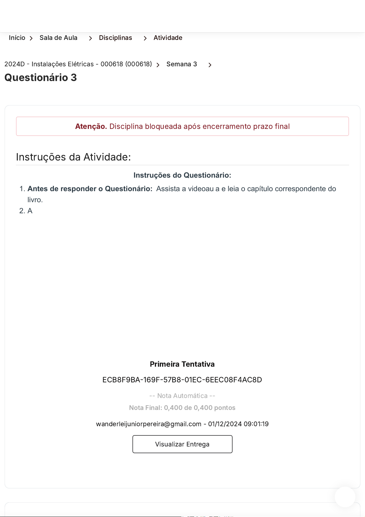 Atenção. Disciplina bloqueada após encerramento prazo final