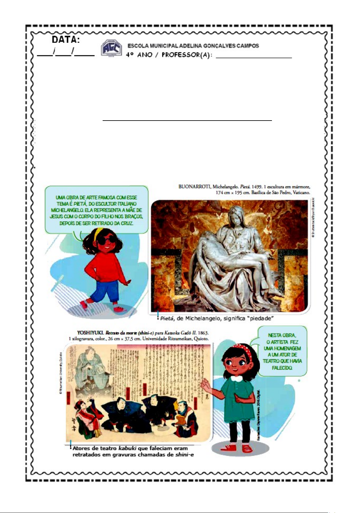 1 (HABILIDADE : EF03CI04) 4ºANO / ENSINO RELIGIOSO/ 2ª ETAPA Nesta próxima etapa, você vai conhecer diferentes expressões artísticas, como pintura, escultura e dança, que representam e manifestam o sagrado nas religiões. Você vai perceber que essas expressões da arte são diferentes em cada cultura e também que fazem parte das religiões. ENCONTRANDO O SAGRADO NA ARTE Ao longo do tempo, indivíduos e culturas criaram diversas maneiras de expressar sentimentos relacionados à perda e ao luto. Uma das formas é por meio da arte. As crenças a respeito da vida após a morte e os ritos fúnebres foram representados artisticamente por diversas culturas. Observe algumas obras de arte cujo tema é a morte. (HABILIDADES : EF04ER05- ER04ER11MG -EF04ER12MG) 2 (HABILIDADES : EF04ER05- ER04ER11MG -EF04ER12MG) 1. CRENÇAS 2. CULTURAS 3. DANÇA 4. ESCULTURA 5. EXPRESSÕES*ARTÍSTICAS 6. LUTO 7. MANIFESTAM 8. PERDA 9. PINTURA 10.RELIGIÕES 11.RESPEITO 12.RITOS*FÚNEBRES 13.SAGRADO 14.SENTIMENTOS Caça-palavras 3 (HABILIDADE : EF03CI04) ENSINO RELIGIOSO/ 3ª ETAPA OS MISTÉRIOS DA VIDA E DA MORTE NAS CULTURAS A vida renova-se constantemente, e as pessoas que por aqui passam deixam sua contribuição para a humanidade, que continua sua caminhada no mundo. É importante entender a morte como parte do ciclo de existência de cada um. A vida é feita de muitos mistérios e temos as curiosidades: De onde viemos? Por que estamos aqui? Para onde vamos? O ser humano sempre buscou respostas a essas perguntas para auxiliá-lo a enfrentar os mistérios da existência: o nascimento, a vida e a morte. Assim, os diferentes modos de viver levam a diversas interpretações a respeito da vida e do que acontece depois da morte. De qualquer forma, desde os povos ancestrais, a morte sempre foi vista como algo enigmático, misterioso. As tradições culturais e religiosas têm interpretações diferentes para tais mistérios. Isso também ocorre em relação à morte. Como vimos, existem ao menos quatro respostas para o que acontece após a morte: a ressurreição, a reencarnação, a ancestralidade e o nada. (HABILIDADES : EF04ER05- ER04ER11MG -EF04ER12MG) 4 (HABILIDADES : EF04ER05- ER04ER11MG -EF04ER12MG) Caça- pala- 1. ANCESTRAIS 2. ANCESTRALIDADE 3. AUXÍLIO 4. CICLO*DE*EXISTÊNCIA 5. CONTRIBUIÇÃO 6. CULTURAIS 7. CURIOSIDADES 8. DIFERENTES 9. ENIGMÁTICO 10. HUMANIDADE 11. INTERPRETAÇÕES 12. MISTÉRIOS 13. MODOS*DE*VIVER 14. MORTE 15. NADA 16. NASCIMENTO 17. QUATRO*RESPOSTAS 18. REENCARNAÇÃO 19. RELIGIOSAS 20. RESSURREIÇÃO 21. VIDA