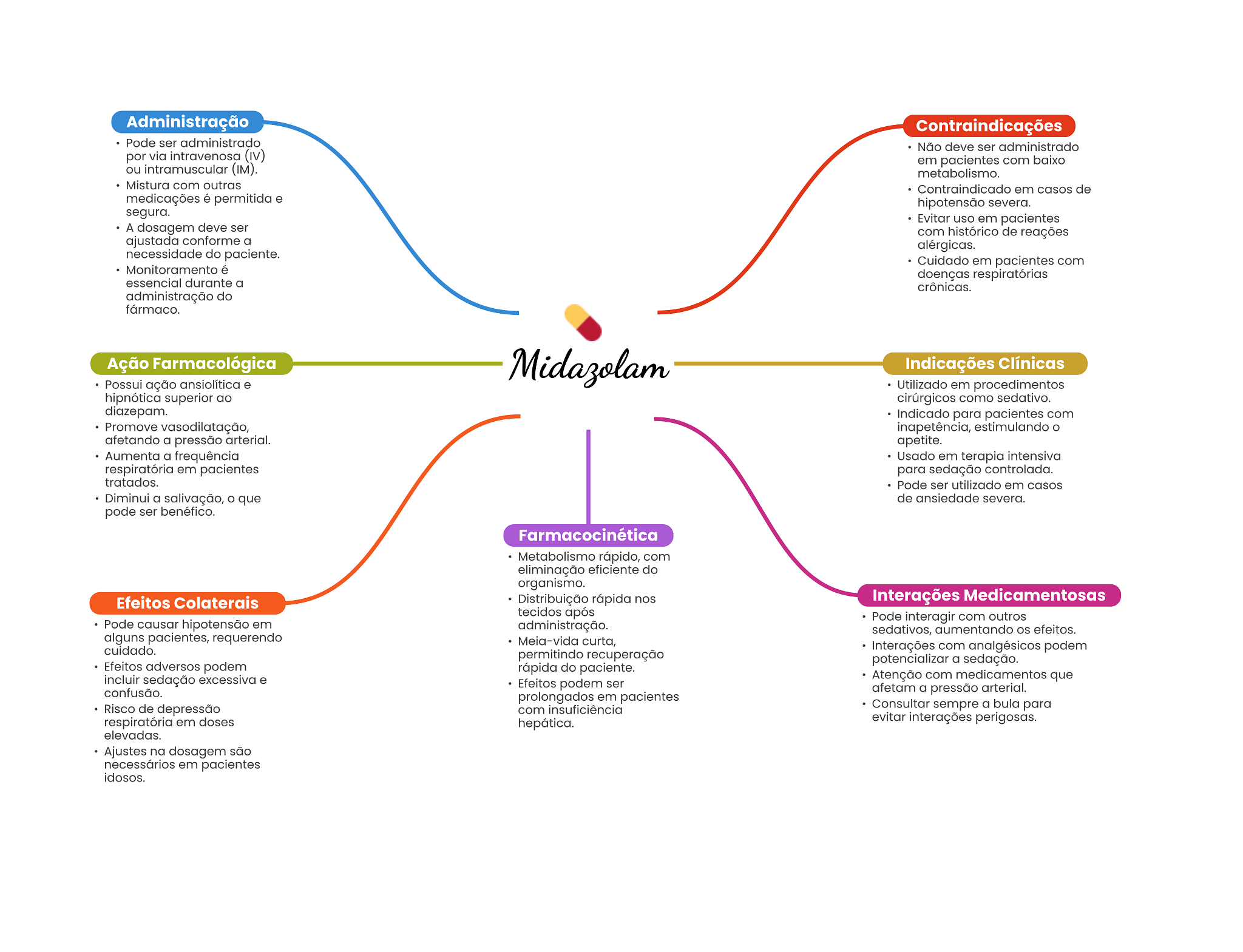 Administração Contraindicações Pode ser administrado Não deve ser administrado por via intravenosa em pacientes com baixo ou intramuscular (IM). metabolismo. Mistura com outras Contraindicado em casos de medicações é permitida e hipotensão severa. segura. Evitar uso em pacientes A dosagem deve ser com histórico de reações ajustada conforme a alérgicas. necessidade do paciente. Cuidado em pacientes com Monitoramento é doenças respiratórias essencial durante a crônicas. administração do fármaco. Ação Farmacológica Midazolam Indicações Clínicas Possui ação ansiolítica e Utilizado em procedimentos hipnótica superior ao cirúrgicos como sedativo. diazepam. Indicado para pacientes com Promove vasodilatação, inapetência, estimulando O afetando a pressão arterial. apetite. Aumenta a frequência Usado em terapia intensiva respiratória em pacientes para controlada. tratados. Pode ser utilizado em casos Diminui a salivação, O que de ansiedade severa. pode ser benéfico. Farmacocinética Metabolismo rápido, com eliminação eficiente do organismo. Efeitos Colaterais Distribuição rápida nos Interações Medicamentosas tecidos após Pode interagir com outros Pode causar hipotensão em administração. sedativos, aumentando OS efeitos. alguns pacientes, requerendo Meia-vida curta, cuidado. Interações com analgésicos podem permitindo recuperação potencializar a sedação. Efeitos adversos podem rápida do paciente. incluir sedação excessiva e Atenção com medicamentos que Efeitos podem ser confusão. afetam a pressão arterial. prolongados em pacientes Risco de depressão com insuficiência Consultar sempre a bula para respiratória em doses hepática. evitar interações perigosas. elevadas. Ajustes na dosagem são necessários em pacientes idosos.