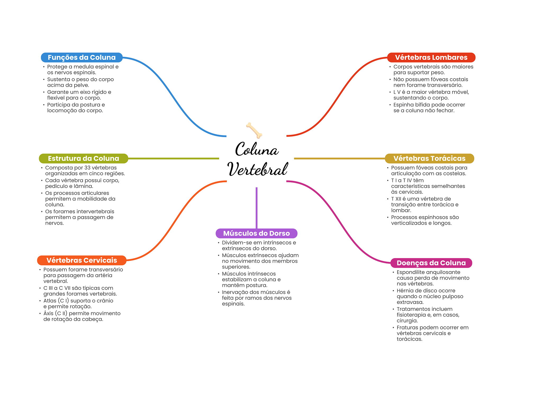 Funções da Coluna Vértebras Lombares Protege a medula espinal e Corpos vertebrais são maiores nervos espinais. para suportar peso. Sustenta peso do corpo Não possuem fóveas costais acima da pelve. nem forame transversário. Garante um eixo rígido e L V é a maior vértebra móvel, flexível para corpo. sustentando corpo. Participa da postura e Espinha bífida pode ocorrer locomoção do corpo. se a coluna não fechar. Coluna Estrutura da Coluna Vértebras Torácicas Composta por 33 vértebras Vertebral Possuem fóveas costais para organizadas em cinco regiões. articulação com as costelas. Cada vértebra possui corpo, T a T IV têm pedículo e lâmina. características semelhantes Os processos articulares às cervicais. permitem a mobilidade da T XII é uma vértebra de coluna. transição entre torácica e Os forames intervertebrais lombar. permitem a passagem de Processos espinhosos são nervos. verticalizados e longos. Músculos do Dorso Dividem-se em intrínsecos e extrínsecos do dorso. Músculos extrínsecos ajudam Vértebras Cervicais no movimento dos membros Doenças da Coluna Possuem forame transversário superiores. para passagem da artéria Músculos intrínsecos Espondilite anquilosante vertebral. estabilizam a coluna e causa perda de movimento C III a C VII são típicas com mantêm postura. nas vértebras. Inervação dos músculos é Hérnia de disco ocorre grandes forames vertebrais. feita por ramos dos nervos quando núcleo pulposo Atlas suporta crânio espinais. extravasa. e permite rotação. Tratamentos incluem Áxis (c II) permite movimento fisioterapia e, em casos, de rotação da cabeça. cirurgia. Fraturas podem ocorrer em vértebras cervicais e torácicas.