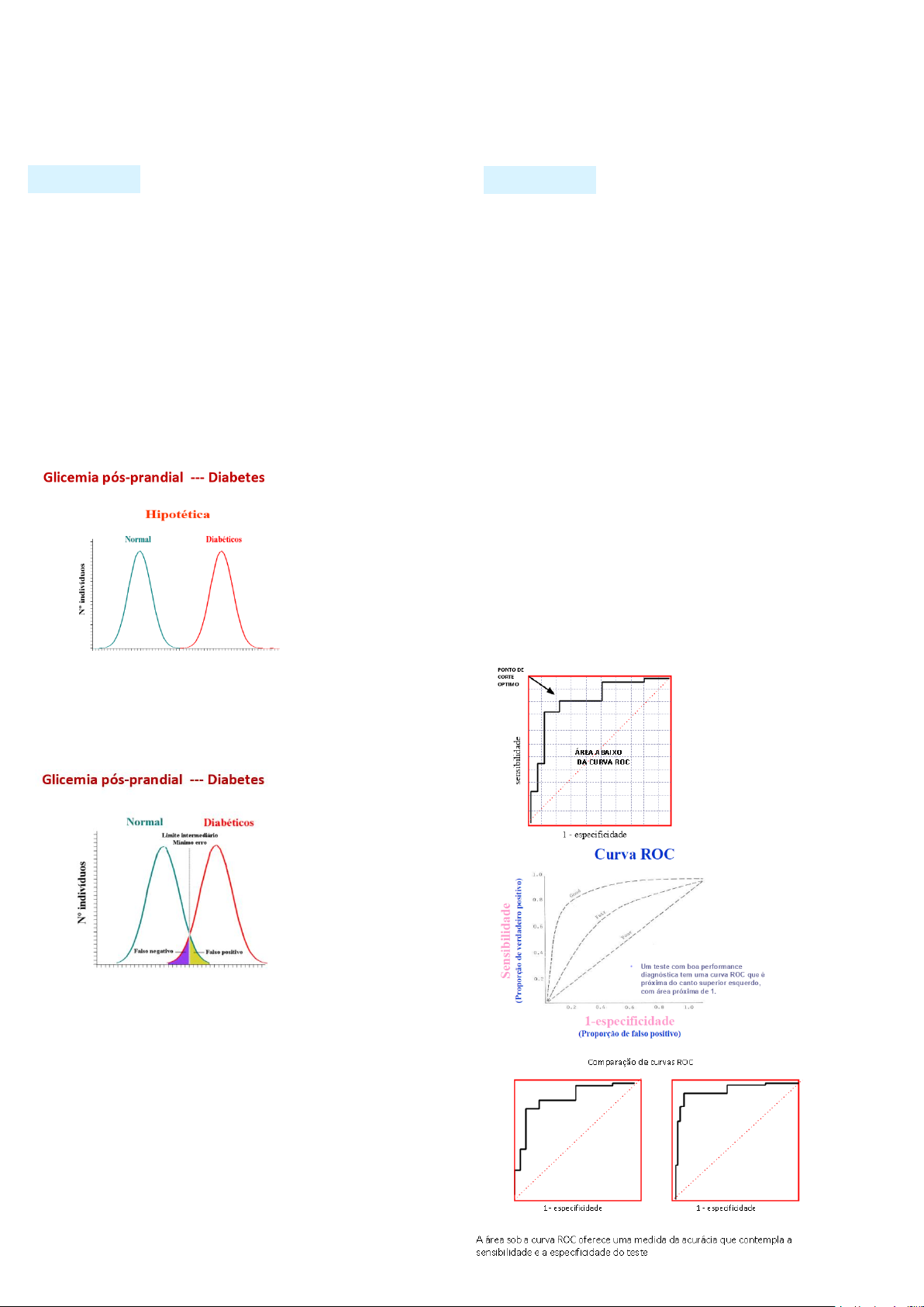 Epidemio II Aula 3 Karine 1 Anna Buchmann M4 2021.1 Teste ideal 100% sensível e 100% específico: não ocorre na prática Estipular o melhor ponto de corte (valores normais e anormais): maior sensibilidade e maior especificidade Cenário ideal: teste altamente sensível (classifica todos os doentes) e altamente específico (classifica todos os não doentes) É preciso identificar qual ponto de equilíbrio entre sensibilidade e especificidade Exemplo: O ideal seria escolher um ponto (no meio) que separe os normais dos diabéticos para conseguir fazer a classificação correta (verdadeiros positivos e verdadeiros negativos) Na realidade, as curvas se entrelaçam (sobreposição); se o ponto de corte for muito para cima, eu classifico os normais (verdadeiros negativos) certo, mas inclui alguns diabéticos nesse diagnóstico (falsos negativos); se o ponto de corte for muito pra baixo, eu classifico os diabéticos (verdadeiros positivos) certo, mas inclui normais nesse diagnóstico (falsos positivos) → o ideal é diminuir probabilidade de falsos negativos e falsos positivos (tentar se aproximar desse valor) Curva ROC Forma gráfica de plotar as informações de sensibilidade e especificidade de cada ponto de corte escolhido; excelente para mostrar acurácia de um teste Eixo Y – informações da sensibilidade (verdadeiros positivos) Eixo X – complemento da especificidade (falsos positivos) Eixo diagonal – aconteceria se a proporção de verdadeiro positivo e falso positivo fosse igual (o ideal é que a curva ROC não seja paralela ao eixo diagonal) O ideal é que a curva se aproximar do ponto superior esquerdo, para que ela consiga captar a maior quantidade de verdadeiros positivos (para cima) e menor quantidade de falsos positivos (para esquerda) → área sob a curva se aproxime do canto superior esquerdo Identifica qual melhor ponto de corte do teste → olhar ponto mais superior esquerdo (apontado no gráfico) – melhor separa os saudáveis dos doentes Avaliação de Teste diagnóstico pt. 2 Avaliação de Teste diagnóstico pt. 2 Melhor teste – C (mais superior esquerdo – maior área sobre a curva) Pior teste – A (mais próximo do eixo diagonal) Epidemio II Aula 3 Karine 2 Anna Buchmann M4 2021.1 Exemplo: Razão de verossimilhança (Liklihood ratio) Indicador que, também, junta informações de sensibilidade e especificidade num único cálculo e único valor → importante pois tem valor específico (em caso de teste), identificando, dentro dos valores, a acurácia de cada um dos pontos de corte (curva ROC é expressão gráfica da razão de verossimilhança) Cálculo: - Percentagem (probabilidade) de pessoas doentes com determinado resultado em um teste diagnóstico dividido pela percentagem de saudáveis com o mesmo resultado RV + : quantas vezes é mais provável um doente ter resultado positivo em comparação com não doente 𝑅𝑉+ = 𝑆𝑒𝑛𝑠𝑖𝑏𝑖𝑙𝑖𝑑𝑎𝑑𝑒 (𝑣𝑒𝑟𝑑𝑎𝑑𝑒𝑖𝑟𝑜 𝑝𝑜𝑠𝑖𝑡𝑖𝑣𝑜) 1 − 𝐸𝑠𝑝𝑒𝑐𝑖𝑓𝑖𝑐𝑖𝑑𝑎𝑑𝑒 (𝑓𝑎𝑙𝑠𝑜 𝑝𝑜𝑠𝑖𝑡𝑖𝑣𝑜) RV - : quantas vezes é menos provável um doente ter resultado negativo (normal) em comparação com um não doente 𝑅𝑉− = 1 − 𝑆𝑒𝑛𝑠𝑖𝑏𝑖𝑙𝑖𝑑𝑎𝑑𝑒 (𝑓𝑎𝑙𝑠𝑜 𝑛𝑒𝑔𝑎𝑡𝑖𝑣𝑜) 𝐸𝑠𝑝𝑒𝑐𝑖𝑓𝑖𝑐𝑖𝑑𝑎𝑑𝑒 (𝑣𝑒𝑟𝑑𝑎𝑑𝑒𝑖𝑟𝑜 𝑛𝑒𝑔𝑎𝑡𝑖𝑣𝑜) Bons testes têm RV + alta (quantas vezes é mais provável que o resultado positivo seja de um doente e não de uma pessoa não doente, que é o ideal – verdadeiro positivo) e RV – baixa (quantas vezes é mais provável que o resultado negativo seja de uma pessoa doente comparada com uma pessoa não doente, que não é o ideal – falso negativo) : os doentes dão resultados positivos (anormais) e os saudáveis dão resultados negativos (normais). RV+ alta > 10; RV- baixa 45 entre pessoas com dosagem de ferro normal? R: 135/150 → 90% a cada 100 pessoas sem deficiência de ferro, 90 pessoas são saudáveis Epidemio II Aula 3 Karine 3 Anna Buchmann M4 2021.1 E) Razão de verossimilhança: O quanto é mais provável que um resultado positivo (ferritina sérica ≤ 45 ocorra) entre doentes comparados a não doentes? R: RV + = 70/85 / 15/150 → 0,82/0,1 = 8,2 vezes (probabilidade da pessoas positiva ter realmente a doença é 8,2 vezes maior do que a pessoa não ter a doença) O quanto é menos provável que um resultado negativo (ferritina sérica > 45) ocorra entre doentes comparados a não doentes? R: RV - = 15/85 / 135/150 → 0,17/0,9 = 0,18 vezes (probabilidade da pessoa negativa ter anemia é 0,18 vezes maior do que a pessoa não ter a doença) Medidas de acurácia Três tipos de medidas de acurácia: - Simples: sensibilidade, especificidade e valores preditivos positivo e negativo - Combinadas: • Razões de verossimilhança positiva e negativa • Eficiência = (VN+VP) / (VN+FN+VP+FP) = percentual de acertos no total • Índice de Youden, J = Se + Esp - 1 • Odds ratio diagnóstica (a/c) / (b/d) ou ad / bc - Medida derivada da análise da Curva ROC (para medidas contínuas): área abaixo da curva Uso de múltiplos testes Raramente usamos um único teste diagnóstico para concluirmos sobre a presença de uma doença e iniciarmos o tratamento (para ter 100% de certeza). Em geral os testes são usados em conglomerados. Dois tipos básicos de testes múltiplos são usados: - Testes em paralelo → aumentam a sensibilidade. Indicados para o início da investigação diagnóstica (eu faço 3 testes ao mesmo tempo, se 1 der positivo, eu classifico paciente como doente, logo, aumenta sensibilidade; usado em emergência, tempo menor de acompanhamento) - Testes em série → aumentam a especificidade. Indicados para fazer diagnóstico diferencial (eu faço teste inicial, se der positivo, eu faço um segundo teste,