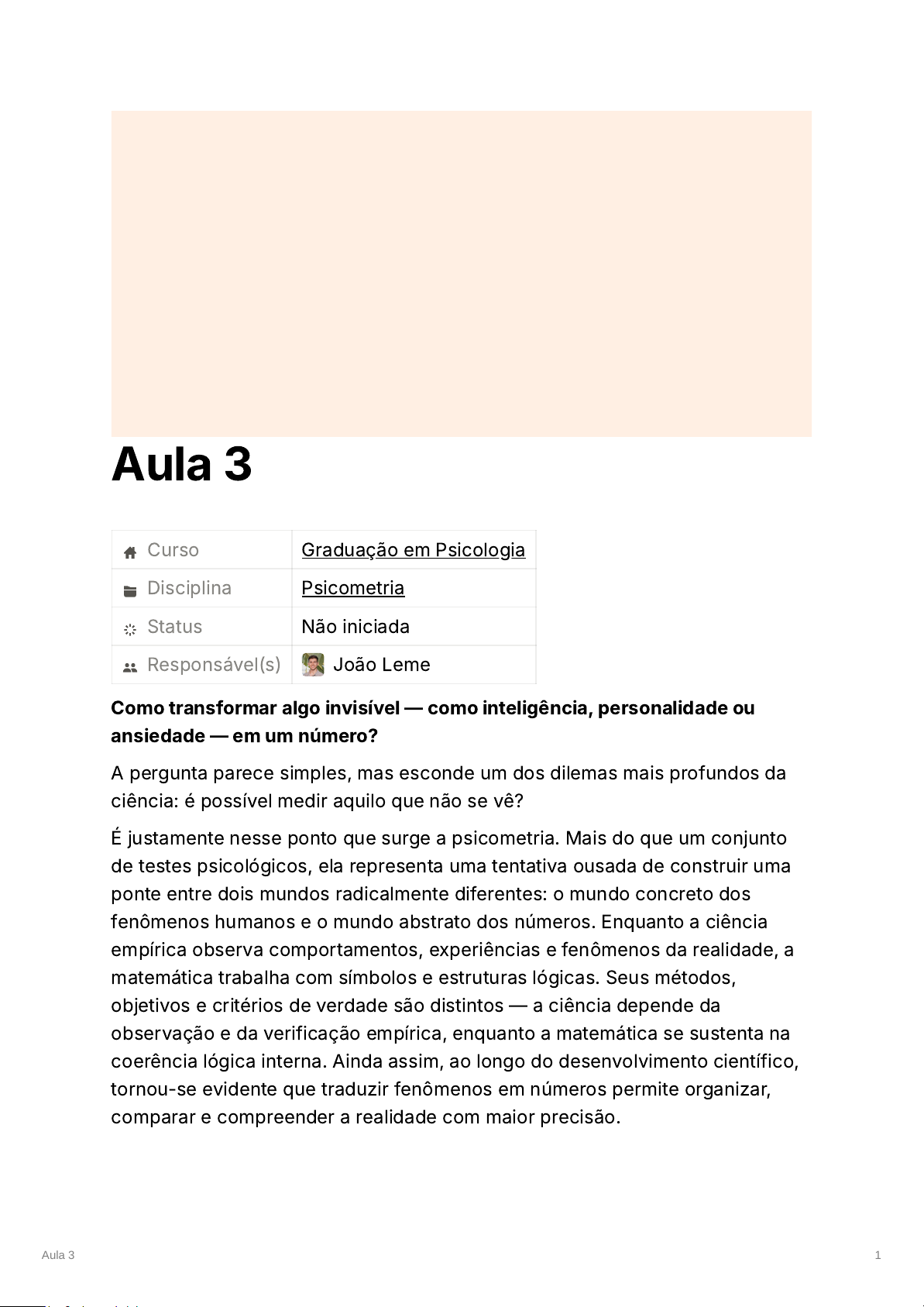 Aula 3 Curso Graduação em Psicologia Disciplina Psicometria Status Não iniciada Responsável(s) João Leme Como transformar algo invisível — como inteligência, personalidade ou ansiedade — em um número? A pergunta parece simples, mas esconde um dos dilemas mais profundos da ciência: é possível medir aquilo que não se vê? É justamente nesse ponto que surge a psicometria. Mais do que um conjunto de testes psicológicos, ela representa uma tentativa ousada de construir uma ponte entre dois mundos radicalmente diferentes: o mundo concreto dos fenômenos humanos e o mundo abstrato dos números. Enquanto a ciência empírica observa comportamentos, experiências e fenômenos da realidade, a matemática trabalha com símbolos e estruturas lógicas. Seus métodos, objetivos e critérios de verdade são distintos — a ciência depende da observação e da verificação empírica, enquanto a matemática se sustenta na coerência lógica interna. Ainda assim, ao longo do desenvolvimento científico, tornou-se evidente que traduzir fenômenos em números permite organizar, comparar e compreender a realidade com maior precisão. Aula 3 1 https://www.notion.so/Gradua-o-em-Psicologia-9473bce618aa82e6989e81be9c0be7b4?pvs=21 https://www.notion.so/Psicometria-30e3bce618aa80f2b821e9e3fa739576?pvs=21 Medir, nesse contexto, não significa simplesmente contar ou registrar valores. Medir é um ato teórico. É o processo de atribuir números às propriedades das coisas segundo regras bem definidas, garantindo que aquilo que ocorre na realidade seja preservado na representação numérica. Em outras palavras: quando a ciência decide que um fenômeno pode ser representado por números, ela precisa justificar por que essa tradução faz sentido. Esse é o primeiro grande desafio da teoria da medida: a representação. A ideia central é relativamente elegante. Se dois objetos apresentam uma relação observável — por exemplo, um é mais pesado que o outro — então a representação numérica precisa preservar essa relação. O número atribuído ao objeto mais pesado deve ser maior. Esse princípio, chamado de representação ou isomorfismo, garante que a estrutura do fenômeno observado corresponda à estrutura dos números utilizados para descrevê-lo. Quando essa correspondência falha, o número deixa de ser ciência e passa a ser apenas um símbolo arbitrário. Mas a questão não termina aí. Mesmo quando conseguimos representar um fenômeno numericamente, surge outro problema: quão preciso é esse número? Em algumas dimensões da realidade, como massa ou comprimento, os números capturam com grande fidelidade aquilo que medem. Em outras, como inteligência ou personalidade, a situação é muito mais delicada. Um escore de teste psicológico não é a própria inteligência; é apenas uma aproximação construída por meio de procedimentos específicos. Isso revela o segundo desafio da medida: a unicidade da representação. Diferentes métodos podem produzir diferentes representações numéricas de um mesmo fenômeno, e nem todas terão o mesmo grau de precisão. Há ainda um terceiro elemento inevitável: o erro. Toda medida carrega algum nível de imprecisão. Parte desse erro pode surgir da observação imperfeita, da limitação dos instrumentos ou até das variações individuais das pessoas avaliadas. Em outros casos, ele aparece de forma aparentemente aleatória, sem causa claramente identificável. O ponto crucial não é eliminar completamente o erro — algo praticamente impossível —, mas compreender seus limites e avaliar se a medida continua sendo útil para descrever o fenômeno investigado. Por trás de todos esses processos existe uma estrutura lógica mais profunda: os axiomas da medida. Esses axiomas definem propriedades fundamentais dos números — como identidade, ordem e aditividade — e funcionam como as regras básicas do jogo matemático. Quando a ciência decide medir algo, ela Aula 3 2 precisa garantir que as operações realizadas no mundo empírico respeitem essas mesmas propriedades. Se dizemos que um objeto é maior que outro, por exemplo, essa ordem precisa permanecer coerente quando traduzida em números. Caso contrário, a medida perde sua validade. Essa discussão revela um ponto frequentemente ignorado: muitos fenômenos naturais diferem qualitativamente entre si. Cor, peso, temperatura ou aroma são qualidades distintas de um mesmo objeto. No entanto, cada uma dessas qualidades pode variar em intensidade. É essa variação — essa mudança de magnitude dentro de um mesmo atributo — que torna a medida possível. Não podemos afirmar que uma rosa é “mais rosa” que outra, mas podemos dizer que ela é mais pesada, mais longa ou mais aromática. É nessa transição entre qualidade e quantidade que a ciência encontra espaço para medir. No fundo, a psicometria é um exercício contínuo de humildade científica. Ela reconhece que números não capturam a totalidade da experiência humana, mas ainda assim aposta que podem revelar padrões, relações e estruturas invisíveis a olho nu. Quando um fenômeno psicológico se transforma em escala, índice ou pontuação, não estamos reduzindo a complexidade da mente humana — estamos tentando criar uma linguagem que permita investigá-la. E talvez seja essa a provocação mais interessante de todas: toda medida é, ao mesmo tempo, uma revelação e uma simplificação. Ao transformar o mundo em números, ganhamos clareza, comparação e método. Mas também assumimos um risco silencioso — o de esquecer que, por trás de cada número, ainda existe um fenômeno muito mais rico do que qualquer escala consegue capturar. No fim das contas, medir não é apenas calcular. É interpretar o mundo. E a verdadeira questão talvez não seja se podemos transformar fenômenos humanos em números, mas até que ponto estamos preparados para entender o que esses números realmente significam. Aula 3 3