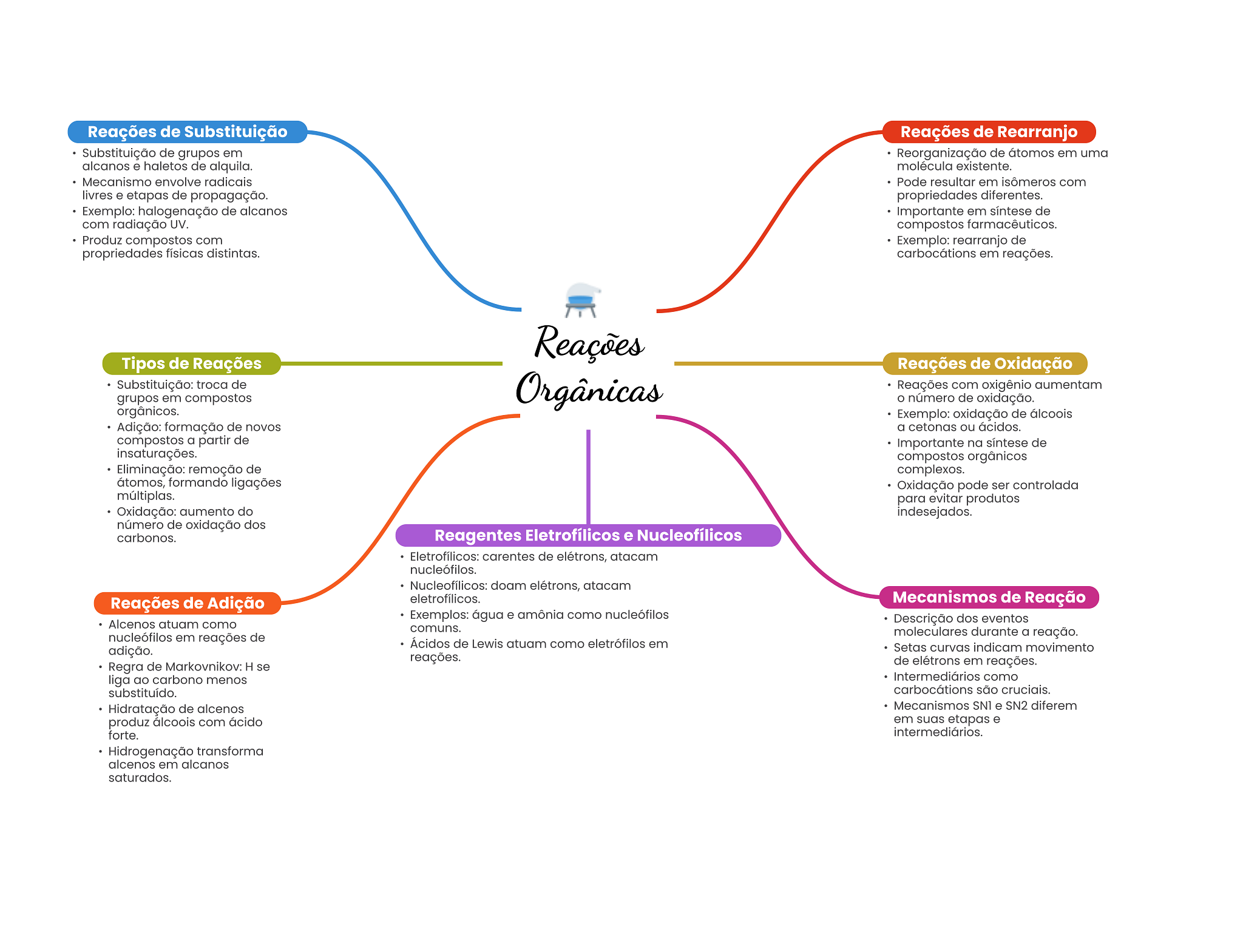 Reações de Substituição Reações de Rearranjo Substituição de grupos em Reorganização de átomos em uma alcanos e haletos de alquila. molécula existente. Mecanismo envolve radicais Pode resultar em isômeros com livres e etapas de propagação. propriedades diferentes. Exemplo: halogenação de alcanos Importante em síntese de com radiação UV. compostos farmacêuticos. Produz compostos com Exemplo: rearranjo de propriedades físicas distintas. carbocátions em reações. Reações Tipos de Reações Reações de Oxidação Substituição: troca de grupos em compostos Orgânicas Reações com oxigênio aumentam O número de oxidação. orgânicos. Exemplo: oxidação de álcoois Adição: formação de novos a cetonas ou ácidos. compostos a partir de Importante na síntese de insaturações. compostos orgânicos Eliminação: remoção de complexos. átomos, formando ligações Oxidação pode ser controlada múltiplas. para evitar produtos Oxidação: aumento do indesejados. número de oxidação dos carbonos. Reagentes Eletrofílicos e Nucleofílicos Eletrofílicos: carentes de elétrons, atacam nucleófilos. Nucleofílicos: doam elétrons, atacam Reações de Adição eletrofílicos. Mecanismos de Reação Exemplos: água e amônia como nucleófilos Alcenos atuam como Descrição dos eventos comuns. nucleófilos em reações de moleculares durante a reação. Ácidos de Lewis atuam como eletrófilos em adição. Setas curvas indicam movimento reações. Regra de Markovnikov: H se de elétrons em reações. liga ao carbono menos Intermediários como substituído. carbocátions são cruciais. Hidratação de alcenos Mecanismos e SN2 diferem produz álcoois com ácido em suas etapas e forte. intermediários. Hidrogenação transforma alcenos em alcanos saturados.