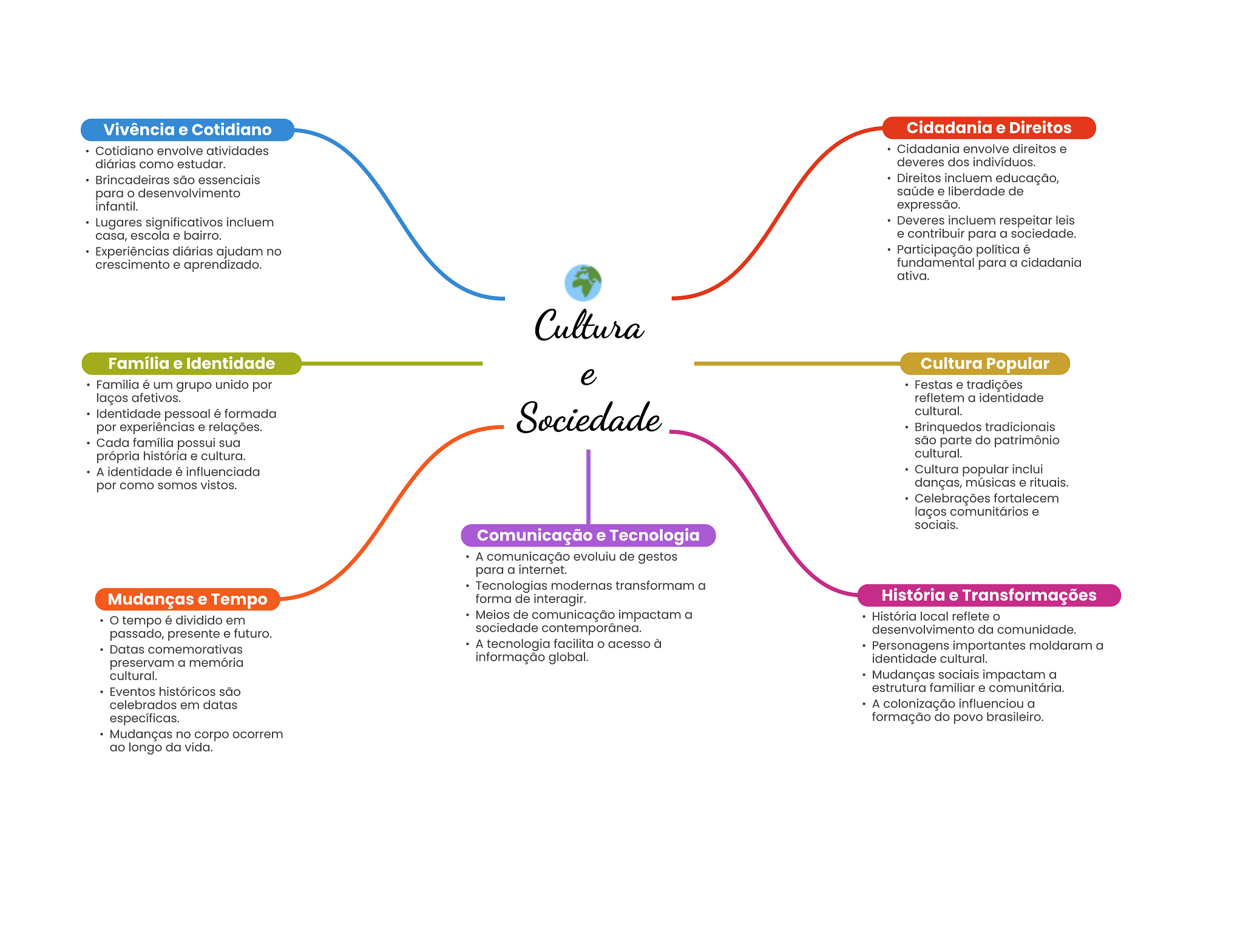 Vivência e Cotidiano Cidadania e Direitos Cotidiano envolve atividades Cidadania envolve direitos e diárias como estudar. deveres dos indivíduos. Brincadeiras são essenciais Direitos incluem educação, para desenvolvimento saúde e liberdade de infantil. expressão. Lugares significativos incluem Deveres incluem respeitar leis casa, escola e bairro. e contribuir para a sociedade. Experiências diárias ajudam no Participação política é crescimento e aprendizado. fundamental para a cidadania ativa. Cultura Família e Identidade Cultura Popular e Família é um grupo unido por Festas e tradições laços afetivos. refletem a identidade Identidade pessoal é formada Sociedade cultural. por experiências e relações. Brinquedos tradicionais Cada família possui sua são parte do patrimônio própria história e cultura. cultural. A identidade é influenciada Cultura popular inclui por como somos vistos. danças, músicas e rituais. Celebrações fortalecem laços comunitários e sociais. Comunicação e Tecnologia A comunicação evoluiu de gestos para a internet. Tecnologias modernas transformam a Mudanças e Tempo forma de interagir. História e Transformações tempo é dividido em Meios de comunicação impactam a História local reflete passado, presente e futuro. sociedade contemporânea. desenvolvimento da comunidade. Datas comemorativas A tecnologia facilita acesso à Personagens importantes moldaram a preservam a memória informação global. identidade cultural. cultural. Mudanças sociais impactam a Eventos históricos são estrutura familiar e comunitária. celebrados em datas A colonização influenciou a específicas. formação do povo brasileiro. Mudanças no corpo ocorrem ao longo da vida.