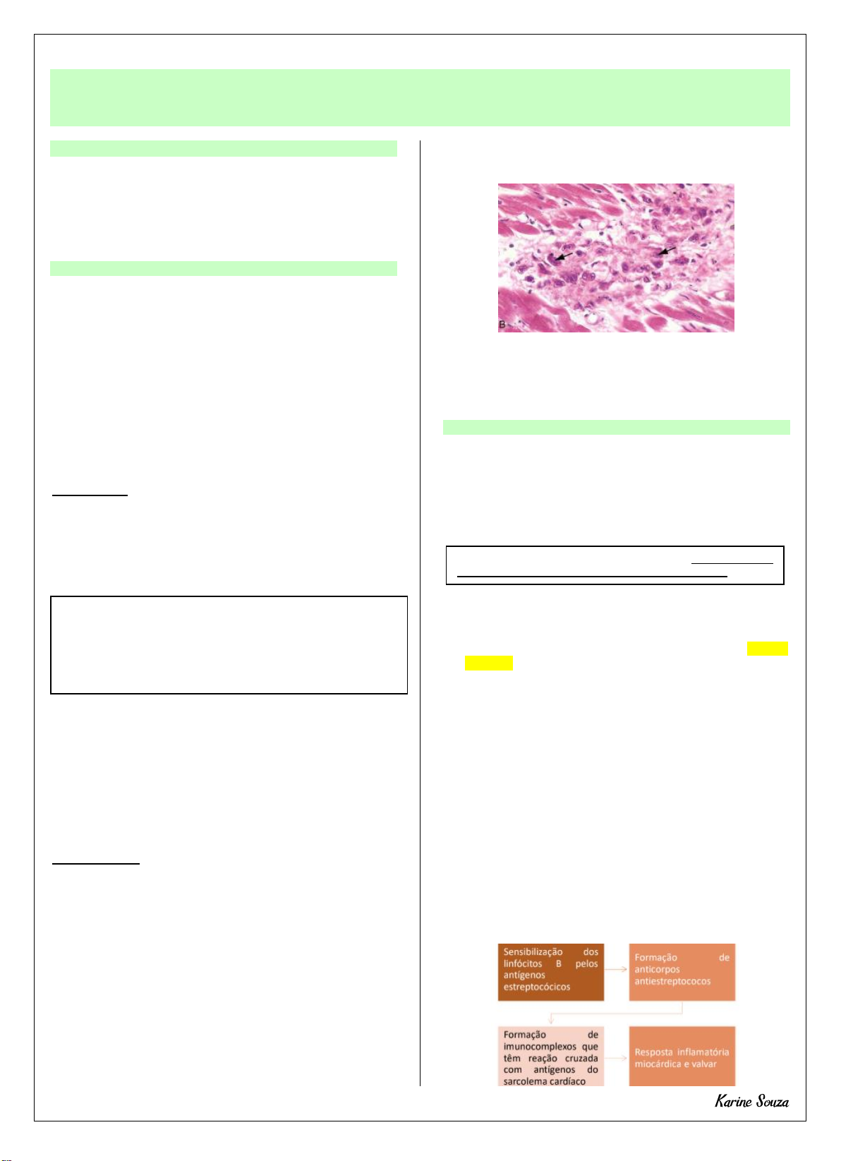 Febre Reumática OBJETIVOS Estudar a etiofisiopatogênese e resposta imunológica na febre reumática. Entender as manifestações clínicas e complicações na febre reumática. Compreender as valvopatias. ETIOFISIOPATOGÊNESE É uma doença inflamatória aguda, multissistêmica, mediada pelo sistema imunológico, que ocorre após infecção por estreptococos b-hemolíticos do grupo A (geralmente após uma faringite). A FR está associada a inflamações de todas as partes do coração, mas a inflamação e a cicatrização das valvas produzem as características clínicas mais importantes. Após essa inflamação acontecem problemas valvares crônicos, que acarretam disfunção cardíaca irreversível e, em alguns casos, causam insuficiência cardíaca fatal depois de alguns anos. PATOGENIA A febre reumática aguda é uma reação de hipersensibilidade classicamente atribuída a anticorpos contra moléculas dos estreptococos do grupo A que também reagem de modo cruzado com antígenos do hospedeiro. O atraso característico de 2-3 semanas até o início dos sintomas após a infecção é explicado como sendo o tempo necessário para a produção da resposta imune: não há estreptococos nas lesões. Apenas a pequena minoria de pacientes infectados desenvolve febre reumática (aprox. 3%), é provável que haja suscetibilidade genética que influencia o desenvolvimento das respostas imunes cruzadas. MORFOLOGIA A febre reumática aguda é caracterizada por focos inflamatórios isolados em diferentes tecidos. Nódulos de Aschoff: o São lesões inflamatórias encontradas no miocárdio e são consideradas o patognomônicos (sinal ou sintoma específico de uma doença) da febre reumática. o Consistem em acúmulos de linfócitos, plasmócitos dispersos e macrófagos volumosos ativados (células de Anitschkow). Durante a febre reumática aguda, os nódulos de Aschoff podem ser encontrados em qualquer uma das três camadas do coração: pericárdio, miocárdio ou endocárdio (inclusive nas valvas). - Aspecto microscópico de um nódulo de Aschoff; há necrose central associada a uma coleção circunscrita de células inflamatórias mononucleares, que incluem alguns macrófagos ativados com nucléolos proeminentes e cromatina central ondulada (cromatina em lagarta) (setas). RESPOSTA IMUNOLÓGICA A infecção por S. pyogenes causa a ativação do sistema imune na tentativa de eliminar o patógeno agressor. Nessa ativação, são recrutados linfócitos B (imunidade adquirida humoral), que se transformam em plasmócitos e produzem, então, anticorpos contra o microorganismo em questão. Os anticorpos produzidos (anticorpos antiestreptocócicos) atacam a bactéria para o qual foram especificamente criados, mas também atacam algumas células do próprio organismo, denominada reação cruzada. o Porque isso acontece? Os antígenos são semelhantes e os anticorpos se ligam em ambos. Já que a bactéria S. pyogenes faz mimetismo molecular com células do organismo que estão tecido cardíaco (valvas potencialmente), articulações, SNC, tecido celular subcutâneo. Os anticorpos antiestreptocócicos, então, reagem cruzadamente com autoantígenos e desencadeiam respostas inflamatórias pela ativação do sistema complemento e mediadas por citocinas (interferona- gama e fator de necrose tumoral-alfa). IMPORTANTE: a bactéria que é atacada pelo organismo continua no local da infecção, mas os anticorpos ao passarem por outras regiões do corpo onde existem células próprias com características semelhantes, também atacam esses locais (ex. coração, que possui miosina cardíaca, que faz o mimetismo com a proteína M da bactéria). - Porque isso ocorre? Os anticorpos dirigidos contra a proteína M de algumas cepas dos estreptococos têm reatividade cruzada com os antígenos glicoproteicos do coração, das articulações e de outros tecidos, produzindo uma reação autoimune por um fenômeno conhecido como mimetismo molecular. - Os anticorpos são proteínas e, portanto, não conseguem diferenciar antígenos próprios de antígenos estranhos. COMPLICAÇÕES - PANCARDITE (inflamação generalizada do pericárdio, miocárdio e válvulas cardíacas). O pericárdio exibe um exsudato fibrinoso, que geralmente desaparece sem deixar sequelas. O envolvimento do miocárdio — miocardite — manifesta- se na forma de nódulos de Aschoff dispersos no interior do tecido conjuntivo intersticial. O envolvimento valvar resulta em necrose fibrinoide e deposição de fibrina ao longo das linhas de fechamento que formam vegetações de 1-2 mm — verrugas — que perturbam pouco o funcionamento do coração. - Vegetações pequenas (verrugas) são visíveis ao longo da linha de fechamento das válvulas da valva atrioventricular esquerda (setas). Episódios prévios de valvite reumática causaram espessamento fibroso e fusão das cordas tendíneas. - CARDIOPATIA REUMÁTICA CRÔNICA Caracterizada pela organização da inflamação aguda e pela subsequente cicatrização. Os nódulos de Aschoff são substituídos por cicatrizes fibrosas, de modo que essas lesões raramente são vistas na cardiopatia reumática crônica. As válvulas das valvas tornam-se espessadas e retraídas de modo permanente. - Estenose mitral com espessamento fibroso difuso e deformação das válvulas da valva, fusão das comissuras (setas) e espessamento e encurtamento das cordas tendíneas. - Presença neovascularização inflamatória. - ESTENOSE E A REGURGITAÇÃO VALVAR São as complicações mais importantes da DCR. VALVAS A valva atrioventricular esquerda (mitral) sozinha está afetada em 70% dos casos. A valva atrioventricular esquerda e a valva da aorta estão comprometidas em 25% dos casos. A valva atrioventricular direita (tricúspide) é afetada com menor frequência (e com menor gravidade). A valva do tronco pulmonar quase sempre escapa da lesão. ESTENOSE MITRAL Na estenose mitral intensa, o átrio esquerdo dilata-se progressivamente 