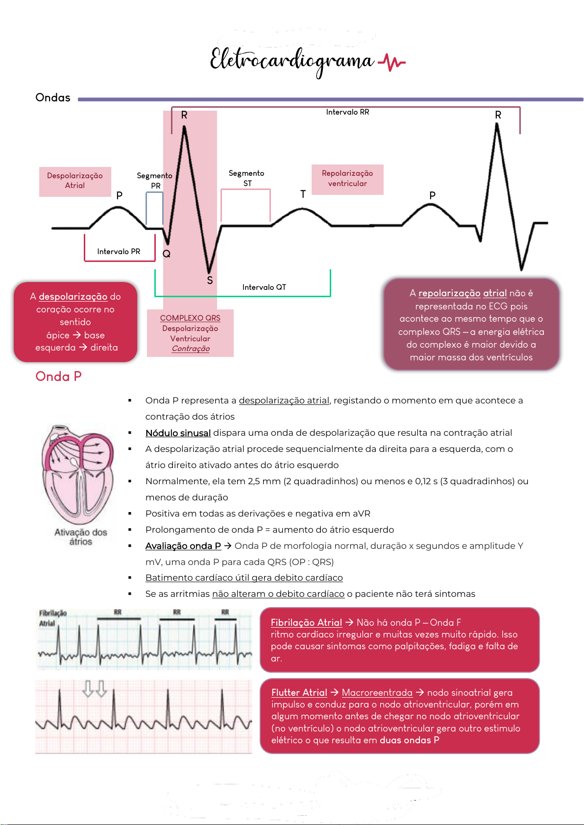 Enfermagem Médica - 2021 Ondas Onda P P Q S R T Intervalo PR Intervalo QT P R Intervalo RR Segmento PR Segmento ST Despolarização Atrial COMPLEXO QRS Despolarização Ventricular Contração Repolarização ventricular A repolarização atrial não é representada no ECG pois acontece ao mesmo tempo que o complexo QRS – a energia elétrica do complexo é maior devido a maior massa dos ventrículos ▪ Onda P representa a despolarização atrial, registando o momento em que acontece a contração dos átrios ▪ Nódulo sinusal dispara uma onda de despolarização que resulta na contração atrial ▪ A despolarização atrial procede sequencialmente da direita para a esquerda, com o átrio direito ativado antes do átrio esquerdo ▪ Normalmente, ela tem 2,5 mm (2 quadradinhos) ou menos e 0,12 s (3 quadradinhos) ou menos de duração ▪ Positiva em todas as derivações e negativa em aVR ▪ Prolongamento de onda P = aumento do átrio esquerdo ▪ Avaliação onda P → Onda P de morfologia normal, duração x segundos e amplitude Y mV, uma onda P para cada QRS (OP : QRS) ▪ Batimento cardíaco útil gera debito cardíaco ▪ Se as arritmias não alteram o debito cardíaco o paciente não terá sintomas A despolarização do coração ocorre no sentido ápice → base esquerda → direita Fibrilação Atrial → Não há onda P – Onda F ritmo cardíaco irregular e muitas vezes muito rápido. Isso pode causar sintomas como palpitações, fadiga e falta de ar. Flutter Atrial → Macroreentrada → nodo sinoatrial gera impulso e conduz para o nodo atrioventricular, porém em algum momento antes de chegar no nodo atrioventricular (no ventrículo) o nodo atrioventricular gera outro estimulo elétrico o que resulta em duas ondas P Baixado por Nathallia Godoy (nathallia.tsgodoy@gmail.com) lOMoARcPSD|26810780 https://www.studocu.com/pt-br?utm_campaign=shared-document&utm_source=studocu-document&utm_medium=social_sharing&utm_content=eletrocardiograma-resumo-a-respeito-de-ecg Enfermagem Médica - 2021 Complexo QRS ▪ Representa a despolarização ventricular ▪ A onda Q é a primeira deflexão negativa após a onda P. A onda Q normalmente tem menos de 0,04 s de duração ▪ A onda R é a primeira deflexão positiva após a onda P, e a onda S é a primeira deflexão negativa após a onda R ▪ Primeira porção do QRS representa a despolarização do nodo atrioventricular ▪ Quando o complexo QRS não é observado no ECG pode indicar parada ventricular ▪ Duração: 0,06 a 0,12s → duração QRS normal: 1 a 3 quadradinhos ▪ Duração maior que 0,12s (+3 quadrinhos) indica que os ventrículos estão se despolarizando em tempos diferentes → bloqueio de ramo (feixe de his e fibras de purkinje) ▪ Linha R é positiva e vai ampliando de altitude nas precordiais ▪ Linha Q nem sempre é visível ▪ QS → sinal de necrose → completamente negativo, sem a presença de uma onda positiva ▪ Q Profundo → células do miocárdio sofreram infarto passado e necrose Taquicardia supraventricular frequências Cardíacas altas, geralmente rítmica, e sua principal característica é a presença de complexos QRS estreitos Taquicardia ventricular sem pulso não gera debito cardíaco, ritmo de parada cardiorrespiratório Extrassístole ventricular Estimulo elétrico extra - Estímulos ectópicos gerados nos ventrículos - despolarização ventricular prematura (dois complexos QRS) Com o passar do tempo prejudica o debito cardíaco e pode formar trombos Baixado por Nathallia Godoy (nathallia.tsgodoy@gmail.com) lOMoARcPSD|26810780 Enfermagem Médica - 2021 Onda T Onda U Intervalos e Segmentos Intervalo PR e Segmento PR ▪ Representa a fase de repolarização dos ventrículos, quando as fibras ventriculares começam a relaxar ▪ Ocorre quando as células recuperam uma carga negativa; estado de repouso ▪ Positiva em todas as derivações e negativas em aVR ▪ É assimétrica, porém sempre arredondadas ▪ Amplitude máxima nas derivações periféricas = 5mm ▪ Amplitude máxima nas derivações precordiais = 15mm ▪ Onda T grande e pontiaguda → desequilíbrio hidroelétrico → Hiperpotassemia ▪ Ausência de T → Taquicardia elevada ▪ Acredita-se que a onda U represente a repolarização das fibras de Purkinje, porém algumas vezes ela é observada em pacientes com hipopotassemia (níveis baixos de potássio), hipertensão ou doença cardíaca. ▪ Hiperpolarização ▪ Baixa voltagem e pequena ▪ Pode ser visível nas derivações precordiais após a onda T ▪ O intervalo PR é medido a partir do início da onda P até o início do complexo QRS ▪ Representa o tempo necessário para estimulação do nodo sinoatrial, despolarização atrial e condução através do nodo AV antes da despolarização ventricular ▪ Condução do estimulo elétrico do átrio para o ventrículo (NSA → NAV) ▪ Tempo de condução do impulso elétrico desde o nodo sinoatrial até os ventrículos ▪ Em adultos, o intervalo PR normalmente varia de 0,12 a 0,16 de duração (3 a 4 quadradinhos) ▪ Segmento isoelétrico – não tem amplitude – não tem diferença de eletricidade Complexo PR maior que 0,16 segundos Baixado por Nathallia Godoy (nathallia.tsgodoy@gmail.com) lOMoARcPSD|26810780 https://www.studocu.com/pt-br?utm_campaign=shared-document&utm_source=studocu-document&utm_medium=social_sharing&utm_content=eletrocardiograma-resumo-a-respeito-de-ecg Enfermagem Médica - 2021 ▪ Alterações no intervalo → estímulo não é conduzido pelo nodo sinoatrial → resulta em uma frequência cardíaca aumentada ou diminuída Intervalo QT Segmento ST ▪ Representa o tempo total para a despolarização e repolarização ventriculares ▪ É medido a partir do início do complexo QRS até o término da onda T ▪ O intervalo QT varia com a frequência cardíaca, sexo e idade ▪ O intervalo QT geralmente é de 0,32 a 0,40 s de duração quando a frequência cardíaca está entre 65 e 95 bpm ▪ Qu