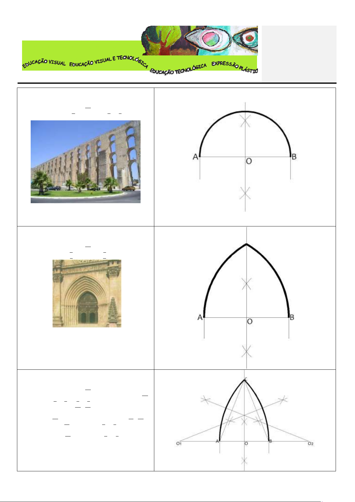 ESCOLA BÁSICA INTEGRADA DA QUINTA DO CONDE EDUCAÇÃO VISUAL TRAÇADOS RIGOROSOS ARCOS ARCO ROMANO OU DE VOLTA INTEIRA (dado o vão) 1. Dado o segmento de recta AB (vão), achar a sua mediatriz. 2. Com centro no pto O e abertura até A ou B traçar a semi- circunferência que forma o arco. Arco largamente utilizado pelos Romanos nas suas construções em pedra: pontes, aquedutos, arcos de triunfo, termas, basílicas, etc. ARCO EM OGIVA PERFEITA (dado o vão) 1. Dado o segmento de recta AB (vão), achar a sua mediatriz 2. Com centro no pto A e abertura até B traçar um arco 3. Com centro no pto B a abertura até A traçar o outro lado do arco. Na Idade Média, o arco em ogiva, possibilitou a elevação da flecha dos arcos, permitindo ao mesmo tempo suportar melhor as cargas a que estavam sujeitos. Na arquitectura gótica, vamos encontrar a utilização deste arco nos monumentos, imprimindo- lhes características de verticalidade. ARCO EM OGIVA PERFEITA (dado o vão e a flecha) 1. Dado o segmento de recta AB (vão), achar a sua mediatriz. 2. Marcar a altura da flecha na mediatriz (segmento recta OC). 3. Unir o pto A ao C e o B ao C . Achar as mediatrizes destes sergmentos de recta (AC e BC). 4. Prolongar as mediatrizes até que estas encontrem o segmento AB. Onde isso acontece estão os ptos O1 e O2. 5. Com centro em O1 e abertura até B ou C traçar o lado do arco. 6. Com centro em O2 e abertura até A ou C, traçar o outro lado do arco. ARCO CONTRACURVADO (dado o vão) 1. Dado o vão (segmento de recta AB), achar a sua mediatriz. 2. Com centro no pto O1 e abertura até A ou B traçar uma semi-circunferência. 3. Com a mesma abertura e centro no pto A traçar um arco de O1 até cruzar com a semi-circunferência desenhada anteriormente (pto O2). Fazer o mesmo com centro em B (pto O3). 4. Ainda com a mesma abertura e centro em O2, traçar um arco acima da semi circunferência. Fazer o mesmo no pto O3. 5. Com centro em O4 e a mesma abertura, traçar dois arcos que se cruzem com os desenhados anteriormente (dão origem aos ptos O5 e O6). 6. Com centro nestes ptos e sempre a mesma abertura, traçar os últimos arcos que vão de O4 a O2 e de O4 a O3. Com a evolução dos processos construtivos dos arcos, a sua forma alterou-se, dando lugar a novos estilos arquitectónicos e decorativos. No final da Idade Média , surge o arco contracurvado ou de querena, que marcou o final do estilo gótico e foi também utilizado pela arquitectura manuelina. ARCO ABATIDO (dado o vão e a flecha) 1. Dado o segmento de recta AB, achar a sua mediatriz. A partir do ponto D marcar a altura da flecha, (pto C). 2. Unir o pto C aos A e B. 3. Com centro em D, traçar um arco que acaba na mediatriz (pto E). Com centro em C e abertura até E traçar uma “semi-circunferência” até aos segmentos de recta AC e CB. Encontram-se os ptos F e G. 4. Achar a mediatriz dos segmentos AF e BG, que se prolongam até encontrar a mediatriz que divide o segmento AB (encontra-se o pto O1). 5. Onde esta recta cruza o segmento AB temos os ptos O2 e O3. 6. Com centro em O1 e abertura até C traçamos a 1ª parte do arco. 7. Com centros em O2 e O3, fecha-se o arco. Com o declínio da arte gótica, houve um regresso à horizontalidade, que é uma característica da arte clássica. Assim, com a preocupação de ressurgir os ideais da cultura clássica no período do Renascimento, os arquitectos procuravam novas formas, sendo uma delas o arco abatido, imprimindo às construções características de horizontalidade.