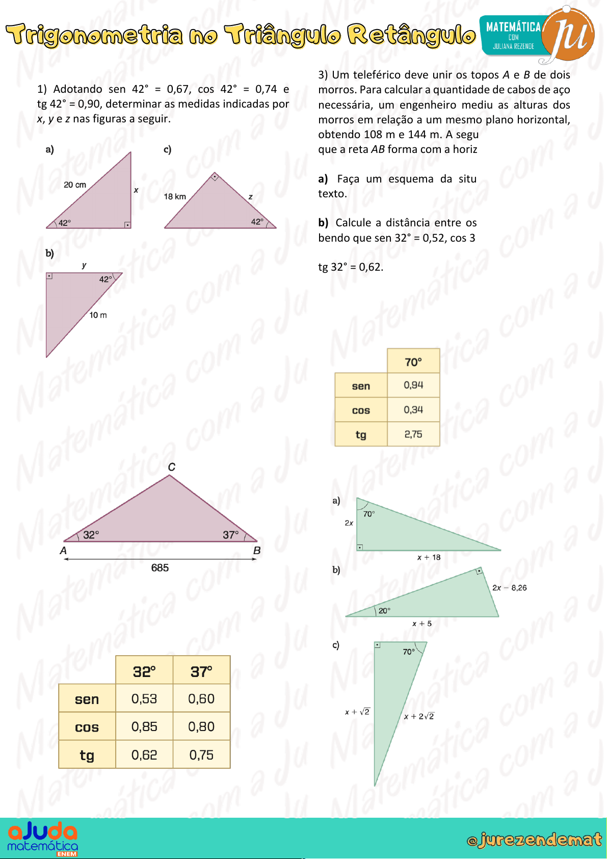 1) Adotando sen 42° = 0,67, cos 42° = 0,74 e tg 42° = 0,90, determinar as medidas indicadas por x, y e z nas figuras a seguir. 2) Em um porto, o cais reto AB tem 685 m de com- primento e pode ser considerado no mesmo nível do mar. Dos pontos A e B, vê-se uma ilhota C tal que CÂB = 32° e 𝐶𝐵#𝐴 = 37°, conforme a figura: Adotando os valores apresentados na tabela abaixo, calcular a distância entre a ilhota e o cais. 3) Um teleférico deve unir os topos A e B de dois morros. Para calcular a quantidade de cabos de aço necessária, um engenheiro mediu as alturas dos morros em relação a um mesmo plano horizontal, obtendo 108 m e 144 m. A seguir, mediu o ângulo que a reta AB forma com a horizontal, obtendo 32° a) Faça um esquema da situação proposta no texto. b) Calcule a distância entre os pontos A e B, sa- bendo que sen 32° = 0,52, cos 32° = 0,84 e tg 32° = 0,62. 4) Calcule a medida desconhecida x, em cada um dos triângulos a seguir, usando a tabela: 5) Na figura abaixo, ∝ é uma medida em grau. De- termine a medida x, em centímetro, usando, se ne- cessário, os valores da tabela: 6) Obtenha o valor de x na figura sabendo que sen∝ = 0,6 e cos ∝ = 0,8. 7) A âncora de um barco pesqueiro, depois de lançada, atingiu o fundo do rio. Como a profundi- dade do rio nesse ponto é menor que o compri- mento da corda que prende a âncora ao barco, este se moveu 20 m em relação ao ponto A, de onde foi lançada a âncora, esticando completamente a corda, que formou um ângulo agudo de medida a com a superfície do rio tal que sen ∝ = 5/13. Calcu- lar a profundidade do rio nesse ponto. 8) Em um cinema, os olhos de um espectador estão no mesmo plano horizontal que contém a base da tela vertical de 3,2 m de altura, conforme mostra a figura a seguir. O espectador vê toda a extensão vertical da tela sob um ângulo agudo de medida ∝ tal que cos ∝ = 15/17 a)Calcule o valor da tg∝. b) Calcule a distância entre os olhos do espectador e a base da tela. GABARITO 1) A) x = 13,4 b) y = 7,4 c) z = 20 2) a distância entre a ilhota e o cais é 232,5 m 3) aproximadamente 69,23 m 4) a) 4 b) 6 c) !!√# $ 5) aproximadamente 15,19 6) 7/9 7) aproximadamente 8,3 8) a) 8/15 b) 6m