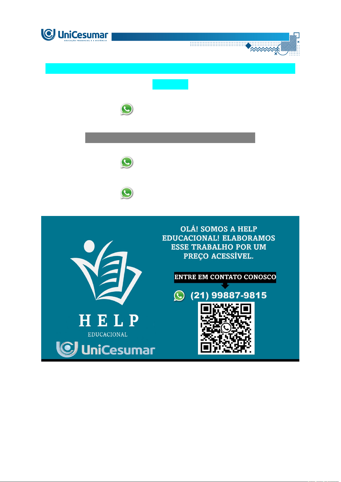 ATIVIDADE 1 – EPROD – ESTÁGIO SUPERVISIONADO II - 51_2026 (21) 99887-9815 ASSESSORIA NOS SEUS TRABALHOS (21) 99887-9815 (21) 99887-9815 Prezado estudante, nesta atividade você deverá elaborar o PLANO DE ATIVIDADE de estágio. No plano de atividades é onde você deverá descrever as atividades a serem desenvolvidas, os horários de realização dessas atividades, qual o profissional que te supervisionará nesse desenvolvimento etc. Para realizar essa atividade, no material da disciplina, baixe o arquivo “Plano de Atividades de Estágio” que contenha o nome do seu orientador. Caso tenha dúvida quanto ao seu orientador, verifique a lista de orientadores que está disponível no fórum da disciplina. Atenção: Caso seu Supervisor Externo tenha formação diferente da graduação que você está cursando, você deverá enviar juntamente (no mesmo arquivo) com o Plano de Atividades de Estágio uma declaração que comprove que seu Supervisor exerça atividades e tenha experiência para lhe acompanhar nesse momento tão importante de sua jornada acadêmica. O template da declaração de experiência, que deverá ser preenchida e devidamente assinada, encontra-se no material da disciplina. SERÃO INVALIDADOS: • Planos de Atividades sem indicação de formação do supervisor; • Planos de Atividades sem declaração de experiência do supervisor no caso de supervisores com formação distinta da graduação em curso pelo aluno; • Planos de Atividades sem assinaturas válidas; • Planos de Atividades sem apresentação de atividades a serem realizadas no estágio – que devem estar conforme a graduação em curso; • Planos de Atividades com carga horária de estágio maior que 6 horas por dia ou 30 horas semanais. LEMBRE-SE QUE O ESTÁGIO CONTEMPLA ENTREGA DE ATIVIDADES, NO STUDEO, E DOCUMENTOS, NO PORTAL DE ESTÁGIO. SEM A ENTREGA E DEFERIMENTO DA DOCUMENTAÇÃO OBRIGATÓRIA (NO PORTAL DO ESTÁGIO), A NOTA REFERENTE A DISCIPLINA DE ESTÁGIO, OBTIDA PELAS ATIVIDADES, NÃO SERÁ LANÇADA E, CONSEQUENTEMENTE, O ESTUDANTE SERÁ REPROVADO. PARA APROVAÇÃO NA DISCIPLINA É OBRIGATÓRIO: • TERMO DE CONVÊNIO – Documento INICIAL a ser enviado na criação de proposta de estágio no PORTAL DE ESTÁGIO; • TERMO DE COMPROMISSO - Documento INICIAL a ser enviado na criação de proposta de estágio no PORTAL DE ESTÁGIO; • FICHA DE FREQUÊNCIA E AVALIAÇÃO - Documento FINAL a ser enviado no contrato de estágio, após aprovação da proposta, no PORTAL DE ESTÁGIO; • ATIVIDADE 1 (Plano de Atividades) – Atividade de estudo INICIAL a ser enviada no STUDEO; • ATIVIDADE 2 (Relatório de Estágio) – Atividade de estudo FINAL a ser enviada no STUDEO; Lembre-se: caso tenha alguma dúvida em relação a esta atividade, não poste seu arquivo antes de consultar o seu professor orientador. Antes de clicar em Finalizar, certifique-se de que está encaminhando o arquivo correto, pois após finalizar você não poderá modificar ou substituir o arquivo enviado. OLÁ! SOMOS A HELP EDUCACIONAL! ELABORAMOS ESSE TRABALHO POR UM PREÇO ACESSÍVEL. ENTRE EM CONTATO CONOSCO (21) 99887-9815 image1.png image2.png image3.png