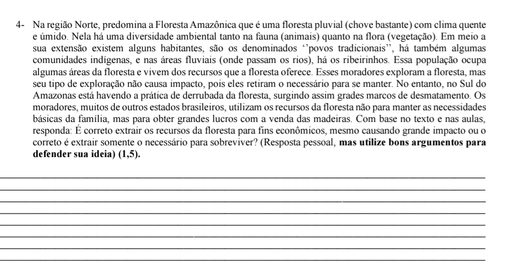 4- Na região Norte, predomina a Floresta Amazônica que é uma floresta pluvial (chove bastante) com clima quente e úmido. Nela há uma diversidade ambiental tanto na fauna (animais) quanto na flora (vegetação). Em meio a sua extensão existem alguns habitantes, são os denominados "povos tradicionais", há também algumas comunidades indígenas, e nas áreas fluviais (onde passam os rios), há os ribeirinhos. Essa população ocupa algumas áreas da floresta e vivem dos recursos que a floresta oferece. Esses moradores exploram a floresta, mas seu tipo de exploração não causa impacto, pois eles retiram o necessário para se manter. No entanto, no Sul do Amazonas está havendo a prática de derrubada da floresta, surgindo assim grades marcos de Os moradores, muitos de outros estados brasileiros, utilizam os recursos da floresta não para manter as necessidades básicas da família, mas para obter grandes lucros com a venda das madeiras. Com base no texto e nas aulas, responda: É correto extrair os recursos da floresta para fins econômicos, mesmo causando grande impacto ou o correto é extrair somente o necessário para sobreviver? (Resposta pessoal, mas utilize bons argumentos para defender sua ideia) (1,5).
