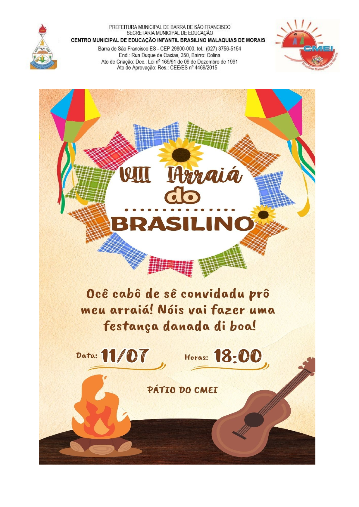 Barra de São Francisco, 2025 Projeto Festa Junina Tema: VIII ARRAIÁ DO BRASILINO Justificativa: Baseados na Lei de Diretrizes e Bases da Educação Nacional (Lei nº 9.394/96) que institui, em seu artigo 3º e incisos, os princípios e fins básicos da Educação Brasileira, destacamos aqui o inciso II que diz: “liberdade de aprender, ensinar, pesquisar e divulgar a cultura, o pensamento, a arte e o saber”. Por isso a Escola deve criar condições, espaços e oportunidades para que os alunos possam ter esta liberdade de aprender, resgatar, bem como manter viva nos jovens a raiz cultural do nosso povo, e dos nossos antepassados. Sabendo que o povo brasileiro sofreu ao longo de sua formação influência de vários povos e que delas nasceram diversas comemorações que passaram a ser tradição em nosso meio portanto, propomos resgatar a memória da dança da quadrilha e a história dos santos padroeiros. Cultivamos nos mais jovens o interesse pelo conhecimento social, cultural e até mesmo político do nosso folclore através das danças, da fogueira, das barraquinhas com comidas e bebidas típicas e da tradicional quadrilha. É também através de eventos desta natureza que proporcionamos aos pais dos alunos e aos funcionários de modo geral momentos de saudades, descontração e prazer nos quais serão recordadas todas as emoções sentidas e vividas por eles. Quanto às tradicionais Festas Juninas, que muitas vezes é mostrada de forma caricata ou totalmente desfigurada transformando-as em momentos de ridicularizarão dos costumes do nosso povo, acreditamos que esteja aqui uma oportunidade para se trabalhar a pluralidade cultural valorizando e preservando os diferentes modos de viver característico desta ou daquela região e aceitar o “diferente” e as “diferenças” quebrando assim as barreiras do relacionamento interpessoal para um convívio social sadio. Para trabalhar este projeto serão elaboradas atividades que facilitem a compreensão do aluno a respeito dos hábitos alimentares, dos modos de vestir, de falar, de organizar o dia-a-dia na região onde moram comparativamente à rotina das pessoas de outros lugares. Diante de tal fato é que a comemoração desta Festa exige o exercício da cidadania através de ações concretas, coesas, solidárias e participativas, em benefício da melhoria de vida de nossa comunidade escolar. Objetivo Geral: Resgatar a tradição das Festas Juninas, promovendo o desenvolvimento cultural e envolvendo a Comunidade Escolar e transformando-a em momentos de diversão encantamento e aprendizagem. Objetivos Específicos: · Conhecer as características e a origem das Festas Juninas; · Admirar e respeitar o trabalho do homem do campo; · Despertar o gosto pelas Festas Juninas, ressaltando seus aspectos: popular, social e religioso; · Desenvolver a socialização da criança através da dança da quadrilha; · Ouvir com interesse as informações trazidas pelos pais dos alunos; · Desenvolver o ritmo e as habilidades motoras; · Desenvolver o gosto por poemas e músicas; · Incentivar o gosto pela culinária junina; · Resgatar o Folclore Local e Regional revelando aos alunos as origens culturais. · Ornamentar a escola com o tema do projeto; · Realizar produções de textos, dramatizações, danças, poesias de acordo com o tema; · Possibilitar aos professores e alunos participarem e interagirem da realidade cultural e social, resgatando assim a memória histórico-cultural das famílias de Barra de São Francisco, visando enriquecer o currículo escolar; Desenvolvimento: · Pesquisas sobre as características e origem das Festas Juninas; · Histórias, dramatizações, pantomimas de cenas, mostrando como o homem do campo ajuda o homem da cidade; · Desenho e colagens livres sobre o tema; · Canções juninas; · Recortes, dobraduras, montagens; · Confecção de colares e pulseiras com macarrão, enfeites para chapéus de palha utilizando sementes, contas e cordões; · Orações espontâneas de agradecimento a Deus pelo alimento que vem do campo; · Pesquisas de cardápios típicos de festas juninas; · Preparação de receitas de comidas juninas; · Histórias dos santos homenageados no mês de junho; · Montagem de murais juninos; · Leitura de textos informativos, recreativos, poesias, poemas e músicas; · Dança de quadrilha envolvendo alunos, pais, funcionários e Conselho de Escola. · Eleição da rainha da pipoca. Publico Alvo: Pais, funcionários, Conselho de escola e alunos. TURMAS EM TEMPO INTEGRAL TURMAS NÚMERO DE TURMAS BERÇÁRIO 01 MATERNAL I 02 MATERNAL II 02 MATERNAL III 02 Período de duração: 16/06 a 11/07/2025 Cronograma de Ação: - Músicas infantis. - Poemas e dobraduras. - Confecção de ornamentos e dramatizações. - Pesquisa de cardápios. - Poesias, Repentes e desafios. - História dos Santos. - Ensaios e apresentação da quadrilha. Recursos Humanos: · Alunos; · Professores; · A S.G. e A. S. E.; · Monitores da educação especial e Estagiárias; · Coordenação, Direção Administrativa e Pedagógica; · Pais e Conselho de Escola Recursos: · Pátio da Escola. · Vídeos, aparelhos de som. · Murais, cartazes. · Fitas, tecidos, macarrão, sementes, contas, cordões, etc... · Livros e revistas, etc. Avaliação; A Avaliação será feita através da participação e interesse nas atividades escolares e apresentação destas, durante o período das Festas Juninas nas salas de aula e para a comunidade escolar na culminância do projeto. Cronograma de Ação: 1ª Semana – 16/06 a 20/06/2025 · Ensaios de quadrilha e danças. · Entrega da rifa da Rainha da pipoca 2ª Semana - 23/06 a 27/06/2025 · Pesquisas de poesias, músicas e poemas. · Confecção de cartazes. · Montagem de murais. · Ensaios das danças 3ª Semana – 30/06 a 04/07/2025 · Pesquisas de cardápios. · Dramatizações. · Ensaios das danças. 4ª Semana - 07/06 a 11/07/2025 · Confecção dos ornamentos para dançar quadrilh