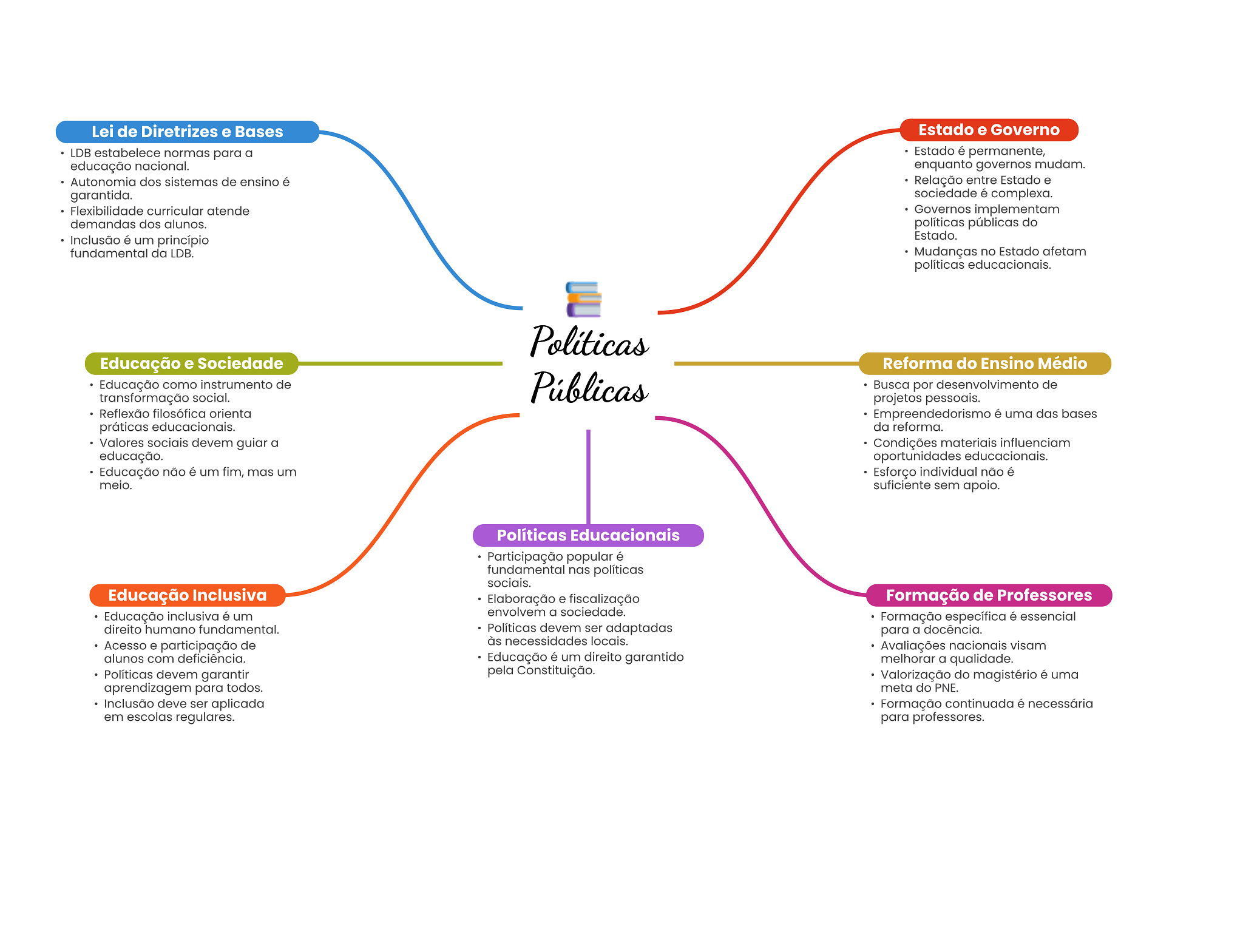 Lei de Diretrizes e Bases Estado e Governo LDB estabelece normas para a Estado é permanente, educação nacional. enquanto governos mudam. Autonomia dos sistemas de ensino é Relação entre Estado e garantida. sociedade é complexa. Flexibilidade curricular atende Governos implementam demandas dos alunos. políticas públicas do Inclusão é um princípio Estado. fundamental da LDB. Mudanças no Estado afetam políticas educacionais. Educação e Sociedade Reforma do Ensino Médio Educação como instrumento de Públicas Busca por desenvolvimento de transformação social. projetos pessoais. Reflexão filosófica orienta Empreendedorismo é uma das bases práticas educacionais. da reforma. Valores sociais devem guiar a Condições materiais influenciam educação. oportunidades educacionais. Educação não é um fim, mas um Esforço individual não é meio. suficiente sem apoio. Políticas Educacionais Participação popular é fundamental nas políticas sociais. Educação Inclusiva Elaboração e fiscalização Formação de Professores Educação inclusiva é um envolvem a sociedade. Formação específica é essencial direito humano fundamental. Políticas devem ser adaptadas para a docência. Acesso e participação de às necessidades locais. Avaliações nacionais visam alunos com deficiência. Educação é um direito garantido melhorar a qualidade. Políticas devem garantir pela Constituição. Valorização do magistério é uma aprendizagem para todos. meta do PNE. Inclusão deve ser aplicada Formação continuada é necessária em escolas regulares. para professores.