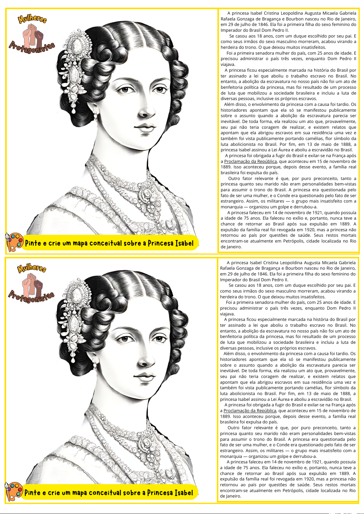 Pinte e crie um mapa conceitual sobre a Princesa Isabel MulheresMulheres Protagonista sProtagonistas A princesa Isabel Cristina Leopoldina Augusta Micaela Gabriela Rafaela Gonzaga de Bragança e Bourbon nasceu no Rio de Janeiro, em 29 de julho de 1846. Ela foi a primeira filha do sexo feminino do Imperador do Brasil Dom Pedro II. Se casou aos 18 anos, com um duque escolhido por seu pai. E como seus irmãos do sexo masculino morreram, acabou virando a herdeira do trono. O que deixou muitos insatisfeitos. Foi a primeira senadora mulher do país, com 25 anos de idade. E precisou administrar o país três vezes, enquanto Dom Pedro II viajava. A princesa ficou especialmente marcada na história do Brasil por ter assinado a lei que aboliu o trabalho escravo no Brasil. No entanto, a abolição da escravatura no nosso país não foi um ato de benfeitoria política da princesa, mas foi resultado de um processo de luta que mobilizou a sociedade brasileira e incluiu a luta de diversas pessoas, inclusive os próprios escravos. Além disso, o envolvimento da princesa com a causa foi tardio. Os historiadores apontam que ela só se manifestou publicamente sobre o assunto quando a abolição da escravatura parecia ser inevitável. De toda forma, ela realizou um ato que, provavelmente, seu pai não teria coragem de realizar, e existem relatos que apontam que ela abrigou escravos em sua residência uma vez e também foi vista publicamente portando camélias, flor símbolo da luta abolicionista no Brasil. Por fim, em 13 de maio de 1888, a princesa Isabel assinou a Lei Áurea e aboliu a escravidão no Brasil. A princesa foi obrigada a fugir do Brasil e exilar-se na França após a Proclamação da República, que aconteceu em 15 de novembro de 1889. Isso aconteceu porque, depois desse evento, a família real brasileira foi expulsa do país. Outro fator relevante é que, por puro preconceito, tanto a princesa quanto seu marido não eram personalidades bem-vistas para assumir o trono do Brasil. A princesa era questionada pelo fato de ser uma mulher, e o Conde era questionado pelo fato de ser estrangeiro. Assim, os militares — o grupo mais insatisfeito com a monarquia — organizou um golpe e derrubou-a. A princesa faleceu em 14 de novembro de 1921, quando possuía a idade de 75 anos. Ela faleceu no exílio e, portanto, nunca teve a chance de retornar ao Brasil após sua expulsão em 1889. A expulsão da família real foi revogada em 1920, mas a princesa não retornou ao país por questões de saúde. Seus restos mortais encontram-se atualmente em Petrópolis, cidade localizada no Rio de Janeiro. Pinte e crie um mapa conceitual sobre a Princesa Isabel MulheresMulheres Protagonista sProtagonistas A princesa Isabel Cristina Leopoldina Augusta Micaela Gabriela Rafaela Gonzaga de Bragança e Bourbon nasceu no Rio de Janeiro, em 29 de julho de 1846. Ela foi a primeira filha do sexo feminino do Imperador do Brasil Dom Pedro II. Se casou aos 18 anos, com um duque escolhido por seu pai. E como seus irmãos do sexo masculino morreram, acabou virando a herdeira do trono. O que deixou muitos insatisfeitos. Foi a primeira senadora mulher do país, com 25 anos de idade. E precisou administrar o país três vezes, enquanto Dom Pedro II viajava. A princesa ficou especialmente marcada na história do Brasil por ter assinado a lei que aboliu o trabalho escravo no Brasil. No entanto, a abolição da escravatura no nosso país não foi um ato de benfeitoria política da princesa, mas foi resultado de um processo de luta que mobilizou a sociedade brasileira e incluiu a luta de diversas pessoas, inclusive os próprios escravos. Além disso, o envolvimento da princesa com a causa foi tardio. Os historiadores apontam que ela só se manifestou publicamente sobre o assunto quando a abolição da escravatura parecia ser inevitável. De toda forma, ela realizou um ato que, provavelmente, seu pai não teria coragem de realizar, e existem relatos que apontam que ela abrigou escravos em sua residência uma vez e também foi vista publicamente portando camélias, flor símbolo da luta abolicionista no Brasil. Por fim, em 13 de maio de 1888, a princesa Isabel assinou a Lei Áurea e aboliu a escravidão no Brasil. A princesa foi obrigada a fugir do Brasil e exilar-se na França após a Proclamação da República, que aconteceu em 15 de novembro de 1889. Isso aconteceu porque, depois desse evento, a família real brasileira foi expulsa do país. Outro fator relevante é que, por puro preconceito, tanto a princesa quanto seu marido não eram personalidades bem-vistas para assumir o trono do Brasil. A princesa era questionada pelo fato de ser uma mulher, e o Conde era questionado pelo fato de ser estrangeiro. Assim, os militares — o grupo mais insatisfeito com a monarquia — organizou um golpe e derrubou-a. A princesa faleceu em 14 de novembro de 1921, quando possuía a idade de 75 anos. Ela faleceu no exílio e, portanto, nunca teve a chance de retornar ao Brasil após sua expulsão em 1889. A expulsão da família real foi revogada em 1920, mas a princesa não retornou ao país por questões de saúde. Seus restos mortais encontram-se atualmente em Petrópolis, cidade localizada no Rio de Janeiro. https://escolakids.uol.com.br/historia/a-proclamacao-da-republica-no-brasil.htm https://escolakids.uol.com.br/historia/a-proclamacao-da-republica-no-brasil.htm Mulheres Protagonistas Pinte e crie um mapa conceitual sobre a Princesa Isabel Mulheres Protagonistas Pinte e crie um mapa conceitual sobre a Princesa Isabel