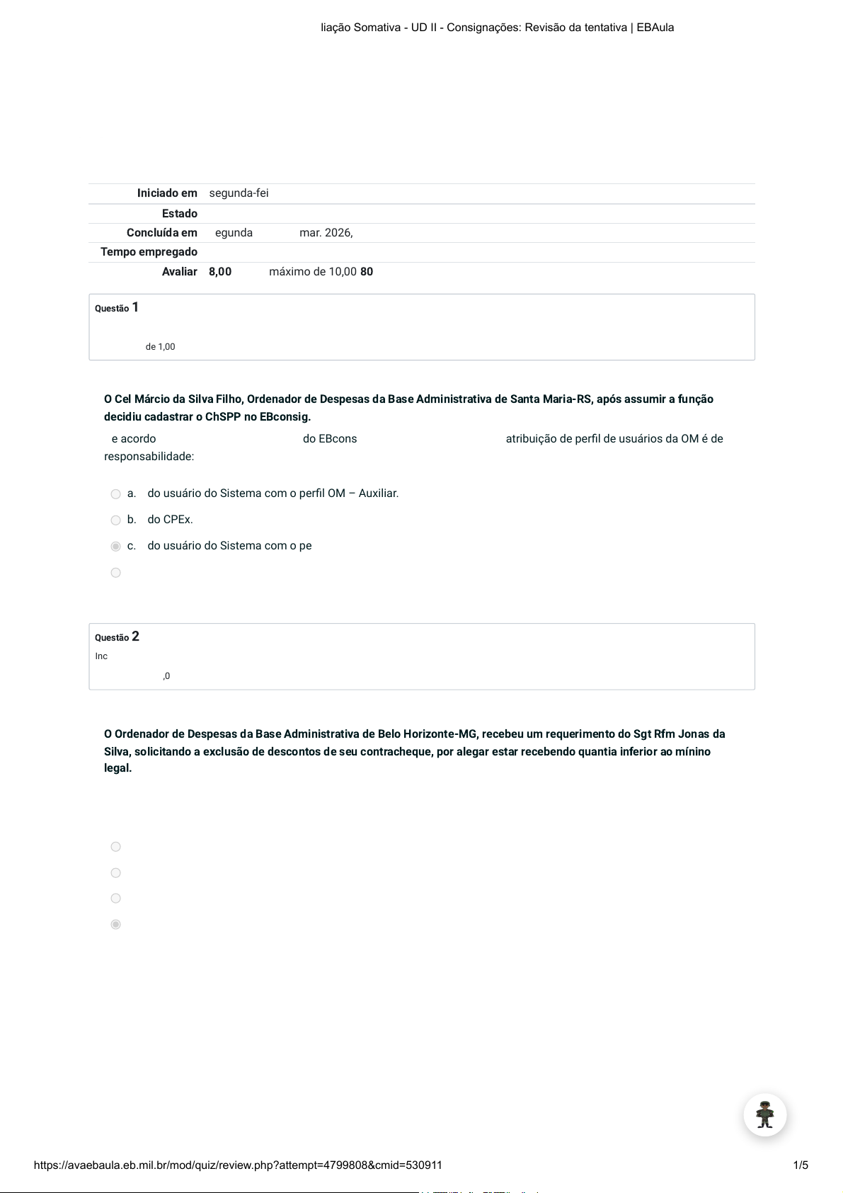 Iniciado em segunda-feira, 16 mar. 2026, 13:33 Estado Finalizada Concluída em segunda-feira, 16 mar. 2026, 13:58 Tempo empregado 25 minutos 20 segundos Avaliar 8,00 de um máximo de 10,00(80%) Questão 1 Correto Atingiu 1,00 de 1,00 Questão 2 Incorreto Atingiu 0,00 de 1,00 O Cel Márcio da Silva Filho, Ordenador de Despesas da Base Administrativa de Santa Maria-RS, após assumir a função decidiu cadastrar o ChSPP no EBconsig. De acordo com a Cartilha Gestores OD do EBconsig, o cadastro, descadastro e atribuição de perfil de usuários da OM é de responsabilidade: a. do usuário do Sistema com o perfil OM – Auxiliar. b. do CPEx. c. do usuário do Sistema com o perfil OM – Gestor OD. ✓ d. da seção de informática da OM. O Ordenador de Despesas da Base Administrativa de Belo Horizonte-MG, recebeu um requerimento do Sgt Rfm Jonas da Silva, solicitando a exclusão de descontos de seu contracheque, por alegar estar recebendo quantia inferior ao mínino legal. De acordo com a Portaria Nº 124 - SEF, de 18 FEV 21, o mínimo legal refere-se a qual percentual da remuneração, proventos ou benefício de pensão recebidos pelo militar ou pensionista? a. 10%. b. 70%. c. 30%. d. 50%. × 16/03/2026, 13:58 Avaliação Somativa - UD II - Consignações: Revisão da tentativa | EBAula https://avaebaula.eb.mil.br/mod/quiz/review.php?attempt=4799808&cmid=530911 1/5 Questão 3 Correto Atingiu 1,00 de 1,00 Questão 4 Correto Atingiu 1,00 de 1,00 O ST Marino dirigiu-se a uma imobiliária para realizar um contrato de aluguel residencial e essa lhe solicitou uma fiança como garantia do aluguel pretendido. O ST Marino requereu ao Ordenador de Despesas, conforme previsto na Portaria nº 25-SEF, de 25 FEV 19, a emissão de um Temo de Garantia de Aluguel. O Ordenador de Despesas verificou que o militar possui descontos obrigatórios que tornaram a margem consignável negativa. Neste caso, podemos afirmar que: a. É vedado ao OD conceder Termo de Garantia de Pagamento de Aluguel de Imóvel Residencial ao beneficiário que não possua margem consignável suficiente para honrar o compromisso a ser assumido. ✓ b. É permitido ao OD conceder Termo de Garantia de Pagamento de Aluguel de Imóvel Residencial ao beneficiário que não possua margem consignável suficiente para honrar o compromisso a ser assumido, desde que sejam excluídos outros descontos autorizados do contracheque do militar. c. É permitido ao OD conceder Termo de Garantia de Pagamento de Aluguel de Imóvel Residencial ao beneficiário que não possua margem consignável suficiente para honrar o compromisso a ser assumido, desde que sejam excluídos todos os empréstimos do contracheque do militar. d. É permitido ao OD conceder Termo de Garantia de Pagamento de Aluguel de Imóvel Residencial ao beneficiário que não possua margem consignável suficiente para honrar o compromisso a ser assumido. O ST Marino dirigiu-se a uma imobiliária para realizar um contrato de aluguel residencial e essa lhe solicitou uma fiança como garantia do aluguel pretendido. O ST Marino requereu ao Ordenador de Despesas, conforme previsto na Portaria nº 25-SEF, de 25 FEV 19, a emissão de um Temo de Garantia de Aluguel. Nesse caso: a. o Ordenador de Despesas encaminha documento ao CPEx para que seja efetuada a reserva de margem. b. o Ordenador de Despesas ou o Encarregado do Setor de Pagamento de Pessoal deverá, após publicar em BI, executar a operação da exclusão de consignações para gerar margem para o Termo de Garantia de Aluguel. c. a reserva de margem para emissão do Termo de Garantia de Aluguel deve ser efetuado pelo Ordenador de Despesas no Sistema de Consignações do Exército (EBconsig), no link menu Operacional/Termo de Garantia de Aluguel. ✓ d. a inclusão de reserva de margem consignável para o Termo de Garantia de Aluguel é executada pela empresa Zetrasoft, somente. 16/03/2026, 13:58 Avaliação Somativa - UD II - Consignações: Revisão da tentativa | EBAula https://avaebaula.eb.mil.br/mod/quiz/review.php?attempt=4799808&cmid=530911 2/5 Questão 5 Correto Atingiu 1,00 de 1,00 Questão 6 Correto Atingiu 1,00 de 1,00 O Ordenador de Despesas da Base Administrativa de Belo Horizonte-MG, recebeu um requerimento do Sgt Rfm Jonas da Silva, solicitando a exclusão de desconto em seu contracheque, referente a uma consignação de empréstimo em favor do Banco Verde por alegar ser ilegal. Após estudo do caso em questão, qual o procedimento a ser adotado pelo Ordenador de Despesas? a. o Ordenador de Despesas excluirá o desconto consignado do contracheque do militar. b. o Ordenador de Despesas da Organização Militar de vinculação do militar ou pensionista deverá realizar a abertura de processo administrativo para averiguação, encaminhando o mesmo para o CPEx, caso o fato seja confirmado. ✓ c. o Ordenador de Despesas não deve interferir. d. o Ordenador de Despesas expedirá DIEx ao CPEx solicitando a exclusão do desconto consignado do contracheque do militar. O Ordenador de Despesas da Base Administrativa de Santa Maria-RS, recebeu Ofício do Ordenador de Despesas do 52 BIS, solicitando que fosse realizada despesa a anular no valor de R$ 500,00, referente à Gratificação de Localidade Especial recebida a maior pelo 2º Sgt Luciano Miranda. A Unidade Gestora efetuou a implantação da despesa a anular no contracheque do militar. Após o processamento do contracheque com o desconto obrigatório o EBconsig efetuou a limitação do valor da parcela de um empréstimo consignado no contracheque e mesmo assim, a margem consignável resultou negativa no EBconsig. Neste caso, é correto afirmar que o OD deverá realizar os seguintes procedimentos: a. apenas dar ciência ao militar de que, embora a consignação não esteja com o valor total da parcela no contracheque e a margem esteja negativa, a dívida referente ao valor complementar da parcela permanece e deve ser quitada junto à entidade consignatária. ✓ b. solicitar à entida