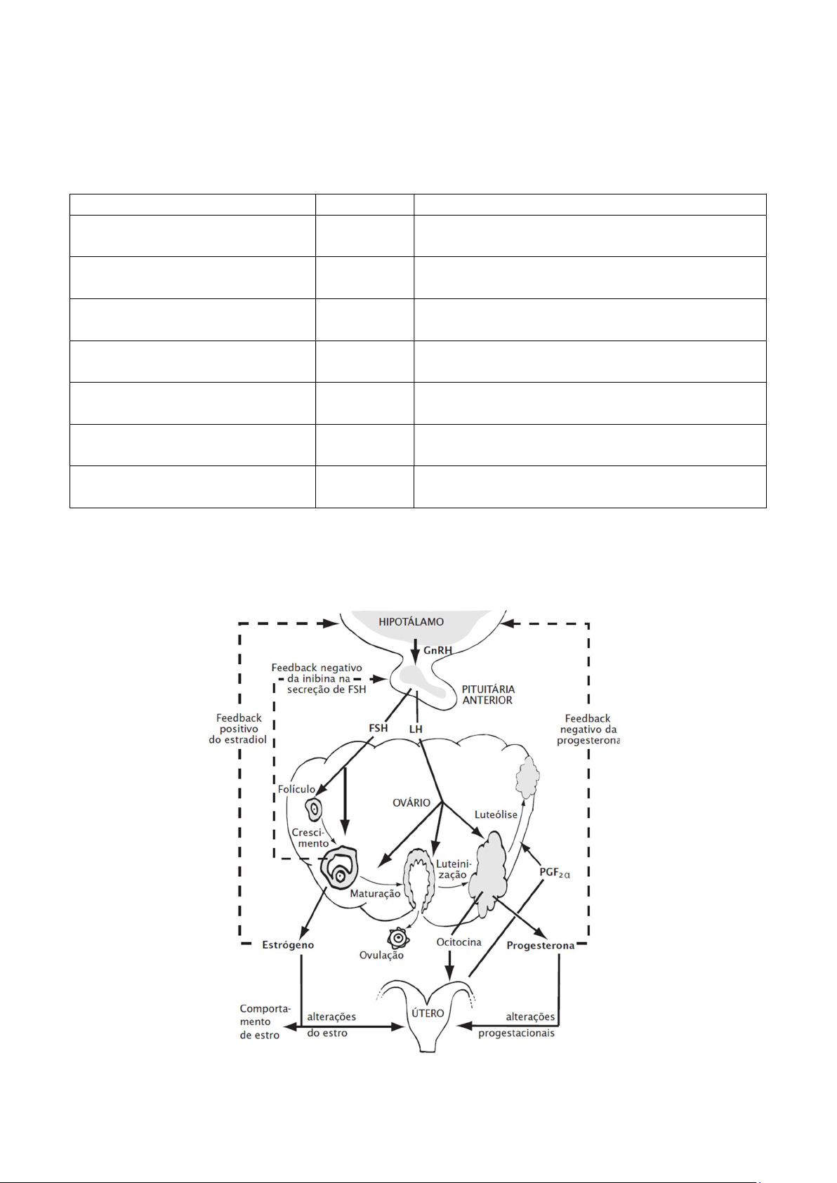 ESTUDO DIRIGIDO – REPRODUÇÃO ANIMAL 1 - Preencha a seguinte tabela descrevendo o órgão de origem e a respectiva função nos processos reprodutivos dos mamíferos domésticos. Hormônio Origem Função no ciclo reprodutivo Hormônio liberador de gonadotrofinas (GnRH) hipotálamo Estimula a hipófise, a sintetizar e liberar os hormônios FSH E LH Hormônio folículo estimulante (FSH) HIPOFISE Estimula o desenvolvimento folicular Hormônio luteinizante (LH) HIPOFISE Estimula a ovulação Estrógeno Folículos terciários Responsável pela ovulação e formação do corpo lúteo Inibina Folículos terciários Agem nos folículos, inibindo seu crescimento e inibi a síntese de FHS Progesterona Corpo lúteo Manter a gestação, inibi o cio Prostaglandina útero Lise do corpo lúteo 2 - Observe a figura, baseado na tabela e no texto anterior, responda o que se pede: a) GnRH - Em qual glândula o GnRH é produzido? Em qual glândula ele atua? Quais hormônios são produzidos sob atuação do GnRH? Qual hormônio suprime sua produção (feedback negativo)? Qual hormônio estimula sua produção em níveis elevados (feedback positivo)? b) FSH - Onde é produzido? Em qual glândula ele atua? Qual principal ação ele promove nos folículos ovarianos? Estimula o crescimento e desenvolvimento dos folículos ovarianos. Qual hormônio atua suprimindo sua produção? A inibina c) Estrógeno – Em qual estrutura é produzido? O que ele provoca no comportamento sexual das fêmeas? Qual ação ele promove no hipotálamo? exerce um efeito de feedback positivo na adenoipófise, para aumentar a secreção de LH, o que resulta no pico de LH que promove a maturação do folículo e ovulação e, assim como o FSH, d) Inibina – Em qual estrutura é produzida? produzido pelas células da granulosa do folículo em desenvolvimento qual ação desse hormônio sobre os folículos? inibe a secreção de FSH durante os estágios finais do desenvolvimento do folículo e o desenvolvimento de outros folículos antrais Qual ação desse hormônio na hipófise, em relação ao FSH? exerce um efeito de feedback negativo na adenoipófise, para a supressão da secreção do FSH e) LH – Em qual glândula é produzido? secretada pela adenoipófise. Qual as três principais funções reprodutivas desse hormônio? Provoca a ovulação. Atua no corpo lúteo (luteólise/reconhecimento da prenhez). Estimula as células de Leydig e a fase final da espermatogênese. f) Progesterona – Em qual estrutura é produzida? No corpo lúteo O que ela provoca em relação ao comportamento sexual das fêmeas? responsável pela manutenção da gestação. Qual ação ela promove no hipotálamo? Reduz a liberação de LH e FSH, impedindo que novos ciclos estrais ocorram durante a gestação. g) Prostaglandina – Em qual órgão é produzida? Útero. Em qual circunstância é produzida? se não houver gestação em qual estrutura ela age? Age no corpo lúteo O que esse hormônio provoca na estrutura alvo? Induz a luteólise, provoca a regressão do corpo lúteo, fazendo cair a produção de progesterona. 3 – Explique com suas palavras: a) Porque os níveis de progesterona (P4) aumentam no metaestro e reduzem no diestro? porque o corpo lúteo está se formando (luteinização) e começa a produzir progesterona. Reduzem no final do diestro porque ocorre a regressão do corpo lúteo. b) Qual hormônio interfere reduzindo a produção de progesterona no final da fase de diestro? O que esse hormônio provoca no corpo lúteo? O hormônio é a prostaglandina F2α (PGF2α). Ela provoca luteólise, a regressão funcional do corpo lúteo. c) Porque os níveis de estrógeno (E2) aumentam a partir da fase de proestro e reduzem durante o estro? porque os folículos estão crescendo sob ação do FSH e produzem estradiol. Reduzem após o estro porque ocorre a ovulação e o folículo dominante deixa de produzir estrógeno, dando lugar à formação do corpo lúteo. d) Qual o resultado do aumento dos níveis de FSH na fase de proestro? Promove o crescimento e desenvolvimento dos folículos ovarianos. e) Qual ação do LH? Induz o pico ovulatório, levando à ovulação, e depois participa da formação do corpo lúteo (luteinização).