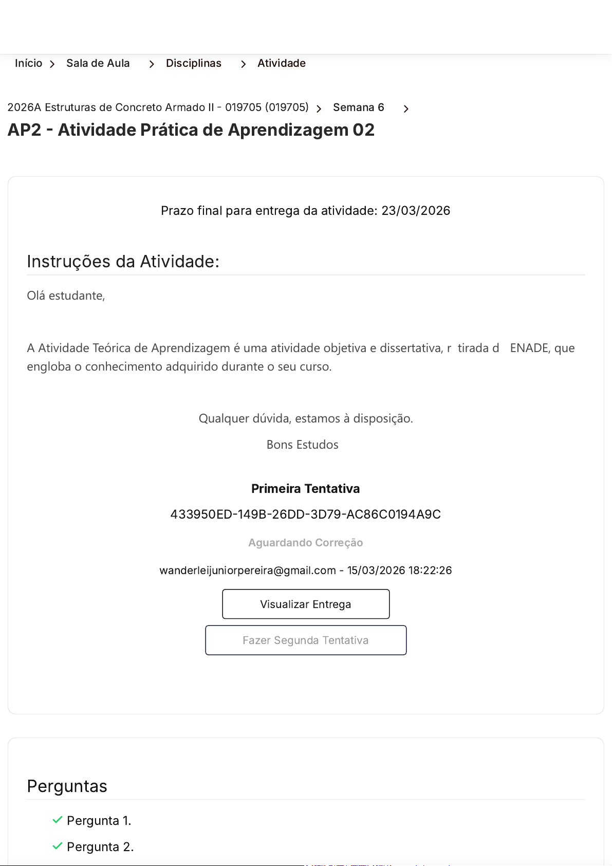 Início 〉 Sala de Aula 〉 Disciplinas 〉 Atividade 2026A Estruturas de Concreto Armado II - 019705 (019705) 〉 Semana 6 〉 AP2 - Atividade Prática de Aprendizagem 02 Instruções da Atividade: Prazo final para entrega da atividade: 23/03/2026 Olá estudante, A Atividade Teórica de Aprendizagem é uma atividade objetiva e dissertativa, retirada do ENADE, que engloba o conhecimento adquirido durante o seu curso. Qualquer dúvida, estamos à disposição. Bons Estudos ! Primeira Tentativa 433950ED-149B-26DD-3D79-AC86C0194A9C Aguardando Correção wanderleijuniorpereira@gmail.com - 15/03/2026 18:22:26 Visualizar Entrega Fazer Segunda Tentativa Perguntas Pergunta 1. Pergunta 2. https://ava.uca.edu.br/aluno/sala-de-aula/disciplina/modulo/atividade/677876 https://ava.uca.edu.br/aluno/sala-de-aula/disciplina/modulo/atividade/677876 https://ava.uca.edu.br/aluno/sala-de-aula/disciplina https://ava.uca.edu.br/aluno/sala-de-aula/disciplina/modulo/atividade/:id/:nome javascript:void(0); pontos: 0,300Pergunta 1. A corrosão do aço em estruturas de concreto armado é considerada uma manifestação patológica não muito rara nas construções. Nesse contexto, avalie as seguintes afirmações. I. A corrosão do aço é um processo eletroquímico que se inicia e prossegue devido a características construtivas da estrutura de concreto armado, além de condições climáticas e de exposição. II. A colocação de espaçadores que auxiliam o correto posicionamento das armaduras dentro das formas é uma prática que procura garantir o cobrimento especificado e a vida útil prevista das estruturas em projeto. III. A utilização de adições minerais em concretos pouco influencia a deterioração por corrosão da armadura. IV. Os produtos da corrosão são expansivos e podem ocasionar fissuras em vigas e pilares e, ate mesmo, o destacamento de pedaços de concreto. É correto o que se afirma em: Múltipla Escolha: A. II, III e IV, apenas. B. I, II e III, apenas. C. I, II, III e IV. D. I, III e IV, apenas. javascript:void(0); E. I, II e IV, apenas. pontos: 0,700Pergunta 2. Leia o trecho abaixo e responda: Os Estados-Limites devem ser considerados no projeto das estruturas em Concreto Protendido, relativamente à verificação da segurança e das condições em serviço. Explique com suas palavras 3 tipos de estados limites definidos pela NBR 6118: Resposta Dissertativa: ESTADO LIMITE ÚLTIMO: Segundo a NBR 6118 (2014) é os elementos estruturais relacionados ao colapso, ou a qualquer outra forma de ruína estrutural, que determine a paralisação do uso da estrutura. A segurança das estruturas de concreto deve sempre ser verificada em relação aos seguintes estados limites últimos: Estado limite último da perda do equilíbrio da estrutura, admitida como corpo rígido; É o estado limite em que a estrutura deixa de ficar em pé por falta de equilíbrio entre as forças atuantes. ESTADO LIMITE DE UTILIZAÇÃO: Segundo a NBR (2014) é os elementos da edificação que correspondem à impossibilidade do uso normal da estrutura, estando relacionados à durabilidade das estruturas, aparência, conforto, boa utilização funcional da mesma, seja em relação aos usuários ou às maquinas. Estado limite de vibrações excessivas; A estrutura continua resistente e segura, porém as vibrações são tão grandes que atrapalham sua utilização, Ex: Passarela ou ponte - Quando muitas pessoas caminham e ela começa a balançar muito. Estado-limite último de colapso progressivo; É o estado limite em que a ruptura de um elemento desencadeia uma sequência de falhas que pode levar ao colapso de grande parte da estrutura. javascript:void(0); Fechar Visualização 〈 Voltar aos Módulos 〈 Anterior Próxima 〉 Faculdade Católica Paulista Contato Endereço Avenida Cristo Rei, 305 – Banzato Marília, São Paulo – CEP: 17515-200 Horário De Funcionamento WhatsApp : (14) 9.8826-3000 Telefone Sede: (14) 3422-1815 Central de Atendimento: 0800 664 5583 E-mail : secretaria@uca.edu.br https://www.instagram.com/faculdadecatolicaead/ https://facebook.com/ucaead https://www.youtube.com/@UcaEduBr https://www.linkedin.com/school/faculdade-catolica-paulista/?originalSubdomain=br https://maps.app.goo.gl/wWsD9QX5fVPa3h6PA https://api.whatsapp.com/send?phone=5514988263000&text=Suporte tel:14-3422-1815 tel:14-3422-1815 tel:0800-664-5583 tel:0800-664-5583 mailto:secretaria@uca.edu.br javascript:void(0); Segunda a quinta, das 8:00 às 20:00 horas As sextas, das 8:00 às 18:00 horas. javascript:void(0);