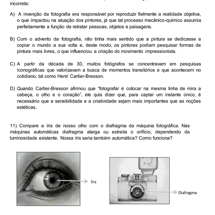 incorreta: A) A invenção da fotografia era responsável por reproduzir fielmente a realidade objetiva, que impactou na atuação dos pintores, já que tal processo mecânico-químico assumia perfeitamente a função de retratar pessoas, objetos e paisagens. B) Com O advento da fotografia, não tinha mais sentido que a pintura se dedicasse a copiar O mundo a sua volta e, deste modo, OS pintores podiam pesquisar formas de pintura mais livres, O que influenciou a criação do movimento impressionista. C) A partir da década de 30, muitos fotógrafos se concentravam em pesquisas iconográficas que valorizavam a busca de momentos transitórios e que acontecem no cotidiano, tal como Henri Cartier-Bresson. D) Quando Cartier-Bresson afirmou que "fotografar é colocar na mesma linha de mira a cabeça, O olho e O coração", ele quis dizer que, para captar um instante único, é necessário que a sensibilidade e a criatividade sejam mais importantes que as noções estéticas. 11) Compare a iris de nosso olho com O diafragma da máquina fotográfica. Nas automáticas diafragma alarga ou estreita O orifício, dependendo da luminosidade existente. Nossa iris seria também automática? Como funciona? Diafragma