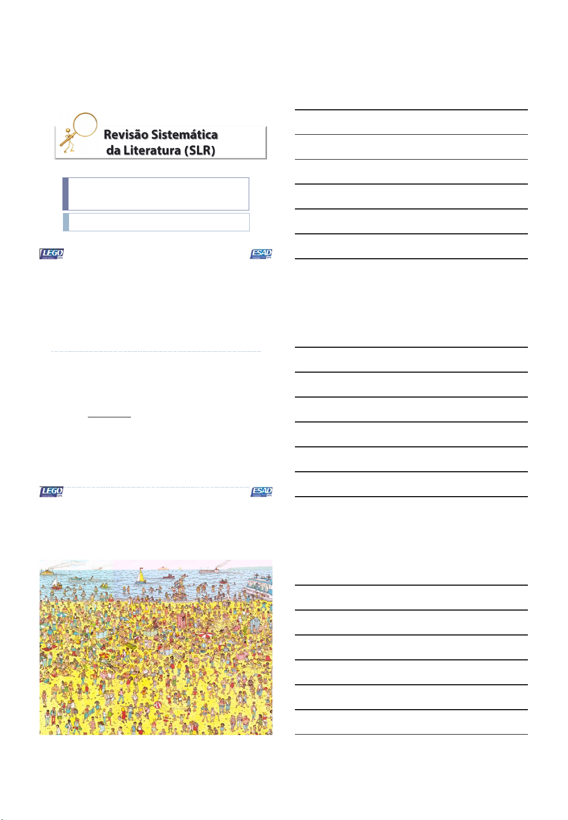13/10/2012 1 I Capacitação em Metodologia da Pesquisa Científica Prof. Miguel Isoni Filho João Pessoa Outubro 2012 Roteiro da aula I Capacitação em Metodologia da Pesquisa Científica Introdução Métodos de SLR (1) Narrative Review (2) Descriptive Review (3) Vote Counting (4) Meta-analysis Procedimentos extras (1) Avaliação da qualidade (2) Análise de redes sociais (ARS) Exemplo de SLR: limitação digital Resumo e sugestões. 13/10/2012 2 Introdução Revisão sistemática de literatura (systematic literature review – SLR) é o pilar da prática baseada em evidências de literatura especializada (DYBÅ; DINGSØYR, 2008) Diante da literatura em crescimento, cujo conhecimento encontra-se inexplorado, a SLR merece maior prioridade que a adição de um novo experimento ou survey (Glass, 1976) I Capacitação em Metodologia da Pesquisa Científica Destaca-se que uma tendência recente na revisão de literatura é integrar e caracterizar um conjunto de definições, diferenças e relações entre conceitos, resultando em um modelo de referência para implicações em investigações acadêmico-científica ou implicações práticas. Introdução [FATOS] Há estudos em Sistema de Informação (SI), em torno de 7%, que já utilizam SLR como a metodologia de pesquisa (KING; HE, 2005). A SLR segue como um método importante em SI, especialmente devido aos inúmeros estudos que vem sido desenvolvidos nos últimos anos sobre o modelo de aceitação de tecnologia – (Technology Acceptance Model – TAM), em pró da investigação da inter/multidisciplinaridade de uma determinada área do conhecimento. No entando, a investigação em SI (assim como ocorre em outros campos maduros) apresenta um problema: incosistentes concluções de cunho empírico sobre essencialmente o mesmo questionamento de pesquisa. I Capacitação em Metodologia da Pesquisa Científica Métodos de SLR O acúmulo de conhecimentos depende cada vez mais da integração entre estudos anteriores e a descoberta empíricas (KING; HE, 2005). Pesquisadores podem usar uma série de técnicas para fazer sentido a uma literatura, com o propósito de lançar resultados atuais de pesquisa sobre contextos e explicações contraditórias sobre a mesma temática (RUMRILL; FITZGERALD, 2001) I Capacitação em Metodologia da Pesquisa Científica Há uma gama de estudos que dicotomizam os métodos de SLR entre as abordagens quantitativas e qualitativas. 13/10/2012 3 Métodos de SLR I Capacitação em Metodologia da Pesquisa Científica Esta abordagem pode ser excessivamente simplista pelo fato das técnicas variarem no grau de revisão sistemática de um corpo literatura existente, que vai desde puramente qualitativa a moderadamente quantitativa para puramente quantitativo. Métodos de SLR Narrative Review Apresentam descrições verbais sobre estudos publicados, a partir da junção de teorias, modelos e seus fatores elementares (preditor, moderador ou mediador), além de resultados de pesquisa. OBJETIVO: Postular ou avançar novas teorias e modelos (olhar exploratório), além analisar temas importante e/ou controversos. I Capacitação em Metodologia da Pesquisa Científica Pela falta do rigor metodológico, com base em um protocolo de pesquisa, ao realizar uma revisão narrativa, os pesquisadores tendem a consciente ou inconscientemente fazer julgamentos que suportam seu próprio plano de fundo. Métodos de SLR Descriptive Review A revisão descritiva segue a finalidade de introduzir certa quantificação da literatura investigada, vezes guinada por uma análise de distribuição de frequência de um corpo de categorias de análise (KING; HE, 2005). Objetivo: descobrir em que medida a literatura existente suporta uma proposição teórica ou revela algo relativo à configuração da pesquisa. I Capacitação em Metodologia da Pesquisa Científica teoria fundamentada metodologia de pesquisa abordagem principal resultados simbólicos de pesquisa CATEGORIAS DE ANÁLISE 13/10/2012 4 Métodos de SLR Vote Counting Pesquisadores classificam esse método como sendo uma revisão moderadamente quantitativo, pelo fato de não se preocupar em analisar o efeito de tamanhos e a confiabilidade dos estudos Uso simples e conveniente. Objetivo: fazer inferências qualitativas sobre o foco dos estudos revisados (ex. interpretar as magnitudes das correlações) por intermédio da análise comparativa e analítica entre os estudos. I Capacitação em Metodologia da Pesquisa Científica Este método faz uso de resultados, especialmente, providos da significância dos testes de hipóteses, proporcionados a partir da análise do p-valor. Métodos de SLR Meta-analysis [“Análise das análises”] Tendência mais recente nas SLR em SI. Mais comumente método utilizado na síntese quantitativa de pesquisas nas ciências sociais e comportamentais. Objetivo: fornecer uma oportunidade alternativa de melhor visualização do contexto de pesquisa em questão, combinando e analisando resultados quantitativos de estudos empíricos (GLASS, 1976), a fim de dar sentido à literatura em rápida evolução. I Capacitação em Metodologia da Pesquisa Científica Métodos de SLR Características gerais da meta-análise Menos crítico e subjetivo do que outros métodos. Configurado como sendo de confirmação da natureza. Sintonizado fortemente com a tradição positivista. Concentração em dados, operacionalização de variáveis. Resultado global mais preciso e confiável. I Capacitação em Metodologia da Pesquisa Científica Nos últimos anos, meta-análise adiquiriu certa reputação, especialmente nos campos das ciências ciências sociais e comportamentais (FIELD, 2001). Exemplo: Alguns journals revisaram suas políticas editoriais de publicação a fim de incentivar o uso de meta-análise - Academy of Management Journal, desde 2002. 13/10/2012 5 Métodos de SLR Preocupações com a meta-análise Mesmo sendo potencialmente eficaz, em muitas áreas do conhecimen