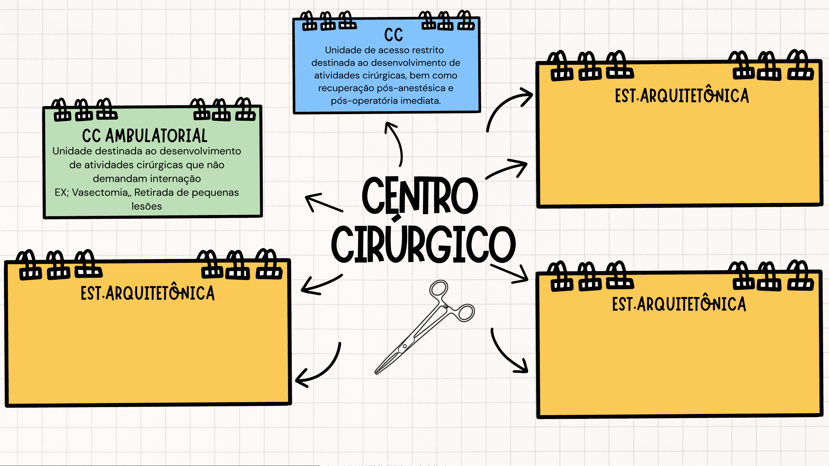 CENTRO CIRÚRGICO Unidade de acesso restrito destinada ao desenvolvimento de atividades cirúrgicas, bem como recuperação pós-anestésica e pós-operatória imediata. CC EST.ARQUITETÔNICA Unidade destinada ao desenvolvimento de atividades cirúrgicas que não demandam internação EX; Vasectomia,, Retirada de pequenas lesões CC AMBULATORIAL Piso de material resistente, - vinílico em manta ou placas; não poroso e livre de frestas (monolítico); de fácil limpeza terminal- máquina de lavagem e aspiração. EST.ARQUITETÔNICA Paredes de cor neutra, suave e fosca, para evitar fadiga visual e estímulos nervosos; Sala de formato retangular, com cantos arredondados; EST.ARQUITETÔNICA As portas da SO devem ter dimensão mínima de 1,20m X 2,10m, preferencialmente de aço inoxidável, de correr, com trilho na parte superior e visores CENTRO CIRÚRGICO EST.ARQUITETÔNICA Corredores com largura mínima de 2m; Janelas de vidros duplos de fácil limpeza e lacradas; EST.ARQUITETÔNICA Sala de prescrição médica: mínimo 2m² , com computadores suficientes para atender a demanda; EST.ARQUITETÔNICA Posto de enfermagem: no mínimo 6m² , para uma SRPA de até 12 leitos, caso seja usada como secretária e prescrição médica, deve ser acrescida de mais 2,0m² EST.ARQUITETÔNICA Blindagem nas paredes, pisos e tetos para salas cirúrgicas que utilizam Raio X, contínua e sem falhas; OBS: Ralos são proíbidos na SO!