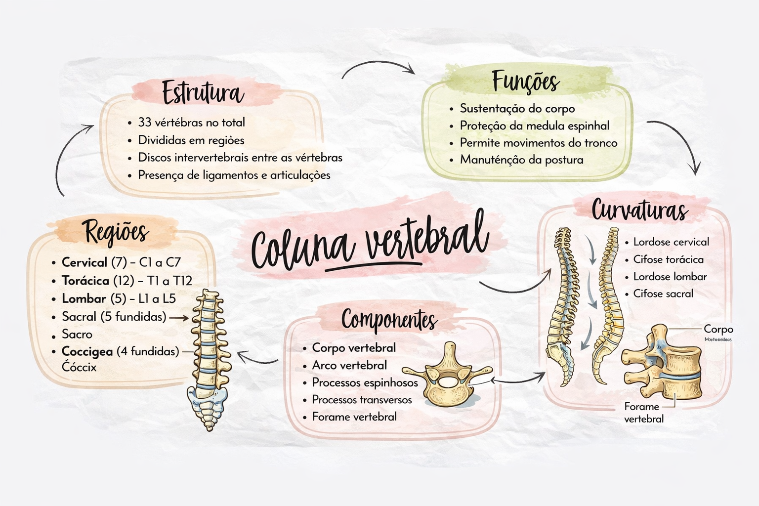Estrutura Funções Sustentação do corpo 33 vértébras no total Proteção da medula espinhal Divididas em Permite movimentos do tronco Discos intervertebrais entre as vértebras Manuténção da postura Presença de ligamentos e articulações Curvaturas Regiões Coluna vertebral Lordose cervical Cervical (7) - a C7 Cifose torácica Torácica (12) - T1 a T12 Lordose lombar Cifose sacral Lombar (5) - L1 a L5 Sacral (5 fundidas) Componentes Sacro Corpo Coccigea (4 fundidas) Corpo vertebral Arco vertebral Processos espinhosos Processos transversos Forame Forame vertebral vertebral