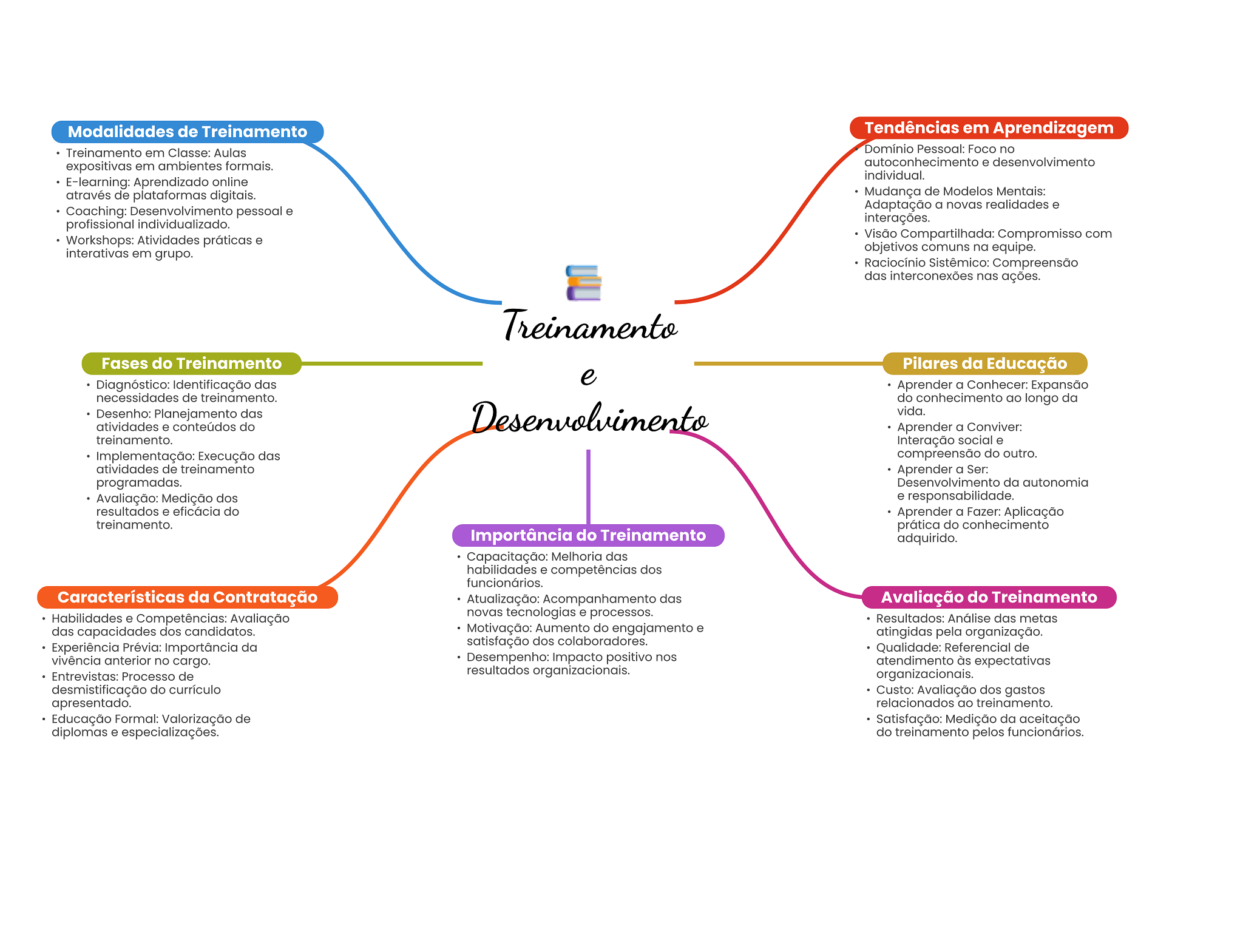 Modalidades de Treinamento Tendências em Aprendizagem Treinamento em Classe: Aulas Domínio Pessoal: Foco no expositivas em ambientes formais. autoconhecimento e desenvolvimento individual. E-learning: Aprendizado online através de plataformas digitais. Mudança de Modelos Mentais: Coaching: Desenvolvimento pessoal e Adaptação a novas realidades e profissional individualizado. interações. Workshops: Atividades práticas e Visão Compartilhada: Compromisso com interativas em grupo. objetivos comuns na equipe. Raciocínio Sistêmico: Compreensão das interconexões nas ações. Treinamento Fases do Treinamento Pilares da Educação e Diagnóstico: Identificação das Aprender a Conhecer: Expansão necessidades de treinamento. do conhecimento ao longo da Desenho: Planejamento das atividades e conteúdos do Desenvolvimento vida. Aprender a Conviver: treinamento. Interação social e Implementação: Execução das compreensão do outro. atividades de treinamento Aprender a Ser: programadas. Desenvolvimento da autonomia Avaliação: Medição dos e responsabilidade. resultados e eficácia do Aprender a Fazer: Aplicação treinamento. prática do conhecimento Importância do Treinamento adquirido. Capacitação: Melhoria das habilidades e competências dos funcionários. Características da Contratação Atualização: Acompanhamento das Avaliação do Treinamento Habilidades e Competências: Avaliação novas tecnologias e processos. Resultados: Análise das metas das capacidades dos candidatos. Motivação: Aumento do engajamento e atingidas pela organização. Experiência Prévia: Importância da satisfação dos colaboradores. Qualidade: Referencial de vivência anterior no cargo. Desempenho: Impacto positivo nos atendimento às expectativas Entrevistas: Processo de resultados organizacionais. organizacionais. desmistificação do currículo Custo: Avaliação dos gastos apresentado. relacionados ao treinamento. Educação Formal: Valorização de Satisfação: Medição da aceitação diplomas e especializações. do treinamento pelos funcionários.