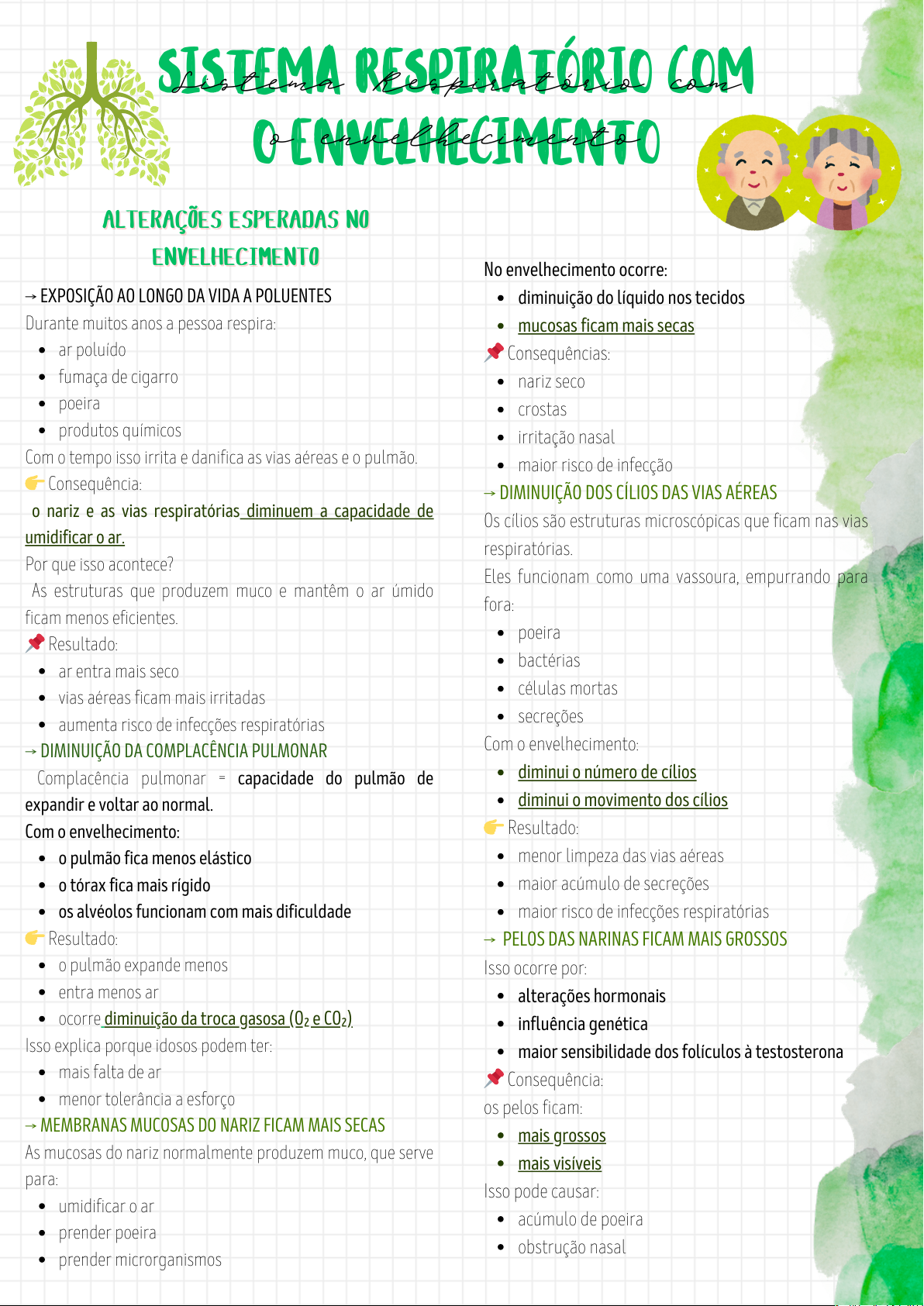 Sistema Respiratório com o envelhecimento Sistema Respiratório com o envelhecimento ⟶ EXPOSIÇÃO AO LONGO DA VIDA A POLUENTES Durante muitos anos a pessoa respira: ar poluído fumaça de cigarro poeira produtos químicos Com o tempo isso irrita e danifica as vias aéreas e o pulmão. 👉 Consequência: o nariz e as vias respiratórias diminuem a capacidade de umidificar o ar. Por que isso acontece? As estruturas que produzem muco e mantêm o ar úmido ficam menos eficientes. 📌 Resultado: ar entra mais seco vias aéreas ficam mais irritadas aumenta risco de infecções respiratórias ⟶ DIMINUIÇÃO DA COMPLACÊNCIA PULMONAR Complacência pulmonar = capacidade do pulmão de expandir e voltar ao normal. Com o envelhecimento: o pulmão fica menos elástico o tórax fica mais rígido os alvéolos funcionam com mais dificuldade 👉 Resultado: o pulmão expande menos entra menos ar ocorre diminuição da troca gasosa (O₂ e CO₂) Isso explica porque idosos podem ter: mais falta de ar menor tolerância a esforço ⟶ MEMBRANAS MUCOSAS DO NARIZ FICAM MAIS SECAS As mucosas do nariz normalmente produzem muco, que serve para: umidificar o ar prender poeira prender microrganismos ALTERAÇÕES ESPERADAS NO ENVELHECIMENTO ALTERAÇÕES ESPERADAS NO ENVELHECIMENTO No envelhecimento ocorre: diminuição do líquido nos tecidos mucosas ficam mais secas 📌 Consequências: nariz seco crostas irritação nasal maior risco de infecção ⟶ DIMINUIÇÃO DOS CÍLIOS DAS VIAS AÉREAS Os cílios são estruturas microscópicas que ficam nas vias respiratórias. Eles funcionam como uma vassoura, empurrando para fora: poeira bactérias células mortas secreções Com o envelhecimento: diminui o número de cílios diminui o movimento dos cílios 👉 Resultado: menor limpeza das vias aéreas maior acúmulo de secreções maior risco de infecções respiratórias ⟶ PELOS DAS NARINAS FICAM MAIS GROSSOS Isso ocorre por: alterações hormonais influência genética maior sensibilidade dos folículos à testosterona 📌 Consequência: os pelos ficam: mais grossos mais visíveis Isso pode causar: acúmulo de poeira obstrução nasal ⟶ ALTERAÇÃO NA VOZ (PRESBIFONIA) Com o envelhecimento: diminui a elasticidade das cordas vocais 👉 Isso provoca mudanças na voz. 📌 Características da presbifonia: voz trêmula voz rouca voz mais fraca Isso acontece porque as cordas vocais ficam menos firmes e menos elásticas. ⟶ ALTERAÇÕES NO SISTEMA MÚSCULO-ESQUELÉTICO Com o envelhecimento ocorrem mudanças em: ossos músculos articulações Essas mudanças alteram o tamanho e a forma da cavidade torácica. 📌 Lembre que o tórax precisa se expandir para o pulmão encher de ar. Se ele fica mais rígido, a respiração fica mais difícil. ⟶ Cifose e tórax em barril (tórax senil) A cifose é aquela curvatura aumentada da coluna torácica (idoso fica mais “corcunda”). Essa curvatura altera o formato do tórax. Normalmente o tórax tem: diâmetro transversal (lado a lado) maior diâmetro anteroposterior (frente-costas) menor No idoso ocorre: ➡ aumento do diâmetro anteroposterior ➡ ele fica quase igual ao transversal 📌 Resultado: aparece o tórax em barril (tórax senil). Isso dificulta a expansão pulmonar. ⟶ Calcificação da cartilagem costal Entre as costelas existe cartilagem costal, que serve para dar flexibilidade ao tórax. Com o envelhecimento: essa cartilagem calcifica fica mais rígida 👉 Consequência: diminui a mobilidade do gradil costal o tórax expande menos na respiração ⟶ Atrofia dos músculos intercostais Os músculos intercostais ficam entre as costelas e ajudam na respiração. Eles: elevam as costelas na inspiração ajudam na movimentação do tórax No envelhecimento ocorre: atrofia muscular (perda de massa muscular) 📌 Resultado: menor força respiratória respiração mais superficial ⟶ Alteração no diafragma O diafragma é o principal músculo da respiração. Com o envelhecimento: ele se achata fica menos elástico 👉 Consequência: diminui a eficiência da respiração menor capacidade de expansão pulmonar ⟶ Consequência geral dessas alterações Todas essas mudanças juntas levam a: redução da capacidade pulmonar menor eficiência respiratória dificuldade de inspirar profundamente dificuldade de expirar completamente 📌 Por isso idosos costumam ter: respiração mais superficial menor tolerância ao esforço maior risco de complicações respiratórias ⟶ ALTERAÇÕES PULMONARES NO EVELHECIEMNTO Diminuição do movimento dos cílios Os cílios das vias respiratórias ajudam a limpar o pulmão, empurrando para fora: poeira bactérias secreções No envelhecimento: o movimento dos cílios diminui ➡ Consequência: o pulmão limpa pior as impurezas. Vias aéreas e alvéolos menos elásticos Os pulmões naturalmente são elásticos para expandir e voltar ao normal. Com o envelhecimento: vias aéreas ficam menos elásticas alvéolos ficam mais rígidos ➡ Consequência: dificulta a entrada e saída de ar. Diminuição dos capilares ao redor dos alvéolos Os capilares pulmonares ficam ao redor dos alvéolos e fazem a troca de gases: entra oxigênio (O₂) sai gás carbônico (CO₂) No envelhecimento: diminui o número de capilares ➡ Consequência: a troca gasosa fica menos eficiente. Menor elasticidade do tecido pulmonar O pulmão perde: mobilidade elasticidade ➡ Consequência: acúmulo de secreções pulmão esvazia com dificuldade Diminuição do número de macrófagos Os macrófagos são células de defesa que ficam no pulmão. Eles ajudam a: destruir bactérias remover partículas No envelhecimento: o número de macrófagos diminui ➡ Consequência: menor defesa pulmonar ⟶ DE FORMA GERAL... 1⃣ Diminuição dos sons respiratórios No idoso os sons do pulmão podem ficar mais fracos na ausculta. 📌 Por quê? menor entrada de ar pulmões menos elásticos 2⃣ Diminuição do volume expiratório máximo É a quantidade máxima de ar