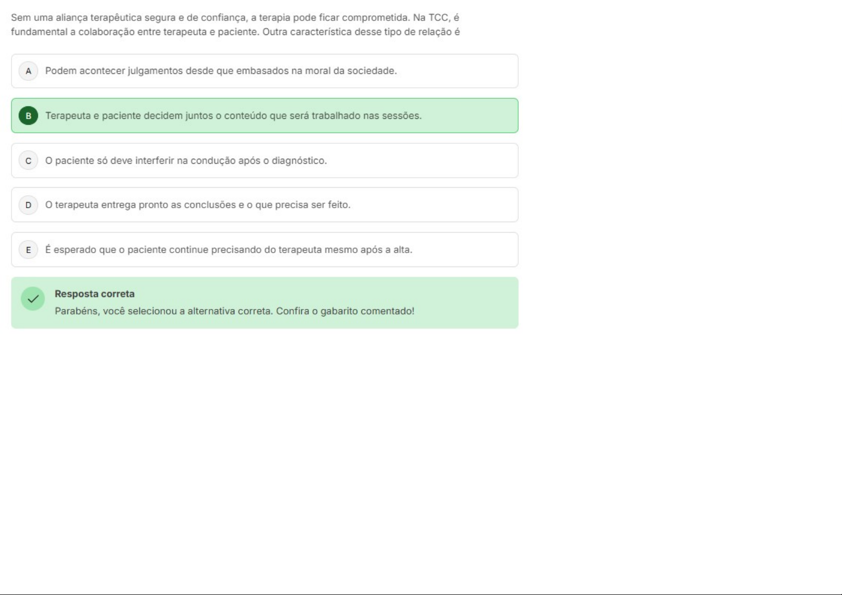 Sem uma aliança terapêutica segura e de confiança, a terapia pode ficar comprometida. Na TCC, é fundamental a colaboração entre terapeuta e paciente. Outra característica desse tipo de relação é A Podem acontecer julgamentos desde que embasados na moral da sociedade. Terapeuta e paciente decidem juntos 0 conteúdo que será trabalhado nas sessões. C paciente só deve interferir na condução após 0 diagnóstico. D terapeuta entrega pronto as conclusões e 0 que precisa ser feito. E É esperado que o paciente continue precisando do terapeuta mesmo após a alta. Resposta correta Parabéns, você selecionou a alternativa correta. Confira o gabarito comentado!