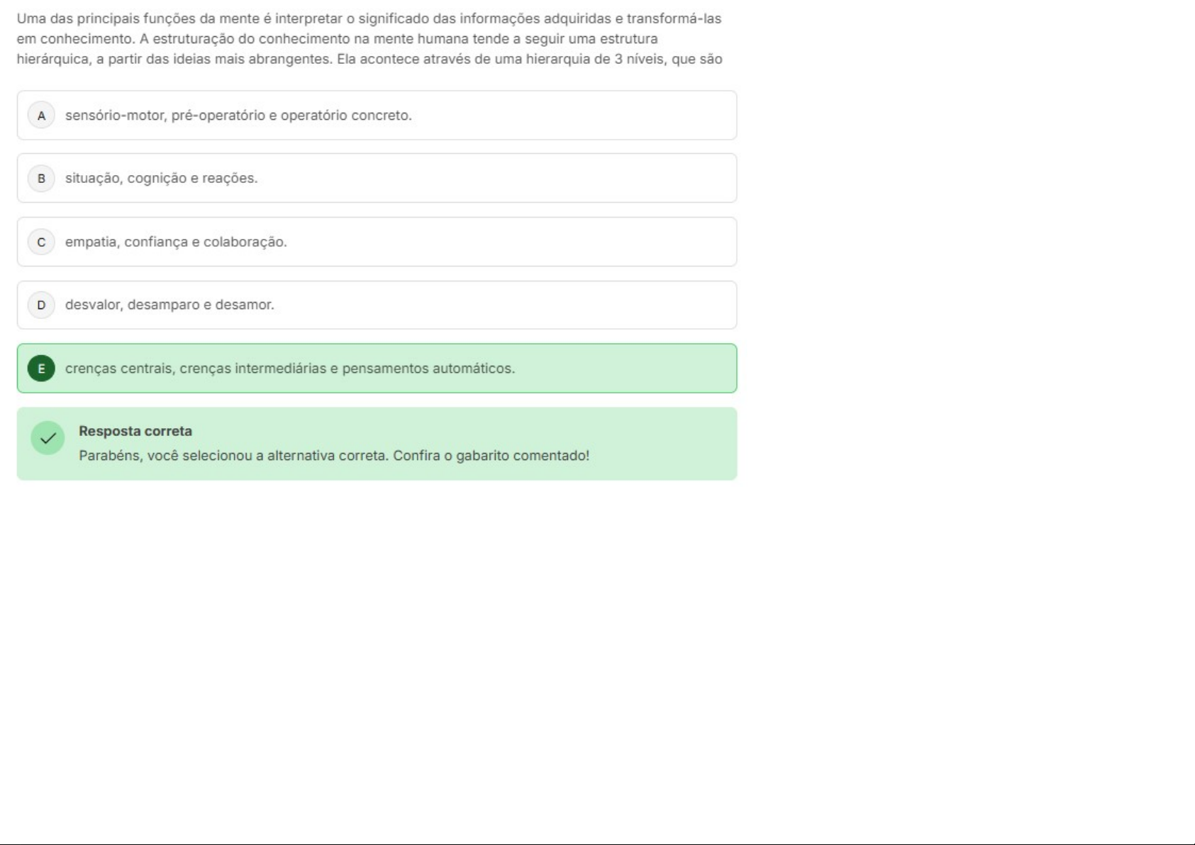 Uma das principais funções da mente é interpretar 0 significado das informações adquiridas e transformá-las em conhecimento. A estruturação do conhecimento na mente humana tende a seguir uma estrutura hierárquica, a partir das ideias mais abrangentes. Ela acontece através de uma hierarquia de 3 níveis, que são A sensório-motor, pré-operatório e operatório concreto. B situação, cognição e reações. C empatia, confiança e colaboração. D desvalor, desamparo e desamor. E crenças centrais, crenças intermediárias e pensamentos automáticos. Resposta correta Parabéns, você selecionou a alternativa correta. Confira gabarito comentado!