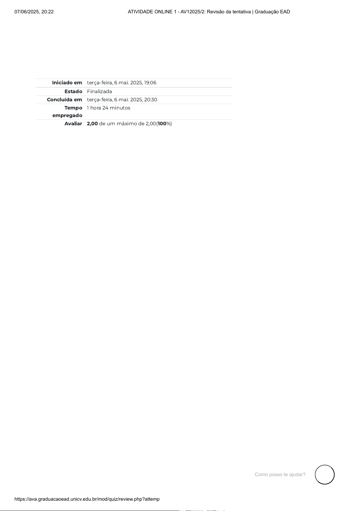 Iniciado em terça-feira, 6 mai. 2025, 19:06 Estado Finalizada Concluída em terça-feira, 6 mai. 2025, 20:30 Tempo empregado 1 hora 24 minutos Avaliar 2,00 de um máximo de 2,00(100%) Como posso te ajudar? 07/06/2025, 20:22 ATIVIDADE ONLINE 1 - AV12025/2: Revisão da tentativa | Graduação EAD https://ava.graduacaoead.unicv.edu.br/mod/quiz/review.php?attempt=5607402&cmid=261340 1/10 Questão 1 Correto Atingiu 0,20 de 0,20 Relacione os pontos relevantes sobre a importância de se ter um estoque e suas respectivas descrições e, então, assinale a alternativa que apresenta a ordem correta. 1. Melhorar o serviço ao cliente. 2. Proteção contra contingências. 3. Proteção contra mudanças de preços. ( ) Mesmo que problemas ocorram dentro da empresa, como por exemplo: funcionários em greve, intempéries da natureza, mudança na economia/política, afetando e prejudicando a produção; quando se tem ainda um produto em estoque, é possível minimizar os efeitos do problema existente, pelo menos de forma temporária. ( ) Sabemos que quando a inflação aumenta, a mudança de preços necessariamente ocorre, aumentando de forma proporcional ao aumento da inflação. Quando nós temos um estoque, podemos tentar minimizar o impacto do aumento de preço, seja ele de fornecedores ou da empresa fabricante. ( ) Se a empresa tem um estoque, ela sabe que de fato há o produto sempre disponível, sabendo que o que é prometido ao consumidor será cumprido. Com isso, os setores de venda/comercial podem fazer o seu trabalho de uma forma mais tranquila. Escolha uma opção: Escolha uma opção: a. 2,1,3 b. 1,2,3 c. 3,2,1 d. 1,3,2 e. 2,3,1 ✓ Sua resposta está correta. A resposta correta é: 2,3,1 Como posso te ajudar? 07/06/2025, 20:22 ATIVIDADE ONLINE 1 - AV12025/2: Revisão da tentativa | Graduação EAD https://ava.graduacaoead.unicv.edu.br/mod/quiz/review.php?attempt=5607402&cmid=261340 2/10 Questão 2 Correto Atingiu 0,20 de 0,20 A embalagem tem um papel bem mais amplo no que se refere a logística, visto que uma boa embalagem industrial minimiza problemas que podem ocorrer durante as etapas logísticas de um produto. As embalagens são divididas logisticamente em tipos. Relacione alguns desses tipos de embalagens e suas características, então, assinale a alternativa que apresenta a ordem correta. 1. Primárias. 2. Secundárias. 3. Terciárias. 4. Quaternárias. 5. Quinárias. ( ) São as embalagens que acondicionam as primárias, mas nem sempre um produto tem essa embalagem, pois sua utilização é uma questão logística de cada fabricante. ( ) São utilizadas para transporte no armazém, com a função de simplificar. Como exemplo podemos citar os paletes nos armazéns. ( ) São embalagens que acondicionam produtos que serão transportados por longas distâncias, como por exemplo, contêineres. ( ) São as que tocam o produto de forma direta, ou seja, elas são a barreira de proteção entre o produto e o consumidor. ( ) São as que agrupam várias embalagens com a finalidade de facilitar o transporte das mesmas. Um exemplo seriam as caixas de papelão que vemos sendo abertas no mercado para colocar os produtos nas gôndolas. Escolha uma opção: Escolha uma opção: a. 4,3,2,1,5. b. 2,3,1,4,5. c. 2,4,5,1,3. ✓ d. 5,2,4,3,1. e. 2,5,4,1,3. Sua resposta está correta. A resposta correta é: 2,4,5,1,3. Como posso te ajudar? 07/06/2025, 20:22 ATIVIDADE ONLINE 1 - AV12025/2: Revisão da tentativa | Graduação EAD https://ava.graduacaoead.unicv.edu.br/mod/quiz/review.php?attempt=5607402&cmid=261340 3/10 Questão 3 Correto Atingiu 0,20 de 0,20 Avalie as afirmações a seguir que segundo (BERTAGLIA, 2003, p. 170), caracterizam os conceitos de distribuição dentro da logística: BERTAGLIA, P. R.; Logística e Gerenciamento da Cadeia de Abastecimento. São Paulo: Saraiva, 2005. I. Distribuir é uma função dinâmica e bastante diversa, porém invariável de empresa para empresa. II. A distribuição precisa ser extremamente flexível para enfrentar as diversas demandas e restrições que lhe são impostas, sejam elas físicas ou legais. III.O processo de distribuição tem um alto nível de complexidade e importância, pois ele pode agregar ou desagregar valor, dependendo da eficácia da distribuição. É correto o que se afirma em: Escolha uma opção: Escolha uma opção: a. III, apenas. b. II e III, apenas ✓ c. I e II, apenas. d. I, II e III, apenas. e. I e III, apenas. Sua resposta está correta. A resposta correta é: II e III, apenas Como posso te ajudar? 07/06/2025, 20:22 ATIVIDADE ONLINE 1 - AV12025/2: Revisão da tentativa | Graduação EAD https://ava.graduacaoead.unicv.edu.br/mod/quiz/review.php?attempt=5607402&cmid=261340 4/10 Questão 4 Correto Atingiu 0,20 de 0,20 Questão 5 Correto Atingiu 0,20 de 0,20 Visando uma maior segurança de que não haverá problemas antes do envio dos produtos, visando minimizá-los, ou, zerá-los ao final do processo, é realizada uma nova conferência. Essa nova conferência é realizada em uma das etapas da operação de armazenagem, que seria a etapa final do processo. Escolha uma opção: Escolha uma opção: a. Estocagem. b. Recebimento de Produtos. c. Separação de Pedidos. d. Embalagem. e. Expedição. ✓ Sua resposta está correta. A resposta correta é: Expedição. Quando tratamos do assunto relacionado às melhores alternativas de armazenamento, estamos nos referindo aos tipos de armazenagem, assim como, às finalidades de cada uma delas. Qual o principal impacto da escolha da alternativa correta de armazenagem? Escolha uma opção: Escolha uma opção: a. Impacto na gestão de pessoas. b. Impacto na qualidade de atendimento ao público interno. c. Impacto nos custos dos produtos. ✓ d. Impacto na gestão estratégica da empresa. e. Impacto nas políticas sociais da empresa. Sua resposta está correta. A resposta correta é: Impacto nos custos dos produtos. Como posso te ajudar? 07/06/2025, 20:22 ATIVIDADE ONLINE 1 - AV12025/2: Revi