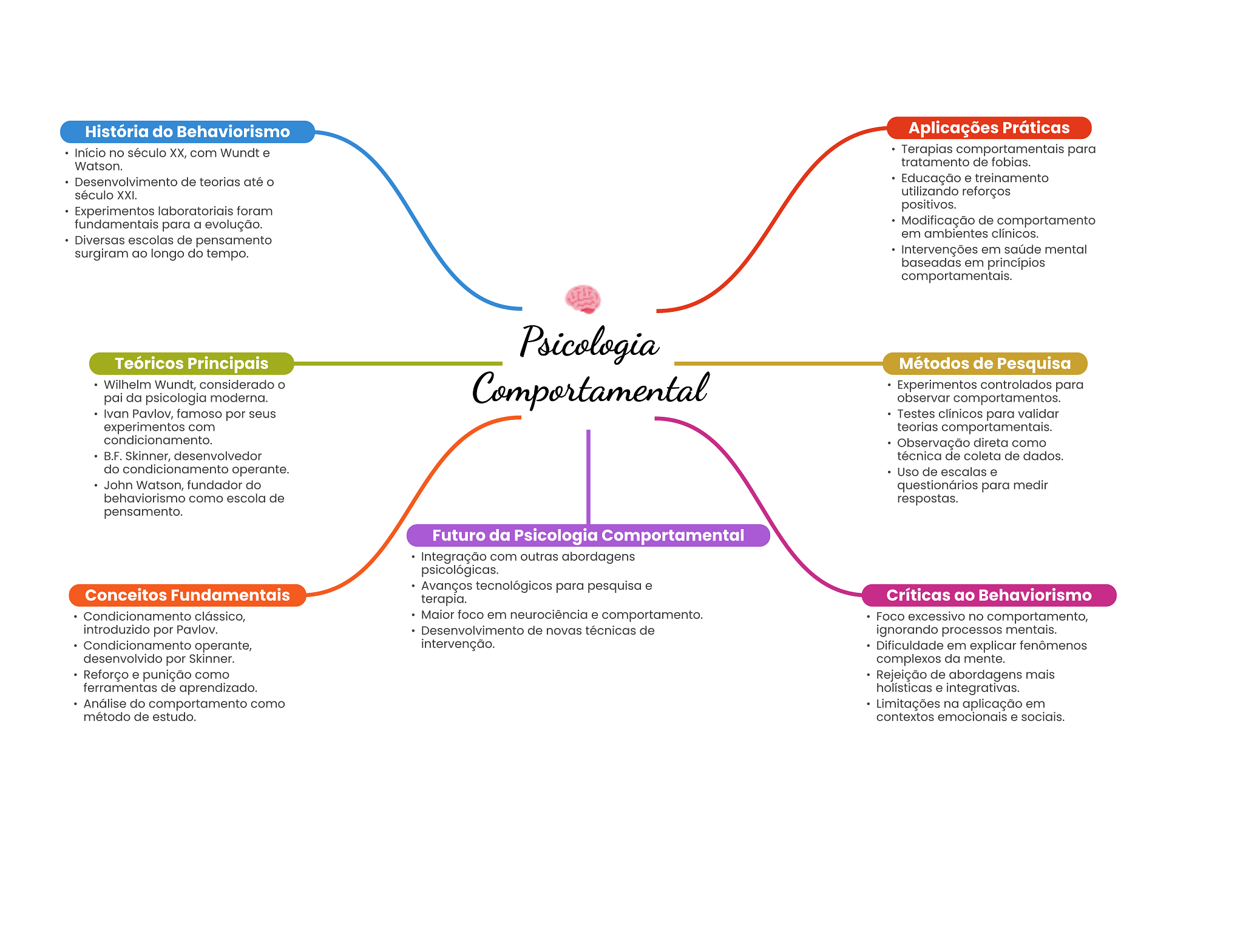 História do Behaviorismo Aplicações Práticas Início no século XX, com Wundt e Terapias comportamentais para Watson. tratamento de fobias. Desenvolvimento de teorias até Educação e treinamento século XXI. utilizando reforços Experimentos laboratoriais foram positivos. fundamentais para a evolução. Modificação de comportamento em ambientes clínicos. Diversas escolas de pensamento surgiram ao longo do tempo. Intervenções em saúde mental baseadas em princípios comportamentais. Psicologia Teóricos Principais Métodos de Pesquisa Wilhelm Wundt, considerado Comportamental Experimentos controlados para pai da psicologia moderna. observar comportamentos. Ivan Pavlov, famoso por seus Testes clínicos para validar experimentos com teorias comportamentais. condicionamento. Observação direta como B.F. Skinner, desenvolvedor técnica de coleta de dados. do condicionamento operante. Uso de escalas e John Watson, fundador do questionários para medir behaviorismo como escola de respostas. pensamento. Futuro da Psicologia Comportamental Integração com outras abordagens psicológicas. Avanços tecnológicos para pesquisa e Conceitos Fundamentais terapia. Críticas ao Behaviorismo Condicionamento clássico, Maior foco em neurociência e comportamento. Foco excessivo no comportamento, introduzido por Pavlov. Desenvolvimento de novas técnicas de ignorando processos mentais. Condicionamento operante, intervenção. Dificuldade em explicar fenômenos desenvolvido por Skinner. complexos da mente. Reforço e punição como Rejeição de abordagens mais ferramentas de aprendizado. holísticas e integrativas. Análise do comportamento como Limitações na aplicação em método de estudo. contextos emocionais e sociais.