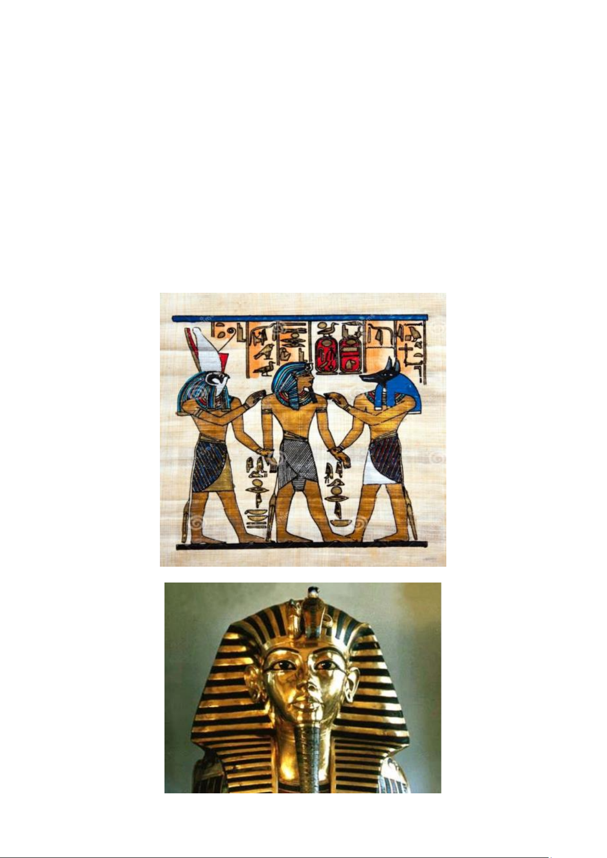Arte Egípcia Como todos os aspectos do cotidiano do Egito Antigo, a arte estava permeada por aspectos religiosos. Na escultura destacam-se as máscaras mortuárias dos faraós, adornadas como pedras semipreciosas e Lápis-lazúli, e na arquitetura as pirâmides e estruturas colossais são características marcantes da arte egípcia. Quanto a pintura, destacam-se: • A Lei da Frontalidade; • Antropozoomorfismo; • Hieróglifos; • Apresenta-se em primeiro plano com ausência de profundidade; • Cores "chapadas" (ausência de variação tonal); • A ideia do anonimato (a não identificação do autor).