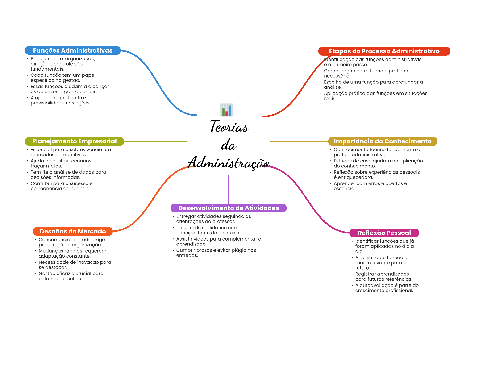 Funções Administrativas Etapas do Processo Administrativo Planejamento, organização, dentificação das funções administrativas direção e controle são é primeiro passo. fundamentais. Comparação entre teoria e prática é Cada função tem um papel necessária. específico na gestão. Escolha de uma função para aprofundar a Essas funções ajudam a alcançar análise. objetivos organizacionais. Aplicação prática das funções em situações A aplicação prática traz reais. previsibilidade nas ações. Teorias Planejamento Empresarial da Importância do Conhecimento Essencial para a sobrevivência em Conhecimento teórico fundamenta a mercados competitivos. prática administrativa. Ajuda a construir cenários e Administração Estudos de caso ajudam na aplicação traçar metas. do conhecimento. Permite a análise de dados para Reflexão sobre experiências pessoais decisões informadas. é enriquecedora. Contribui para sucesso e Aprender com erros e acertos é permanência do negócio. essencial. Desenvolvimento de Atividades Entregar atividades seguindo as orientações do professor. Utilizar livro didático como Desafios do Mercado principal fonte de pesquisa. Reflexão Pessoal Concorrência acirrada exige Assistir vídeos para complementar O Identificar funções que já preparação e organização. aprendizado. foram aplicadas no dia a Mudanças rápidas requerem Cumprir prazos e evitar plágio nas dia. adaptação constante. entregas. Analisar qual função é Necessidade de inovação para mais relevante para O se destacar. futuro. Gestão eficaz é crucial para Registrar aprendizados enfrentar desafios. para futuras referências. A autoavaliação é parte do crescimento profissional.