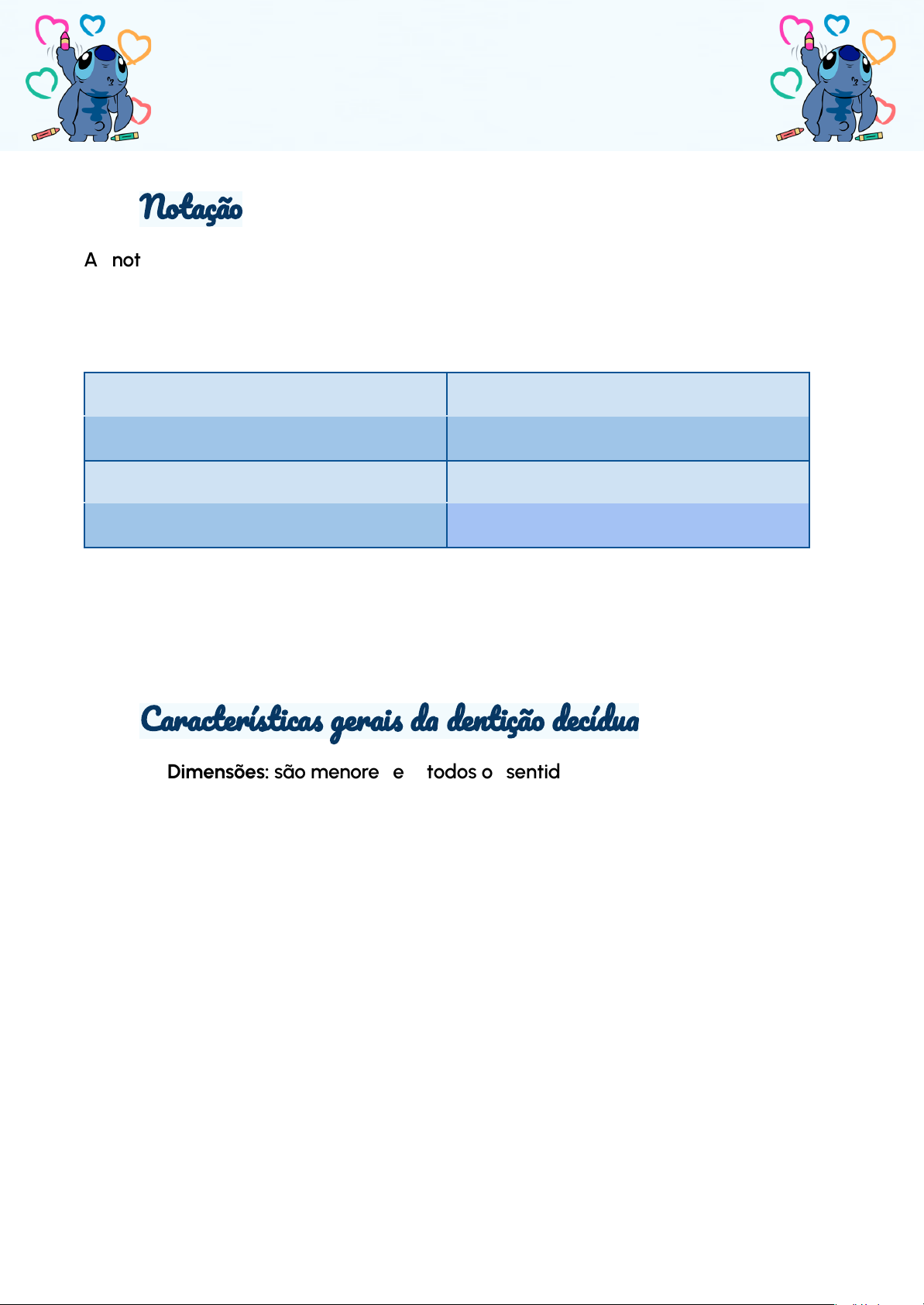 @ juf roe so do nto ODONTOPEDIATRIA Anatomia dentária decídua Notação A notação na dentição decídua segue a mesma lógica da permanente, mudando apenas a numeração dos quadrantes e a quantidade de dentes. Na dentição permanente temos 8 dentes por quadrante, na decídua temos 5. Quadrante superior direito Quadrante superior esquerdo 55 54 53 52 51 61 62 63 64 65 Quadrante inferior direito Quadrante inferior esquerdo 85 84 83 82 81 71 72 73 74 75 Sendo: 51/61/71/81 - incisivos centrais; 52/62/72/82- incisivos laterais; 53/63/73/83- caninos; 54/64/74/84- primeiros molares, 55/65/75/85 - segundos molares Características gerais da dentição decídua 1) Dimensões: são menores em todos os sentidos; 2) Coloração: apresentam coloração branco-leitosa; 3) Esmalte e dentina: possuem menor espessura e maior permeabilidade (mais suceptível à lesões de cárie e pulpares); 4) Colo cervical: mais constricto e acentuado (devido a isso, os grampos de isolamento absoluto ficam subgengivais.) 5) Cúspides: mais afiadas que os permanentes. 6) Raizes: mais longas que a coroa, e mais divergentes. (para permitir o desenvolvimento do germe dentário permanente.) 7) Cornos pulpares mais proeminentes (principalmente o mesial) e canais radiculares mais delgados. @ juf roe so do nto 8) Bossas cervicais proeminentes; Anatomia individual dentária Incisivo central superior decíduo Coroa: ★ Formato trapezoidal, com base maior p/ incisal. ★ Distância mesio-distal maior que a cervico-incisal. (Dente mais largo do que alto. ★ Ângulo disto-incisal arredondado. ★ Face palatina: cristas marginais e cíngulo bem acentuados e definidos. Raiz/anatomia interna: ★ Raiz única, 2x maior que a coroa e levemente vestibularizada. ★ Anatomia interna: canal único e reto. Possui 3 cornos pulpares, sendo o mesial o mais acentuado. Incisivo lateral superior decíduo Coroa: ★ Distância cervico-incisal maior que a mesio-distal. ★ Menor que o ICS decíduo em todas dimensões. ★ Ângulo disto-incisal arredondado. ★ Face palatina: cristas marginais e cíngulo menos evidentes comparadas ao ICS decíduo. @ juf roe so do nto Raiz/anatomia interna: ★ Raiz única, 2x maior que a coroa e com o ápice levemente vestibularizado. ★ Canal único, reto e ovalado. Podem existir canais acessórios/laterais. ★ A câmara pulpar possui formato ovalado, e dois cornos, sendo o mesial mais evidente. Incisivo central inferior decíduo Coroa: ★ Distância cervico-incisal maior que a mesio-distal. ★ Possui ângulos incisais retos. ★ Menor dente do grupo dos incisivos. Raiz/anatomia interna ★ Raiz: Mais longa que a coroa. Achatada no sentido mesio-distal. ★ Anatomia interna: Canal único e ovalado, com 2 cornos: um mesial e um distal. Incisivo lateral inferior decíduo Coroa: ★ Distância mesio-distal maior que a cervico-incisal. ★ Ângulo disto-incisal arredondado. ★ Parece o incisivo central superior decíduo. ★ Maior que os ICI decíduos. @ juf roe so do nto Raiz/anatomia: ★ Raiz: mais longa e estreita que o ICI decíduo. ★ Anatomia interna: canal único, reto, formato ovalado. Possui 2 cornos pulpares: distal e mesial. Canino superior decíduo Coroa: ★ Distância cervico-incisal e mesio-distal equivalentes. ★ Mais robustos. ★ Ângulos arredondados. ★ Face distal menor e mais arredondada; ponta da cúspide distalizada. ★ Face palatina: cíngulo e cristas bem evidentes. Raiz/anatomia interna: ★ Raiz: mais robusta; leve vestibularização; ★ Anatomia interna: câmara pulpar ovalada ou triangular; canal único e reto. ★ Possui 3 cornos pulpares: mesial, central e distal. Sendo o central mais evidente. Canino inferior decíduo Coroa: ★ Distância cervico-incisal maior que mesio-distal. ★ Não é tão robusto e possui anatomia discreta. ★ Face distal menor, ponta de cúspide distalizada. @ juf roe so do nto Raiz/anatomia interna ★ Raiz 2x maior que coroa e mais estreita que o CS decíduo. ★ Anatomia interna: câmara pulpar oval/triangular, mais ampla na cervical e estreita em direção ao ápice. ★ Canal único e reto. 1° molar superior decíduo Coroa: ★ “Semelhante” ao 1PMS, possui formato trapezoidal com base maior voltada para a cervical. ★ Maior na dimensão mesio-distal do que na cervico-incisal. (Mais largo). ★ Possui o tubérculo de Zuckerkandl* bem evidente na face vestibular, na região cervico-mesial. ★ Pode ter 3-4 cúspides: ○ 1 mesio-vestibular, 1 disto-vestibular e 1 palatina; ○ 1 mesio-vestibular, 1 disto-vestibular e 1 mesio-palatina, 1 disto-palatina Raizes: ★ Possui três raízes, sendo elas: ○ 1 palatina (mais volumosa) ○ 1 disto-vestibular @ juf roe so do nto ○ 1 mesio-vestibular ★ São longas, achatadas e divergentes. Anatomia interna: ★ Câmara pulpar: possui 3 ou 4 cornos pulpares, sendo o mesial o mais evidente. ★ Canais radiculares: ○ Raíz mesio-vestibular: pode possuir: ■ 1 canal -> MV ■ 2 canais -> MV1 e MV2 ○ Raiz disto-vestibular: 1 canal ○ Raiz palatina: 1 canal (mais volumoso). 2° molar superior decíduo: Coroa: ★ Semelhante ao 1MS permanente (isomorfismo), porém, com a anatomia mais delicada. ★ É maior que o 1MS decíduo. ★ Possui 4 cúspides: ○ 1 mesio-palatina ○ 1 disto-palatina ○ 1 mesio-vestibular @ juf roe so do nto ○ 1 disto-vestibular ★ Possui ponte de esmalte. ★ Tubérculo de Zuckerkandl mais discreto, e possui o tubérculo de Carabelli na palatina. Raízes: ★ Possui três raízes, sendo elas: ○ 1 palatina (mais volumosa) ○ 1 disto-vestibular ○ 1 mesio-vestibular ★ São longas, achatadas e divergentes. Anatomia interna (igual ao primeiro molar superior decíduo) ★ Câmara pulpar: possui 3 ou 4 cornos pulpares, sendo o mesial o mais evidente. ★ Canais radiculares: ○ Raíz mesio-vestibular: pode possuir: ■ 1 canal -> MV ■ 2 canais -> MV1 e MV2 ○ Raiz disto-vestibular: 1 canal ○ Raiz palatina: 1 canal (mais volumoso). @ juf roe so do nto 1° mo