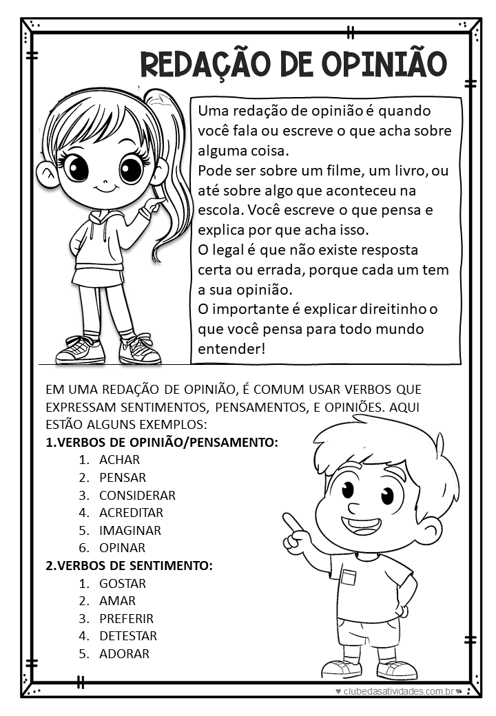 REDAÇÃO DE OPINIÃO Uma redação de opinião é quando você fala ou escreve que acha sobre alguma coisa. Pode ser sobre um filme, um livro, ou até sobre algo que aconteceu na escola. Você escreve que pensa e explica por que acha isso. legal é que não existe resposta certa ou errada, porque cada um tem a sua opinião. importante é explicar direitinho que você pensa para todo mundo entender! EM UMA REDAÇÃO DE OPINIÃO, É COMUM USAR VERBOS QUE EXPRESSAM SENTIMENTOS, PENSAMENTOS, E OPINIÕES. AQUI ESTÃO ALGUNS EXEMPLOS: 1.VERBOS DE OPINIÃO/PENSAMENTO 1. ACHAR 2. PENSAR 3. CONSIDERAR 4. ACREDITAR 5. IMAGINAR 6. OPINAR 2.VERBOS DE SENTIMENTO: 1. GOSTAR 2. AMAR 3. PREFERIR 4. DETESTAR 5. ADORAR clubedasatividades com br