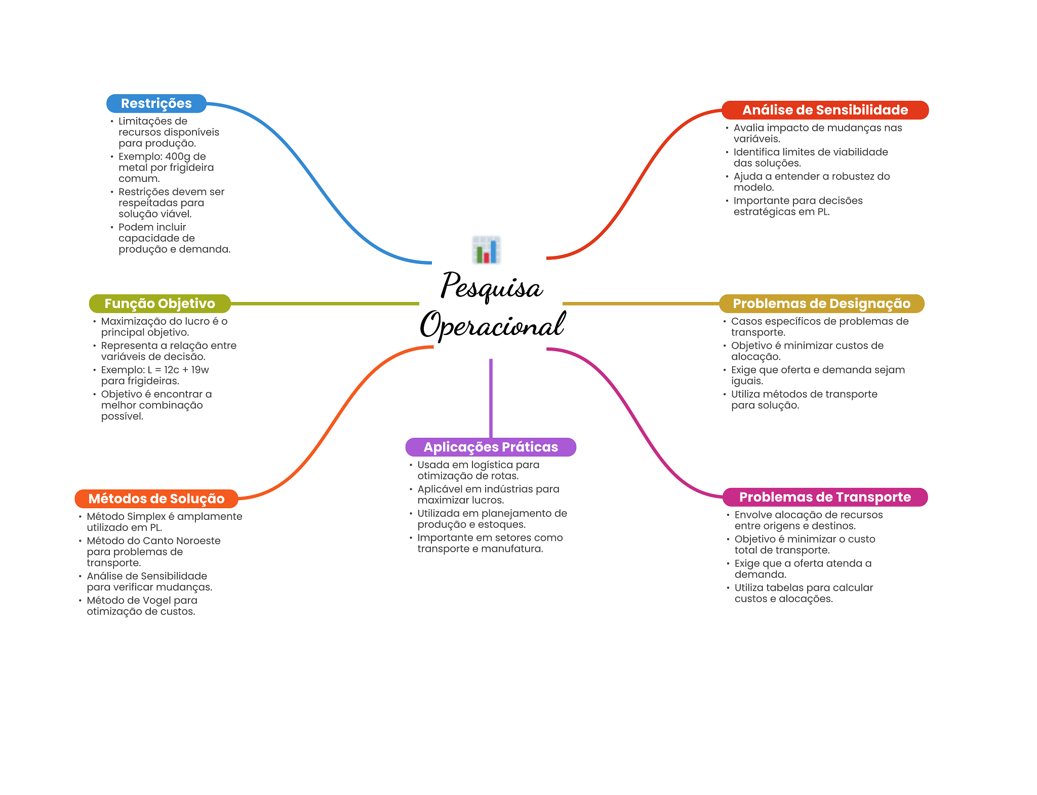 Restrições Análise de Sensibilidade Limitações de recursos disponíveis Avalia impacto de mudanças nas variáveis. para produção. Exemplo: 400g de Identifica limites de viabilidade metal por frigideira das soluções. comum. Ajuda a entender a robustez do Restrições devem ser modelo. respeitadas para Importante para decisões solução viável. estratégicas em PL. Podem incluir capacidade de produção e demanda. Pesquisa Função Objetivo Problemas de Designação Maximização do lucro é O Operacional Casos específicos de problemas de principal objetivo. transporte. Representa a relação entre Objetivo é minimizar custos de variáveis de decisão. alocação. Exemplo: L = 12c + 19w Exige que oferta e demanda sejam para frigideiras. iguais. Objetivo é encontrar a Utiliza métodos de transporte melhor combinação para solução. possível. Aplicações Práticas Usada em logística para otimização de rotas. Aplicável em indústrias para Métodos de Solução maximizar lucros. Problemas de Transporte Método Simplex é amplamente Utilizada em planejamento de Envolve alocação de recursos utilizado em PL. produção e estoques. entre origens e destinos. Método do Canto Noroeste Importante em setores como Objetivo é minimizar custo para problemas de transporte e manufatura. total de transporte. transporte. Exige que a oferta atenda a Análise de Sensibilidade demanda. para verificar mudanças. Utiliza tabelas para calcular Método de Vogel para custos e alocações. otimização de custos.