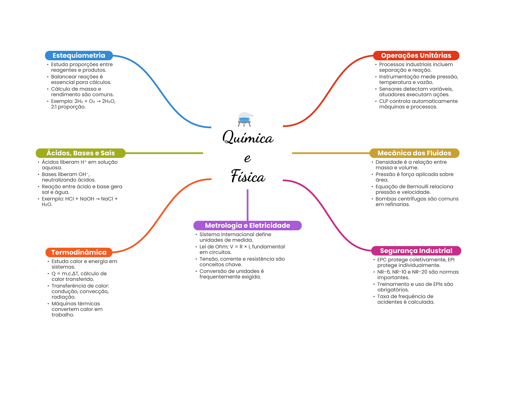 Estequiometria Operações Unitárias Estuda proporções entre Processos industriais incluem reagentes e produtos. separação e reação. Balancear reações é Instrumentação mede pressão, essencial para cálculos. temperatura e vazão. Cálculo de massa e Sensores detectam variáveis, rendimento são comuns. atuadores executam ações. Exemplo: + 2H2O, CLP controla 2:1 proporção. máquinas e processos. Química Ácidos, Bases e Sais Mecânica dos Fluidos Ácidos liberam H+ em solução e Densidade é a relação entre aquosa. massa e volume. Bases liberam Física Pressão é força aplicada sobre neutralizando ácidos. área. Reação entre ácido e base gera Equação de Bernoulli relaciona sal e água. pressão e velocidade. Exemplo: HCI + NaOH NaCl + Bombas centrífugas são comuns H2O. em refinarias. Metrologia e Eletricidade Sistema Internacional define unidades de medida. Lei de Ohm: V = R I, fundamental Termodinâmica em circuitos. Segurança Industrial Estuda calor e energia em Tensão, corrente e resistência são EPC protege coletivamente, EPI sistemas. conceitos chave. protege individualmente. Q = m.c.AT, cálculo de Conversão de unidades é NR-6, NR-10 e NR-20 são normas calor transferido. frequentemente exigida. importantes. Transferência de calor: Treinamento e uso de EPIs são condução, obrigatórios. radiação. Taxa de frequência de Máquinas térmicas acidentes é calculada. convertem calor em trabalho.
