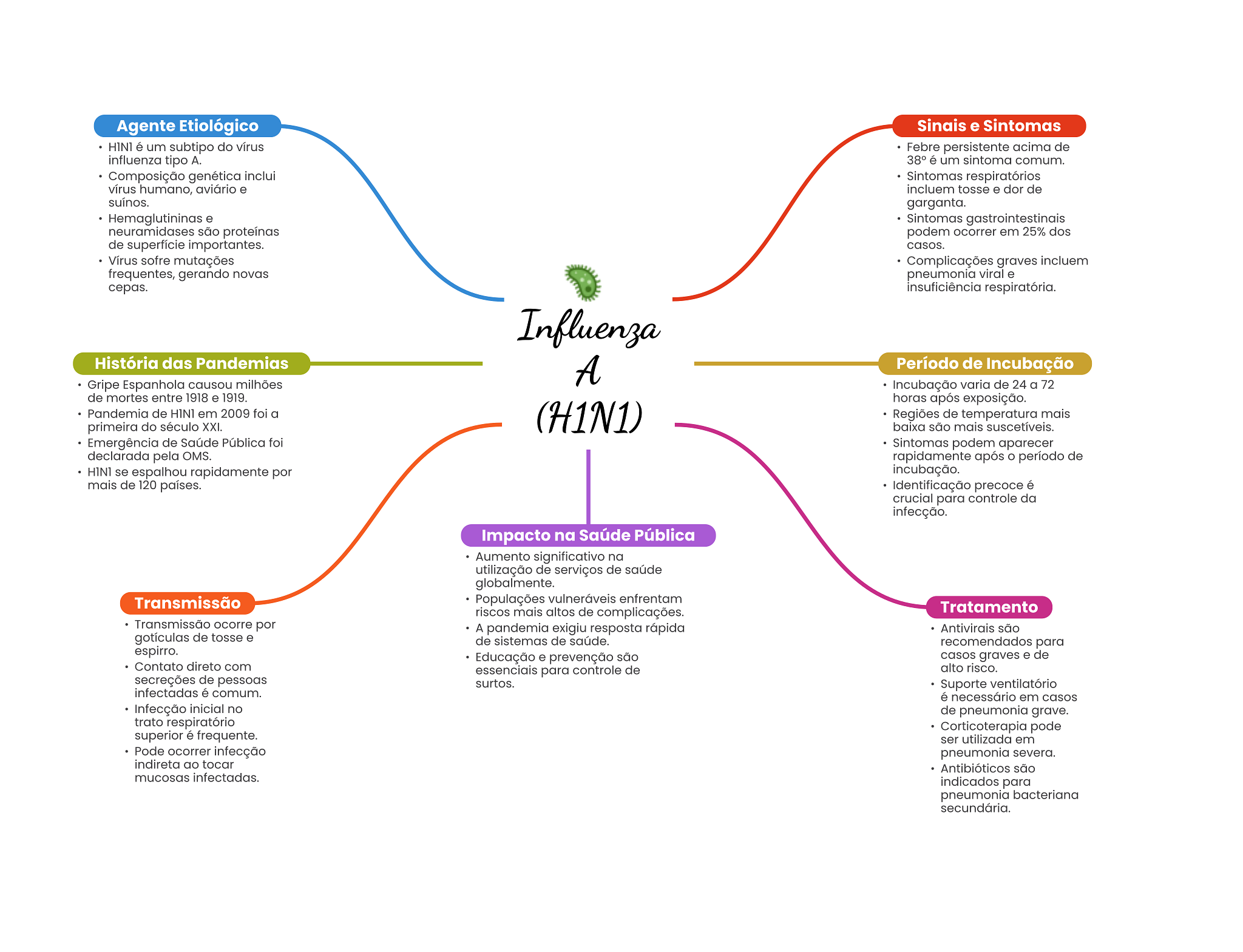 Agente Etiológico Sinais e Sintomas H1N1 é um subtipo do vírus Febre persistente acima de influenza tipo A. 38° é um sintoma comum. Composição genética inclui Sintomas respiratórios vírus humano, aviário e incluem tosse e dor de suínos. garganta. Hemaglutininas e Sintomas gastrointestinais neuramidases são proteínas podem ocorrer em 25% dos de superfície importantes. casos. Vírus sofre mutações Complicações graves incluem frequentes, gerando novas pneumonia viral e cepas. insuficiência respiratória. Influenza História das Pandemias A Período de Incubação Gripe Espanhola causou milhões Incubação varia de 24 a 72 de mortes entre 1918 e 1919. horas após exposição. Pandemia de em 2009 foi a primeira do século XXI. (H1N1) Regiões de temperatura mais baixa são mais suscetíveis. Emergência de Saúde Pública foi Sintomas podem aparecer declarada pela OMS. rapidamente após O período de se espalhou rapidamente por incubação. mais de 120 países. Identificação precoce é crucial para controle da infecção. Impacto na Saúde Pública Aumento significativo na utilização de serviços de saúde globalmente. Transmissão Populações vulneráveis enfrentam riscos mais altos de complicações. Tratamento Transmissão ocorre por A pandemia exigiu resposta rápida Antivirais são gotículas de tosse e de sistemas de saúde. recomendados para espirro. Educação e prevenção são casos graves e de Contato direto com essenciais para controle de alto risco. secreções de pessoas surtos. Suporte ventilatório infectadas é comum. é necessário em casos Infecção inicial no de pneumonia grave. trato respiratório Corticoterapia pode superior é frequente. ser utilizada em Pode ocorrer infecção pneumonia severa. indireta ao tocar Antibióticos são mucosas infectadas. indicados para pneumonia bacteriana secundária.