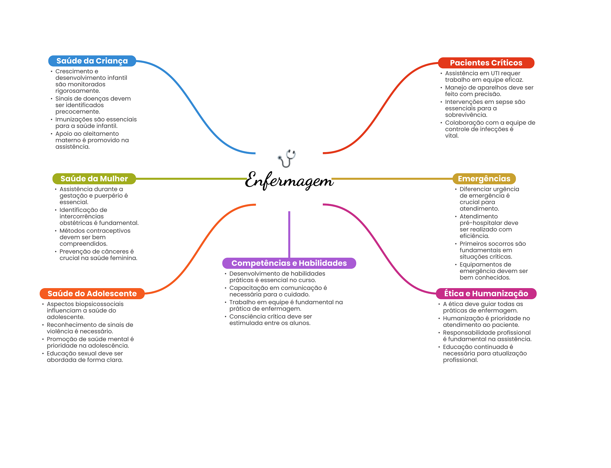 Saúde da Criança Pacientes Críticos Crescimento e Assistência em UTI requer desenvolvimento infantil trabalho em equipe eficaz. são monitorados rigorosamente. Manejo de aparelhos deve ser feito com precisão. Sinais de doenças devem ser identificados Intervenções em sepse são essenciais para a precocemente. sobrevivência. Imunizações são essenciais para a saúde infantil. Colaboração com a equipe de controle de infecções é Apoio ao aleitamento vital. materno é promovido na assistência. Saúde da Mulher Enfermagem Emergências Assistência durante a Diferenciar urgência gestação e puerpério é de emergência é essencial. crucial para Identificação de atendimento. intercorrências Atendimento obstétricas é fundamental. pré-hospitalar deve Métodos contraceptivos ser realizado com devem ser bem eficiência. compreendidos. Primeiros socorros são Prevenção de cânceres é fundamentais em crucial na saúde feminina. situações Competências e Habilidades Equipamentos de Desenvolvimento de habilidades emergência devem ser bem conhecidos. práticas é essencial no curso. Capacitação em comunicação é Saúde do Adolescente necessária para O cuidado. Ética e Humanização Aspectos biopsicossociais Trabalho em equipe é fundamental na A ética deve guiar todas as influenciam a saúde do prática de enfermagem. práticas de enfermagem. adolescente. Consciência crítica deve ser Humanização é prioridade no Reconhecimento de sinais de estimulada entre OS alunos. atendimento ao paciente. violência é necessário. Responsabilidade profissional Promoção de saúde mental é é fundamental na assistência. prioridade na adolescência. Educação continuada é Educação sexual deve ser necessária para atualização abordada de forma clara. profissional.