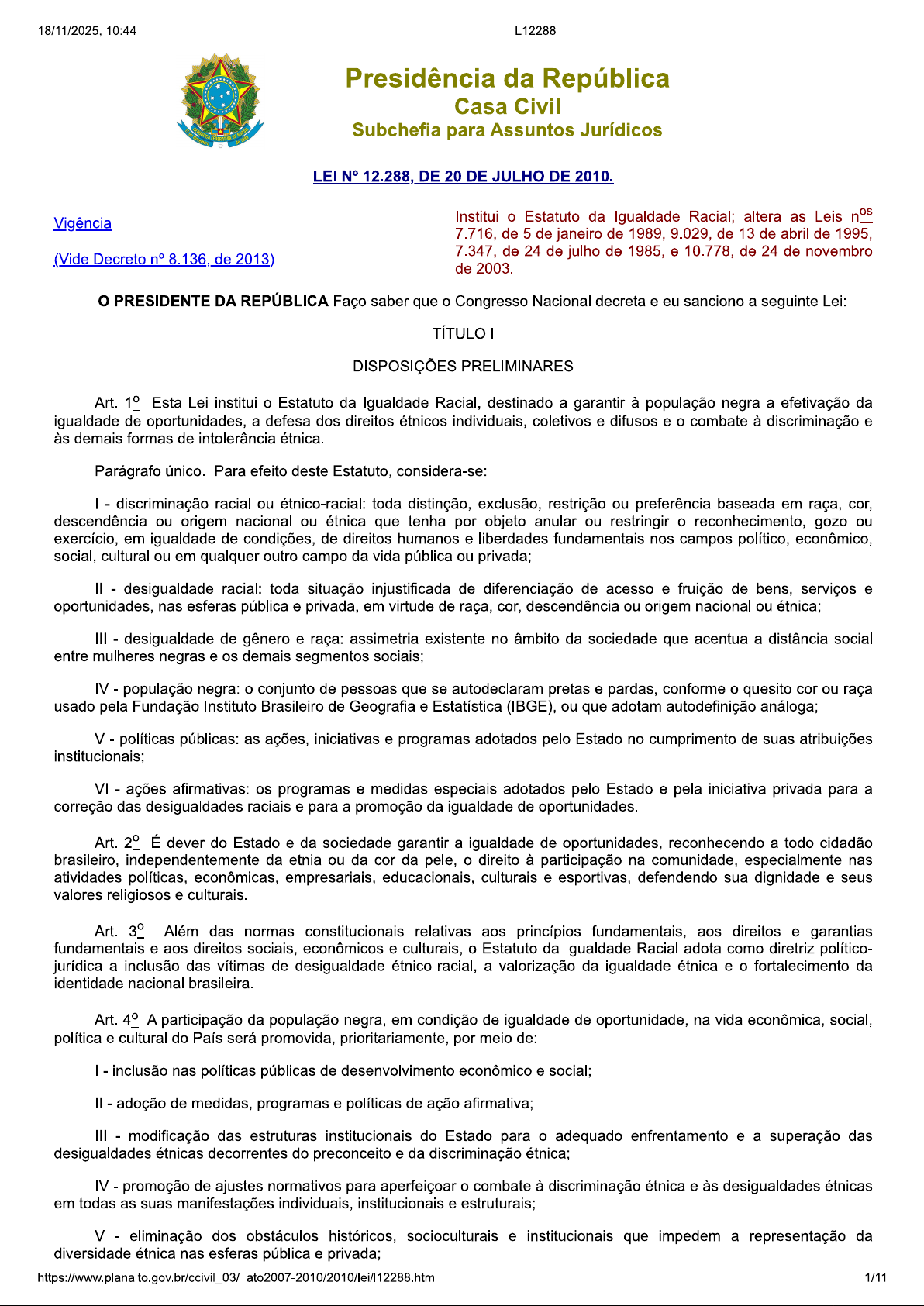 18/11/2025, 10:44 L12288 Presidência da República Casa Civil Subchefia para Assuntos Jurídicos LEI N° 12.288, DE 20 DE JULHO DE 2010. Vigência Institui Estatuto da Igualdade Racial; altera as Leis 7.716, de 5 de janeiro de 1989, 9.029, de 13 de abril de 1995, (Vide Decreto n° 8.136, de 2013) 7.347, de 24 de julho de 1985, e 10.778, de 24 de novembro de 2003. PRESIDENTE DA REPÚBLICA Faço saber que Congresso Nacional decreta e eu sanciono a seguinte Lei: TÍTULO DISPOSIÇÕES PRELIMINARES Art. Esta Lei institui o Estatuto da Igualdade Racial, destinado a garantir à população negra a efetivação da igualdade de oportunidades, a defesa dos direitos étnicos individuais, coletivos e difusos e o combate à discriminação e às demais formas de intolerância étnica. Parágrafo único. Para efeito deste Estatuto, considera-se: discriminação racial ou étnico-racial: toda distinção, exclusão, restrição ou preferência baseada em raça, cor, descendência ou origem nacional ou étnica que tenha por objeto anular ou restringir o reconhecimento, gozo ou exercício, em igualdade de condições, de direitos humanos e liberdades fundamentais nos campos político, econômico, social, cultural ou em qualquer outro campo da vida pública ou privada; desigualdade racial: toda situação injustificada de diferenciação de acesso e fruição de bens, serviços e oportunidades, nas esferas pública e privada, em virtude de raça, cor, descendência ou origem nacional ou étnica; III desigualdade de gênero e raça: assimetria existente no âmbito da sociedade que acentua a distância social entre mulheres negras e os demais segmentos sociais; IV população negra: o conjunto de pessoas que se autodeclaram pretas e pardas, conforme o quesito cor ou raça usado pela Fundação Instituto Brasileiro de Geografia e Estatística (IBGE), ou que adotam autodefinição análoga; V políticas públicas: as ações, iniciativas e programas adotados pelo Estado no cumprimento de suas atribuições institucionais; VI ações afirmativas: os programas e medidas especiais adotados pelo Estado e pela iniciativa privada para a correção das desigualdades raciais e para a promoção da igualdade de oportunidades. Art. 2° É dever do Estado e da sociedade garantir a igualdade de oportunidades, reconhecendo a todo cidadão brasileiro, independentemente da etnia ou da cor da pele, o direito à participação na comunidade, especialmente nas atividades políticas, econômicas, empresariais, educacionais, culturais e esportivas, defendendo sua dignidade e seus valores religiosos e culturais. Art. 3° Além das normas constitucionais relativas aos princípios fundamentais, aos direitos e garantias fundamentais e aos direitos sociais, econômicos e culturais, Estatuto da Igualdade Racial adota como diretriz político- jurídica a inclusão das vítimas de desigualdade étnico-racial, a valorização da igualdade étnica e fortalecimento da identidade nacional brasileira. Art. 4° A participação da população negra, em condição de igualdade de oportunidade, na vida econômica, social, política e cultural do País será promovida, prioritariamente, por meio de: inclusão nas políticas públicas de desenvolvimento econômico e social; adoção de medidas, programas e políticas de ação afirmativa; III modificação das estruturas institucionais do Estado para o adequado enfrentamento e a superação das desigualdades étnicas decorrentes do preconceito e da discriminação étnica; IV promoção de ajustes normativos para aperfeiçoar combate à discriminação étnica e às desigualdades étnicas em todas as suas manifestações individuais, institucionais e estruturais; V eliminação dos obstáculos históricos, socioculturais e institucionais que impedem a representação da diversidade étnica nas esferas pública e privada; 1/1118/11/2025, 10:44 L12288 VI estímulo, apoio e fortalecimento de iniciativas oriundas da sociedade civil direcionadas à promoção da igualdade de oportunidades e ao combate às desigualdades étnicas, inclusive mediante a implementação de incentivos e critérios de condicionamento e prioridade no acesso aos recursos públicos; VII implementação de programas de ação afirmativa destinados ao enfrentamento das desigualdades étnicas no tocante à educação, cultura, esporte e lazer, saúde, segurança, trabalho, moradia, meios de comunicação de massa, financiamentos públicos, acesso à terra, à Justiça, e outros. Parágrafo único. Os programas de ação afirmativa constituir-se-ão em políticas públicas destinadas a reparar as distorções e desigualdades sociais e demais práticas discriminatórias adotadas, nas esferas pública e privada, durante o processo de formação social do País. Art. 5° Para a consecução dos objetivos desta Lei, é instituído Sistema Nacional de Promoção da Igualdade Racial (Sinapir), conforme estabelecido no Título III. TÍTULO DOS DIREITOS FUNDAMENTAIS CAPÍTULO DO DIREITO À SAÚDE Art. 6° O direito à saúde da população negra será garantido pelo poder público mediante políticas universais, sociais e econômicas destinadas à redução do risco de doenças e de outros agravos. § 1° acesso universal e igualitário ao Sistema Único de Saúde (SUS) para promoção, proteção e recuperação da saúde da população negra será de responsabilidade dos órgãos e instituições públicas federais, estaduais, distritais e municipais, da administração direta e indireta. § 2° O poder público garantirá que segmento da população negra vinculado aos seguros privados de saúde seja tratado sem discriminação. Art. 7° conjunto de ações de saúde voltadas à população negra constitui a Política Nacional de Saúde Integral da População Negra, organizada de acordo com as diretrizes abaixo especificadas: ampliação e fortalecimento da participação de lideranças dos movimentos sociais em defesa da saúde da po