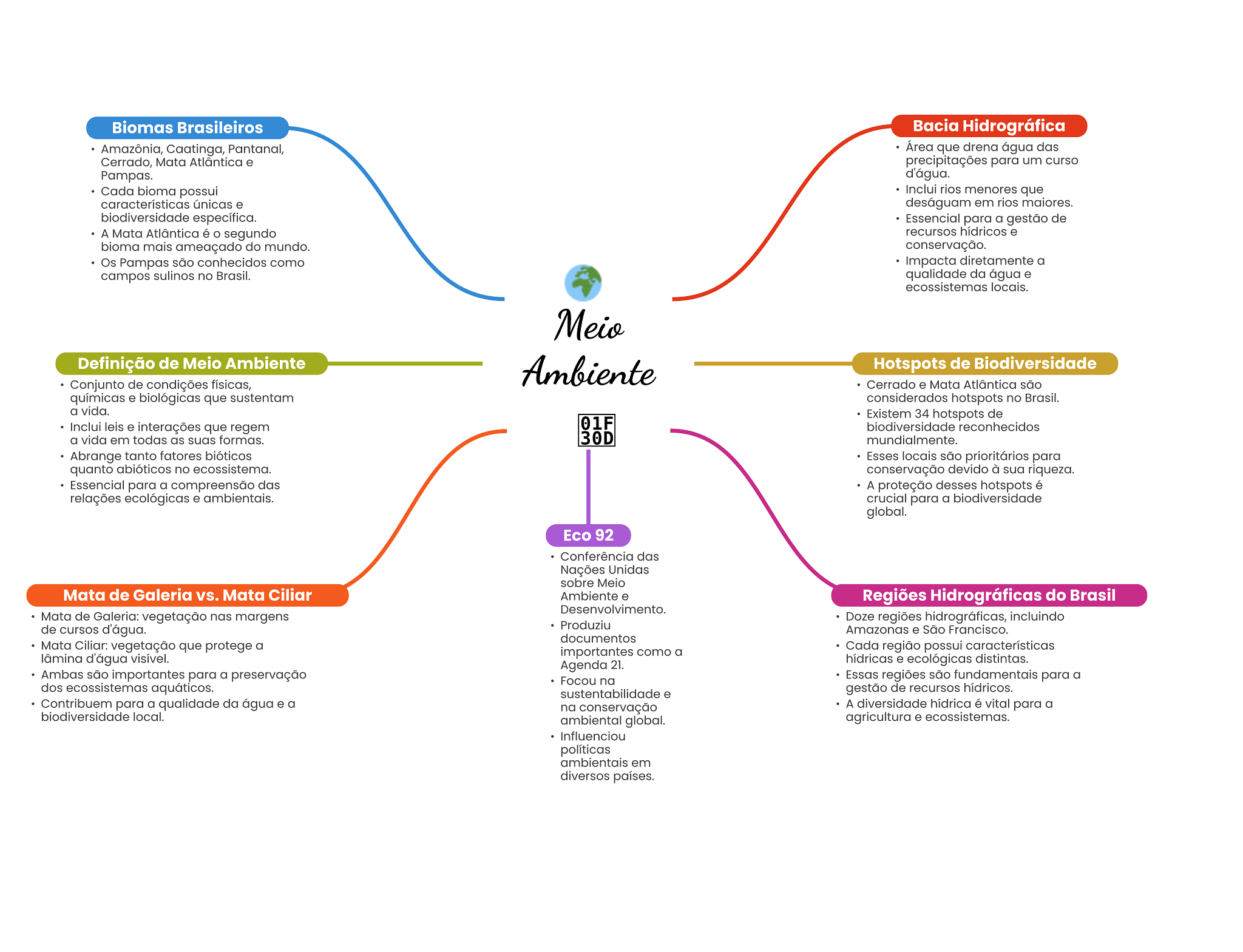 Biomas Brasileiros Bacia Hidrográfica Amazônia, Caatinga, Pantanal, Área que drena água das Cerrado, Mata Atlântica e precipitações para um curso Pampas. d'água. Cada bioma possui Inclui rios menores que características únicas e deságuam em rios maiores. biodiversidade específica. Essencial para a gestão de A Mata Atlântica é O segundo recursos hídricos e bioma mais ameaçado do mundo. conservação. Os Pampas são conhecidos como Impacta diretamente a campos sulinos no Brasil. qualidade da e ecossistemas locais. Meio Definição de Meio Ambiente Ambiente Hotspots de Biodiversidade Conjunto de condições físicas, Cerrado e Mata Atlântica são químicas e biológicas que sustentam considerados hotspots no Brasil. a vida. Existem 34 hotspots de Inclui leis e interações que regem 01F biodiversidade reconhecidos a vida em todas as suas formas. 30D mundialmente. Abrange tanto fatores bióticos Esses locais são prioritários para quanto abióticos no ecossistema. conservação devido à sua riqueza. Essencial para a compreensão das A proteção desses hotspots é relações ecológicas e ambientais. crucial para a biodiversidade global. Eco 92 Conferência das Nações Unidas sobre Meio Mata de Galeria vs. Mata Ciliar Ambiente e Regiões Hidrográficas do Brasil Desenvolvimento. Mata de Galeria: vegetação nas margens Doze regiões hidrográficas, incluindo de cursos d'água. Produziu Amazonas e São Francisco. documentos Mata Ciliar: vegetação que protege a importantes como a Cada região possui características lâmina d'água visível. Agenda 21. hídricas e ecológicas distintas. Ambas são importantes para a preservação Focou na Essas regiões são fundamentais para a dos ecossistemas aquáticos. sustentabilidade e gestão de recursos hídricos. Contribuem para a qualidade da água e a na conservação A diversidade hídrica é vital para a biodiversidade local. ambiental global. agricultura e ecossistemas. Influenciou políticas ambientais em diversos países.